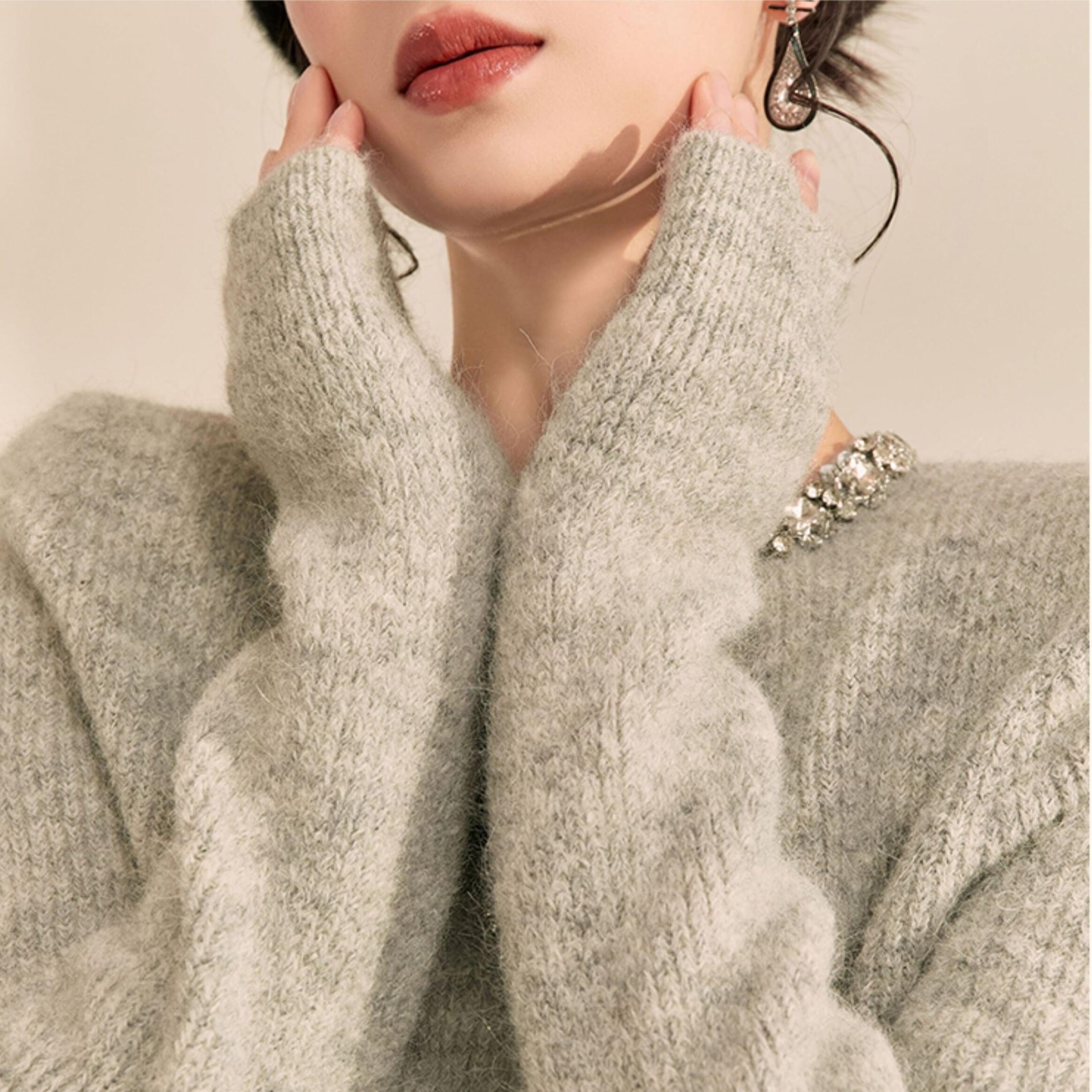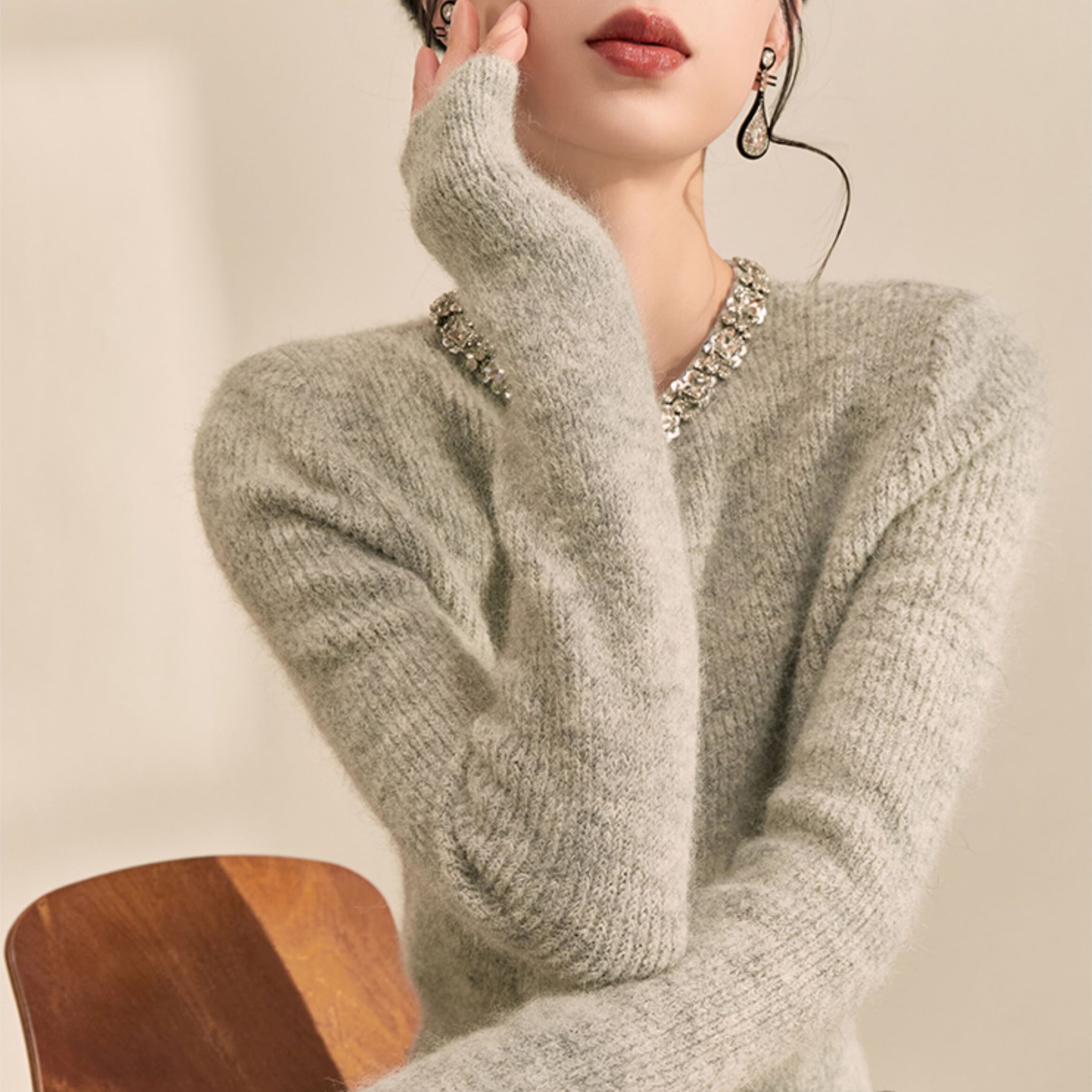クルーネックに沿ってあしらわれたビジューが、顔周りを華やかに演出します。
