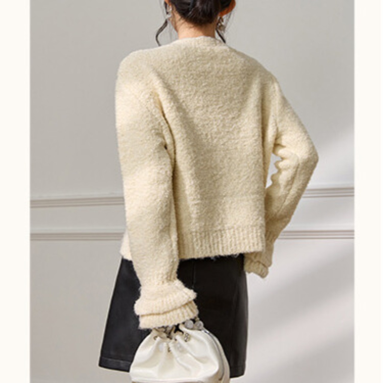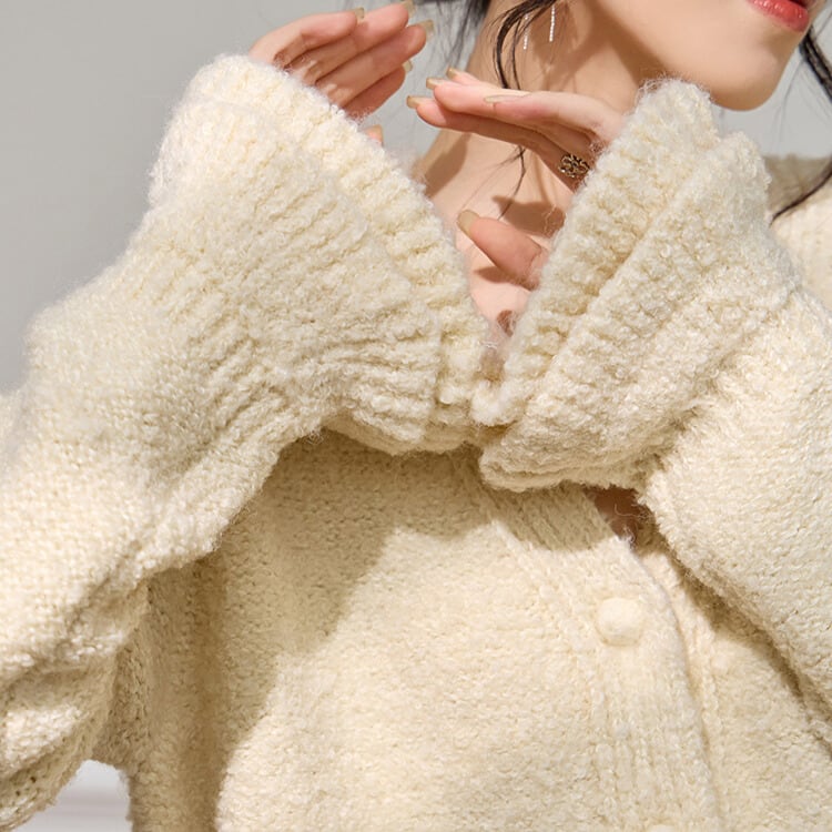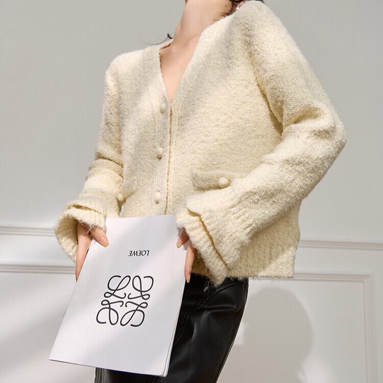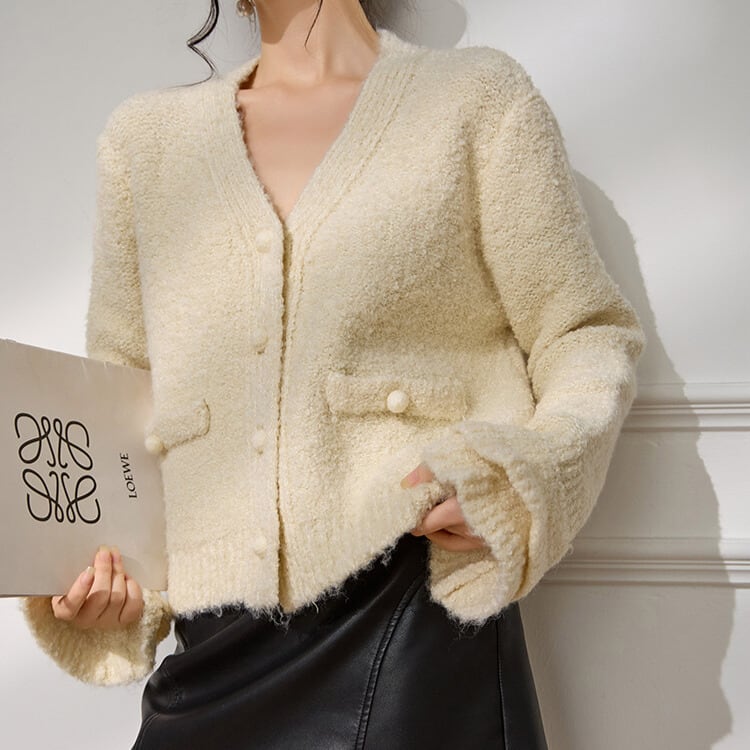 Vネックがデコルテを美しく見せてくれるニットカーディガン。