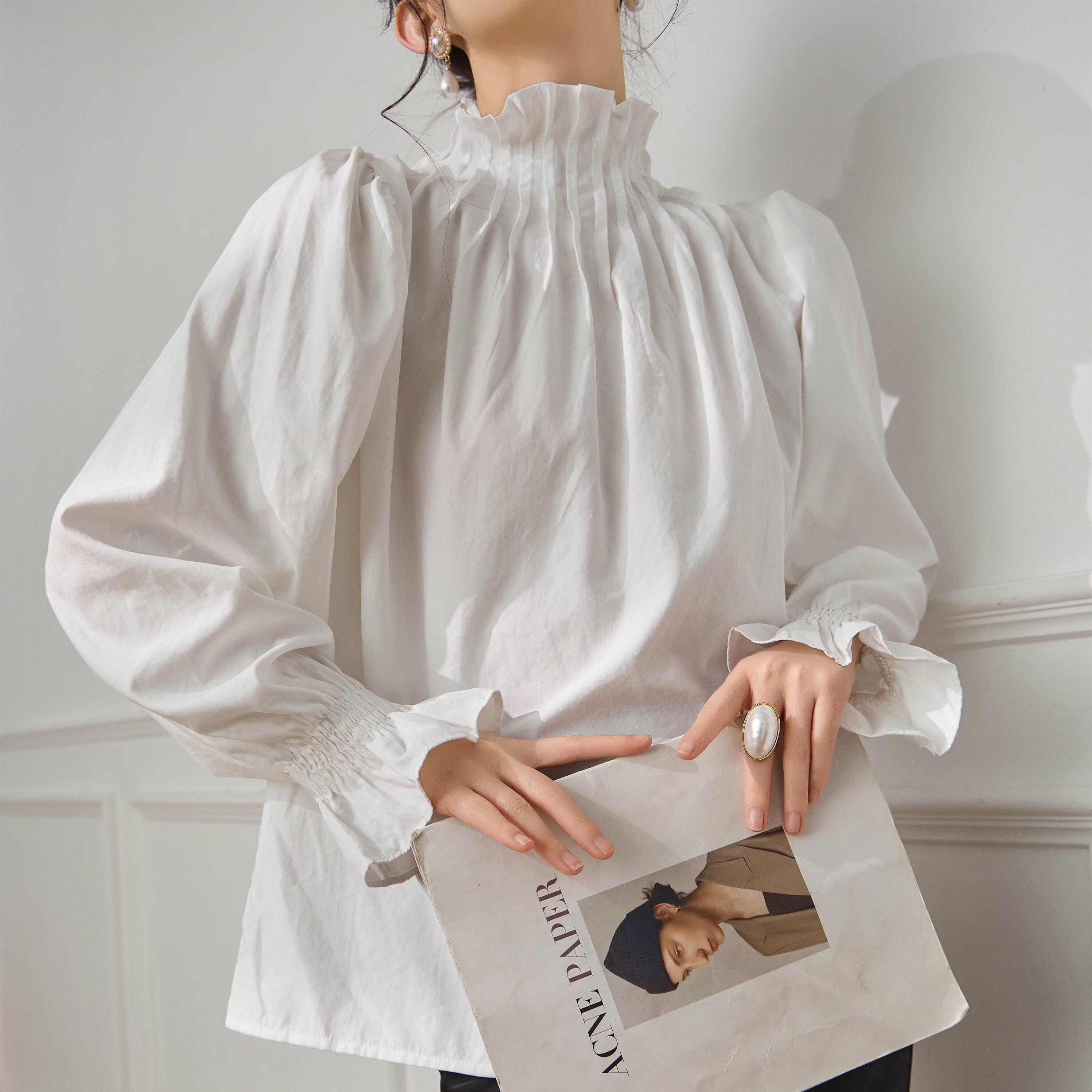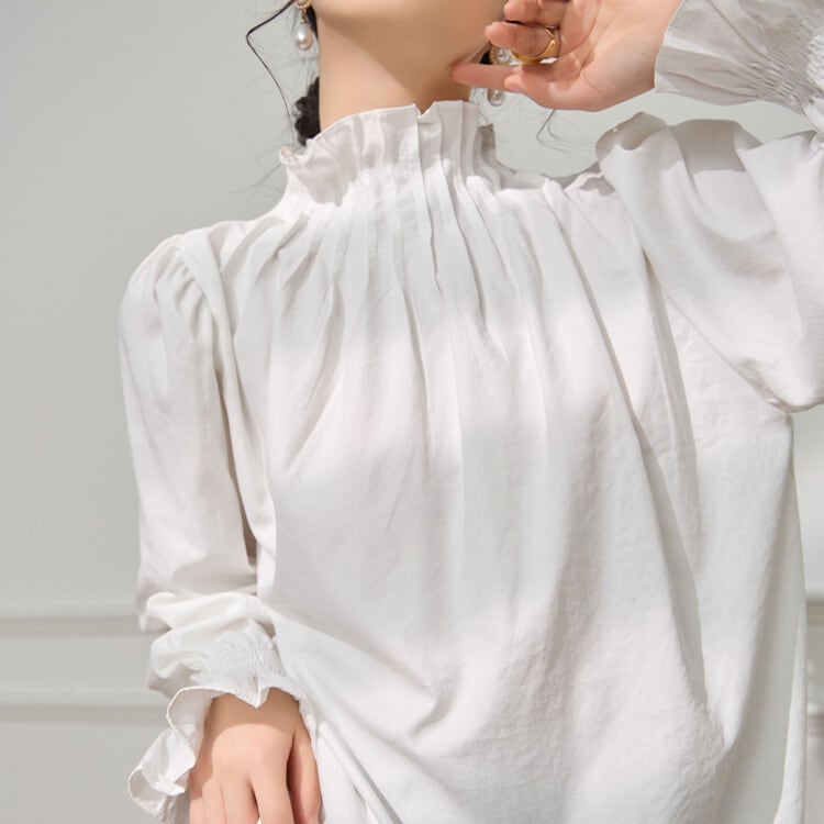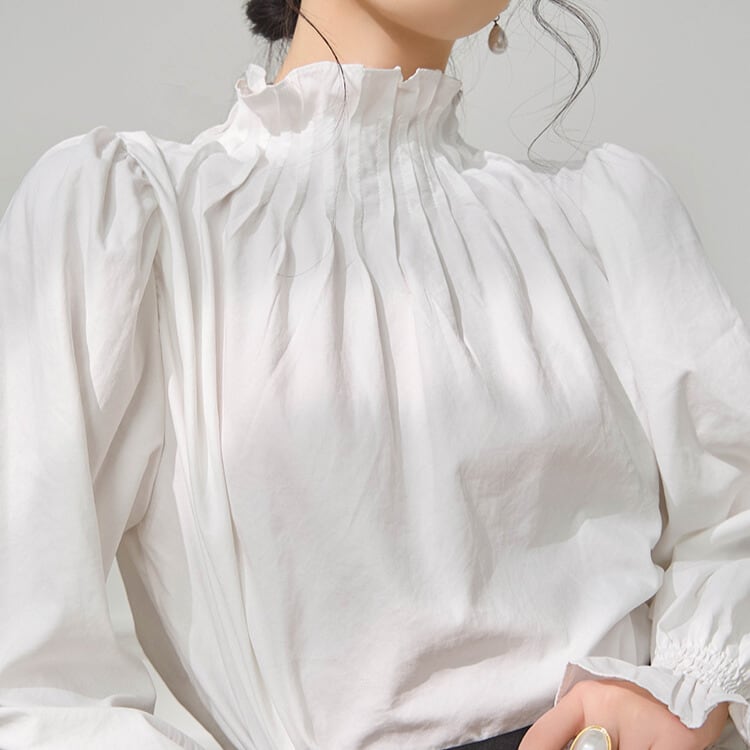 シンプルなデザインながらも、細部にこだわったブラウスです。