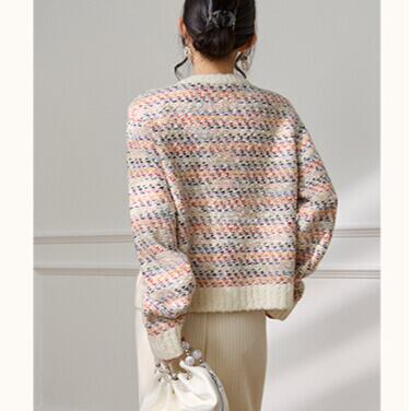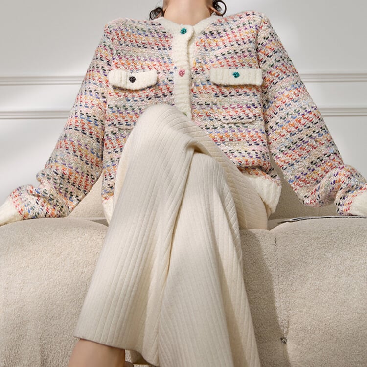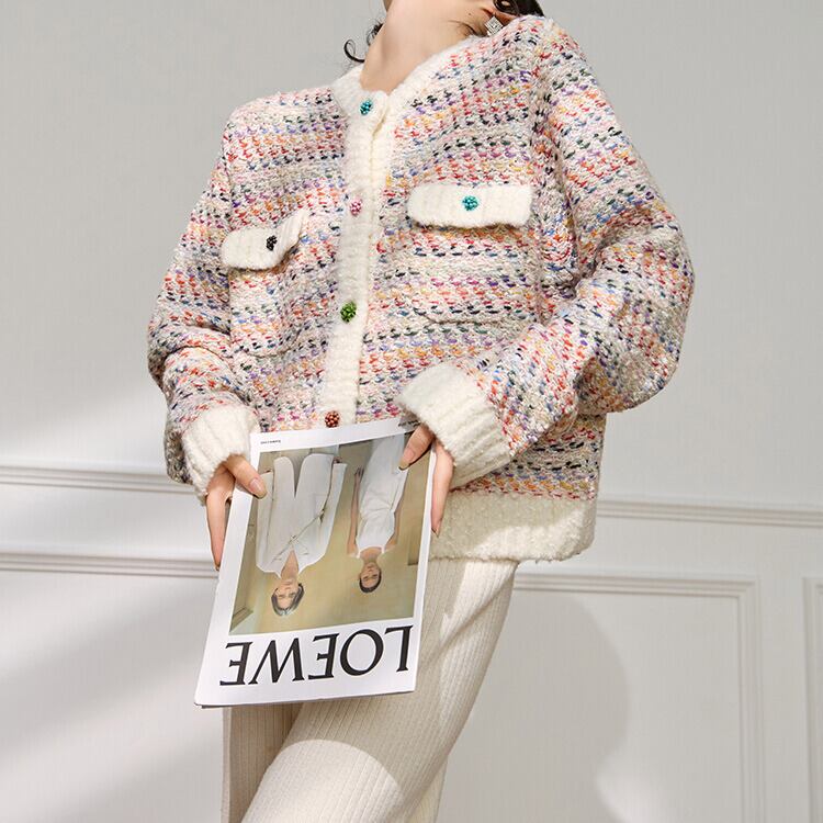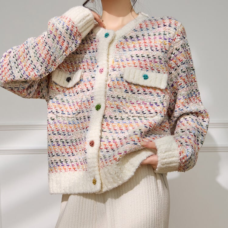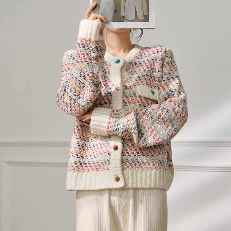ノーカラーデザインが、首元をすっきりと見せてくれるニットカーディガン。