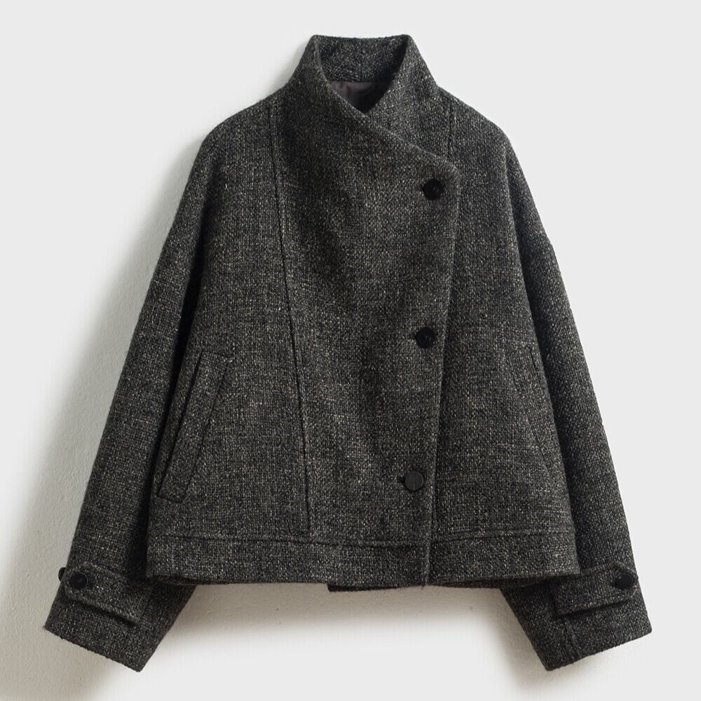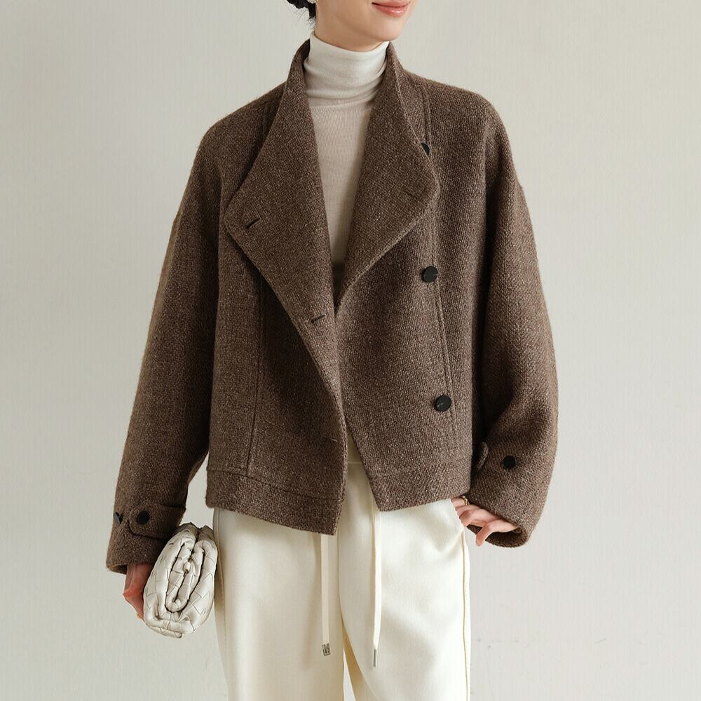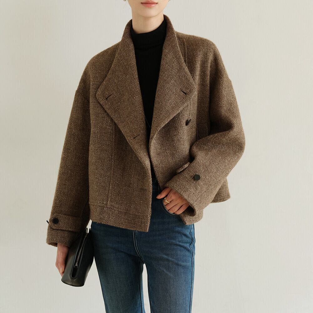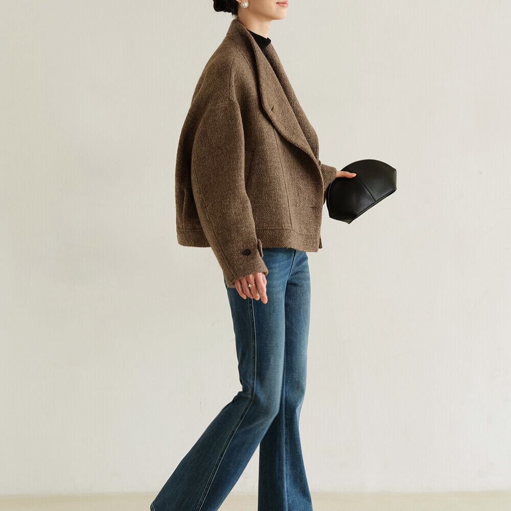 オープンカラーとショート丈が洗練された印象を与えるジャケットです。