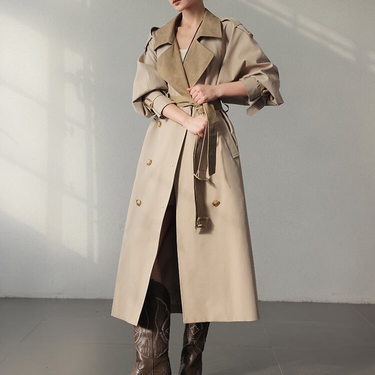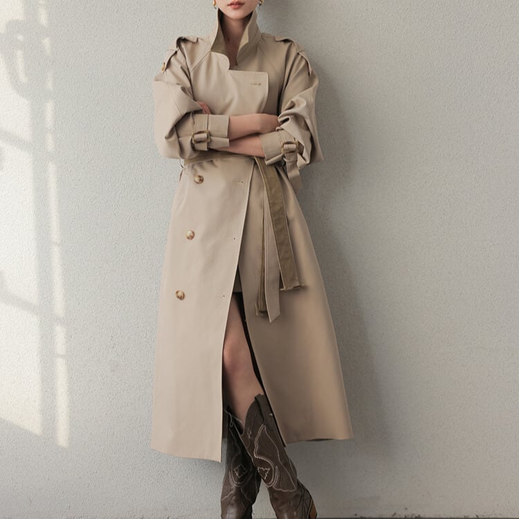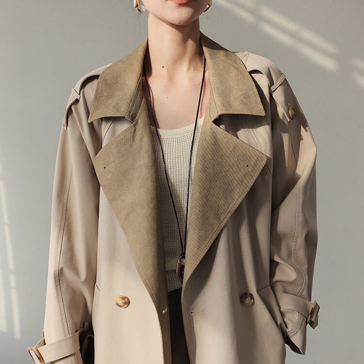 バイカラーデザインが目を引くトレンチコート。