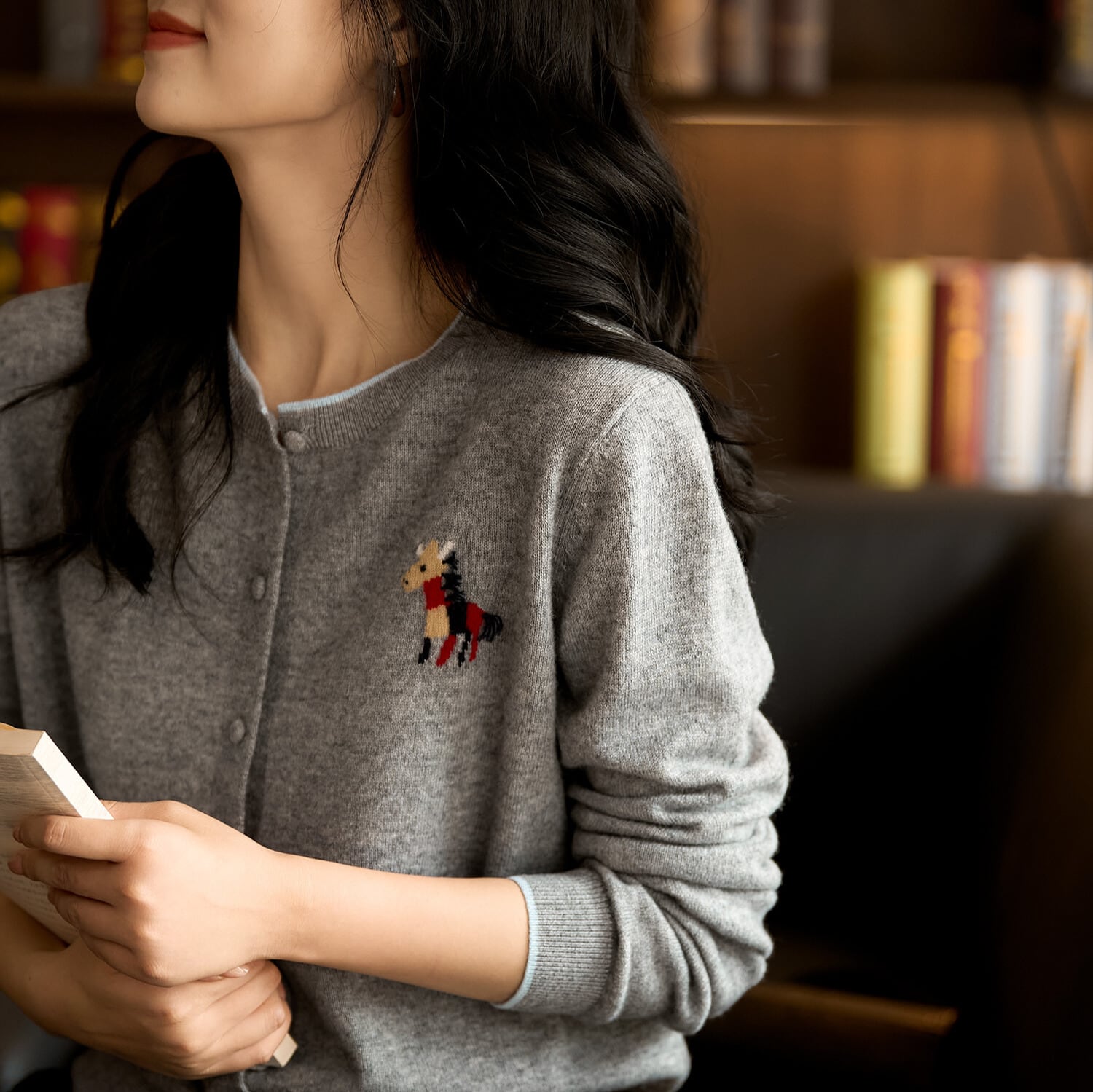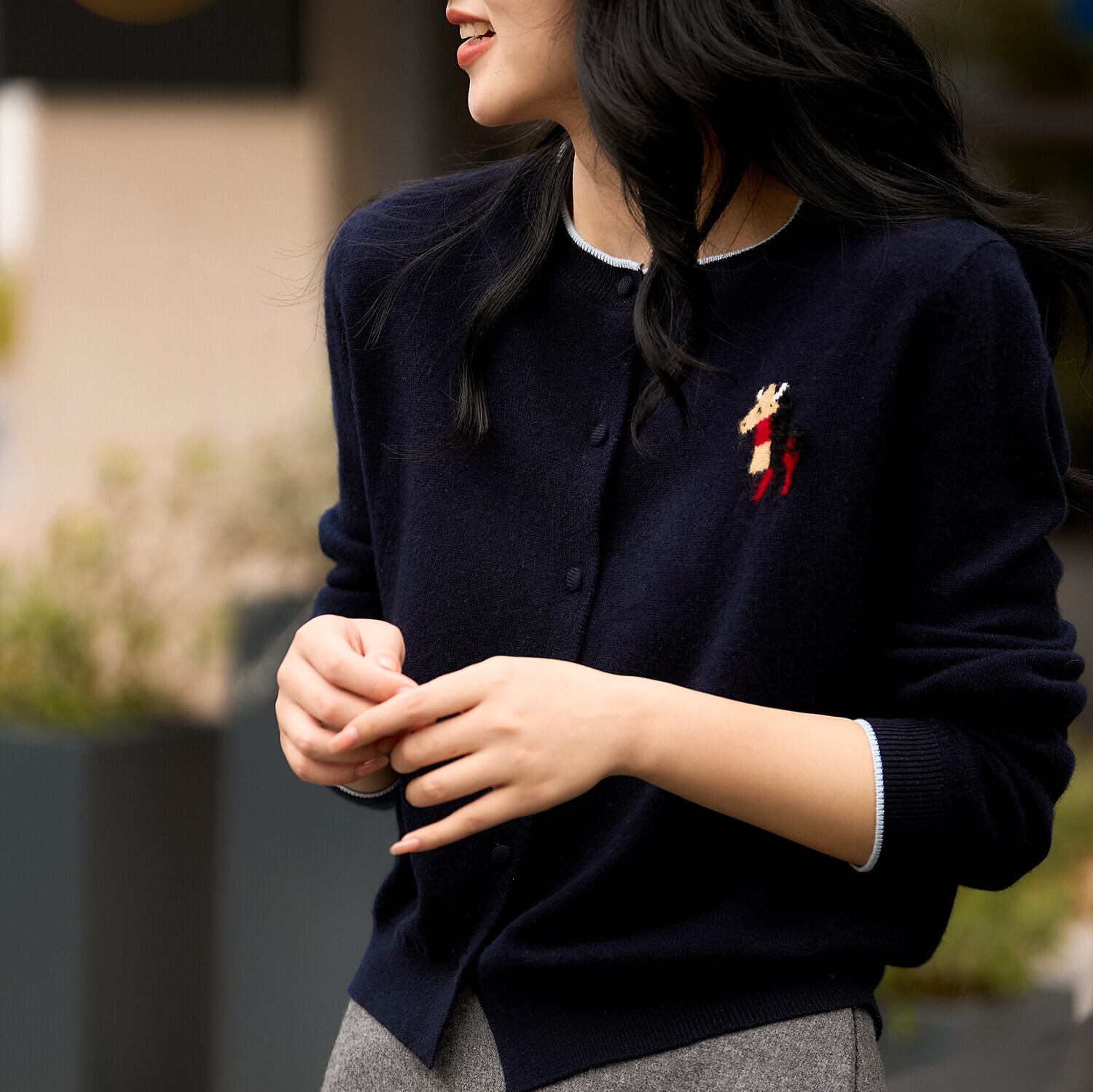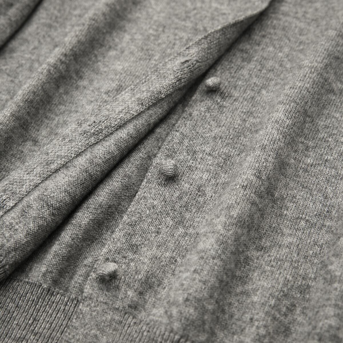シンプルなクルーネックのデザインで、どんな装いにも合わせやすいカーディガンです。