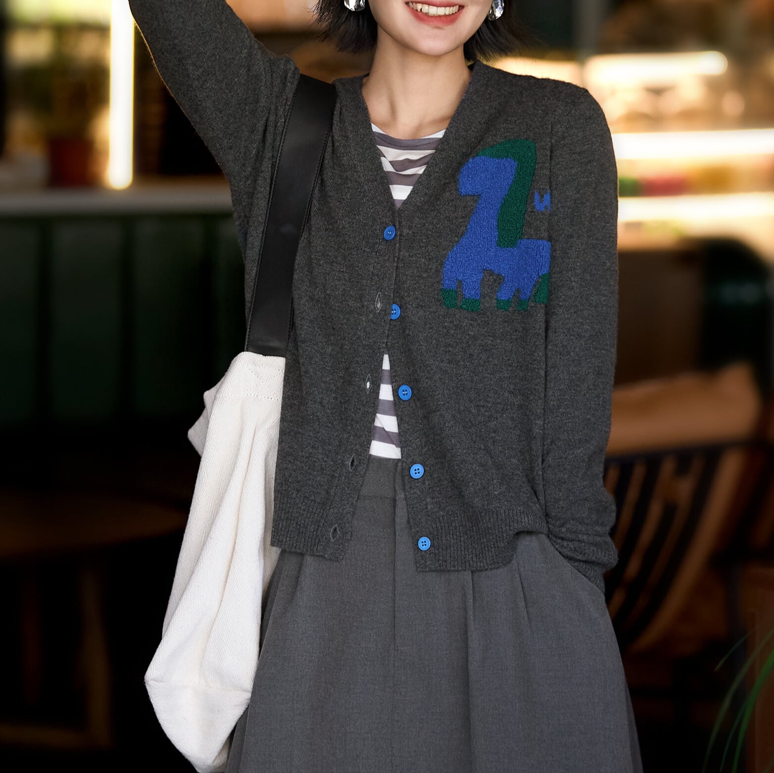 落ち着いた色味の中に、アニマル柄がアクセントとなり、遊び心のある着こなしを演出します。