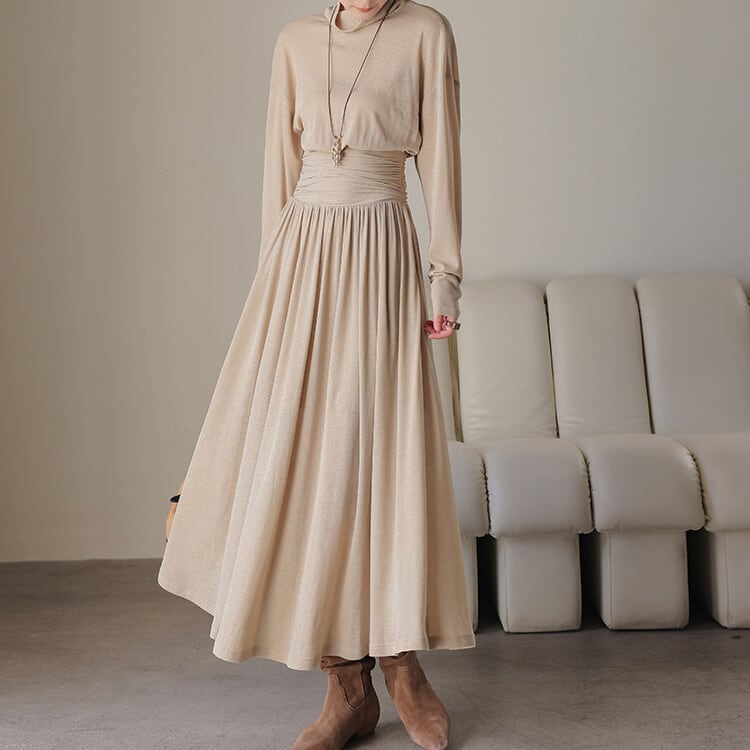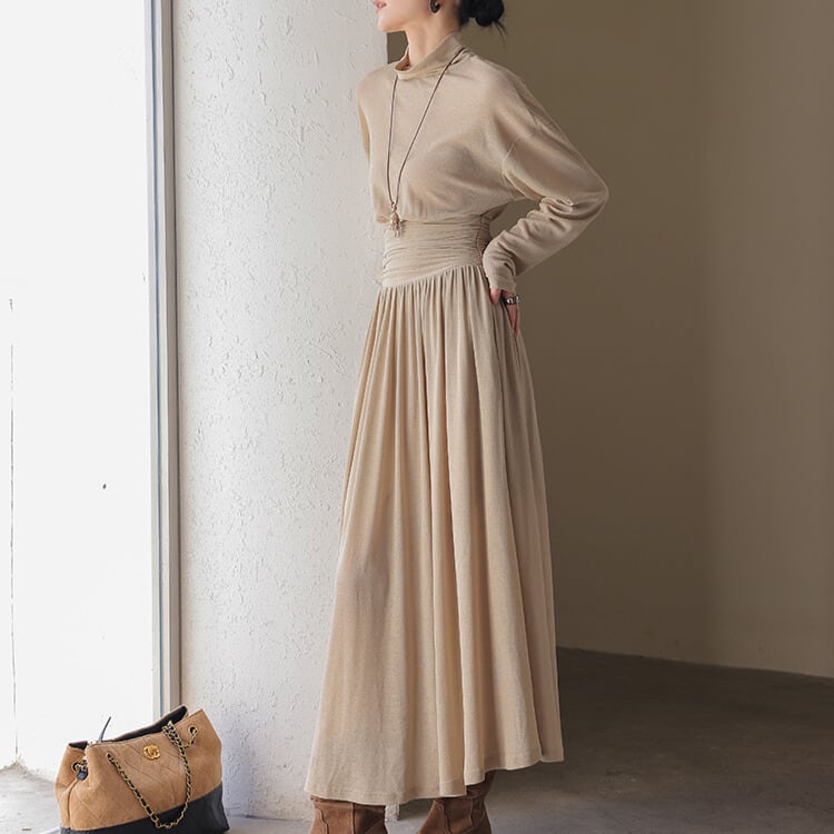 ウエストのギャザーがポイントのロングスリーブワンピース。