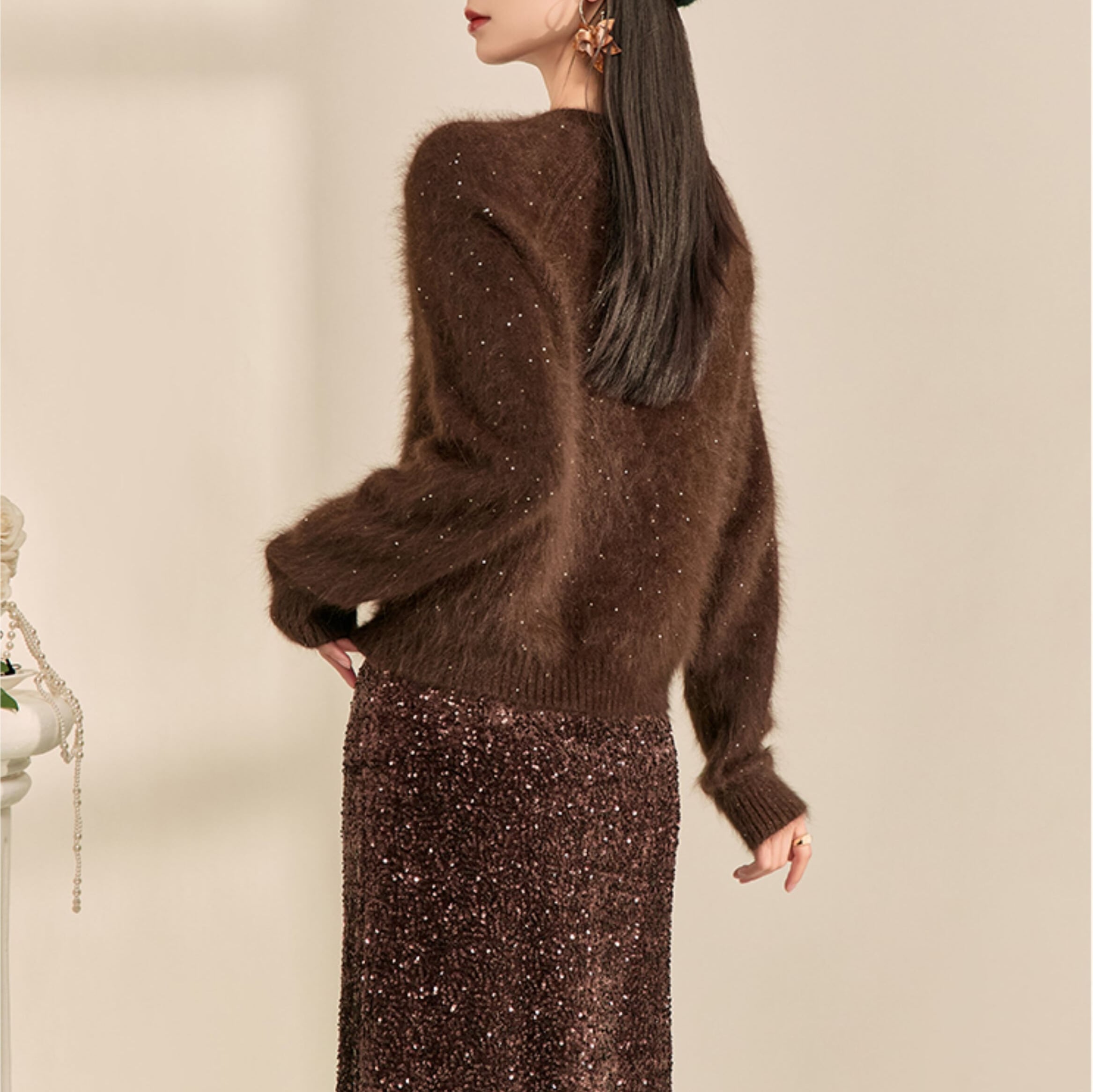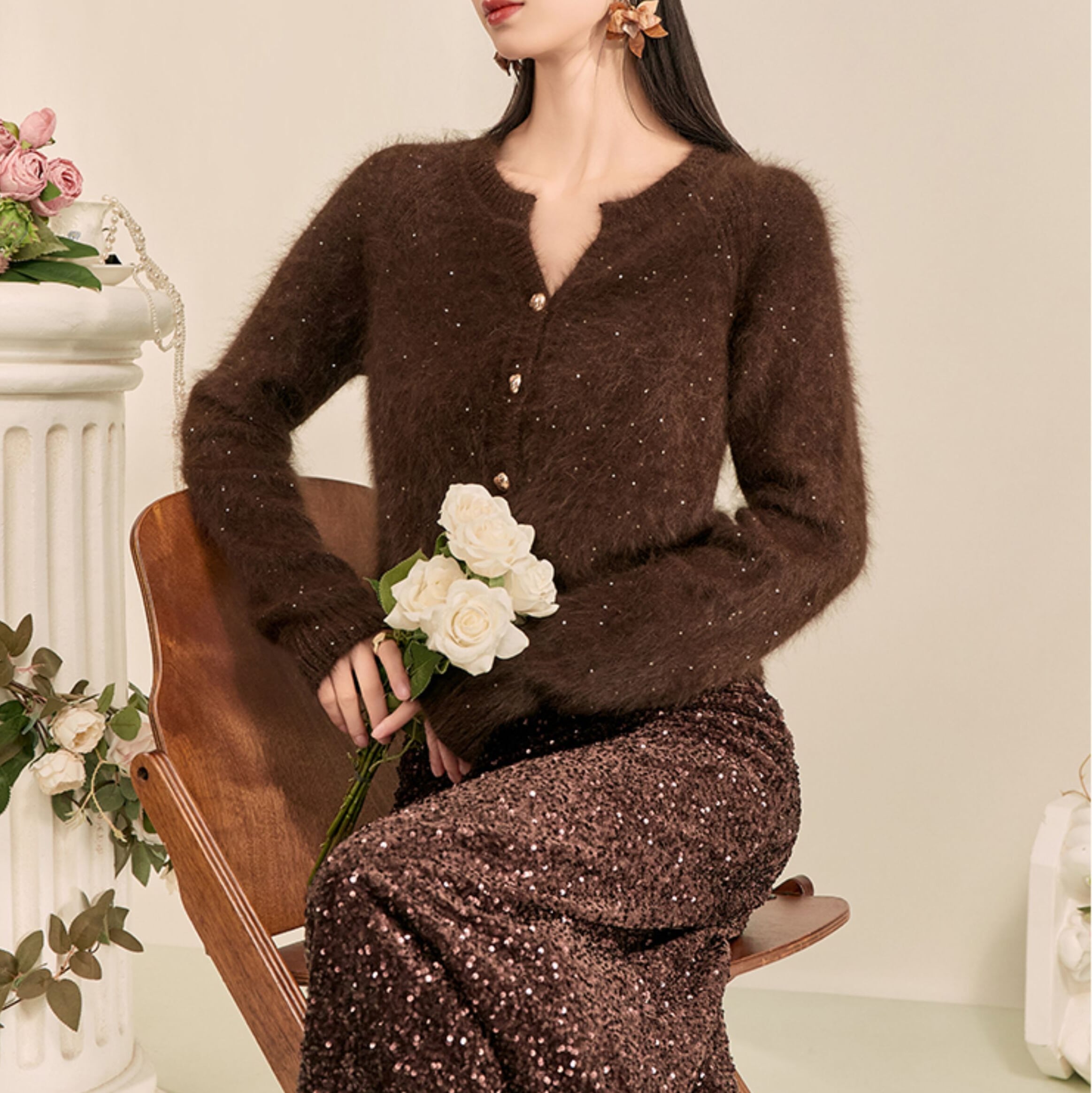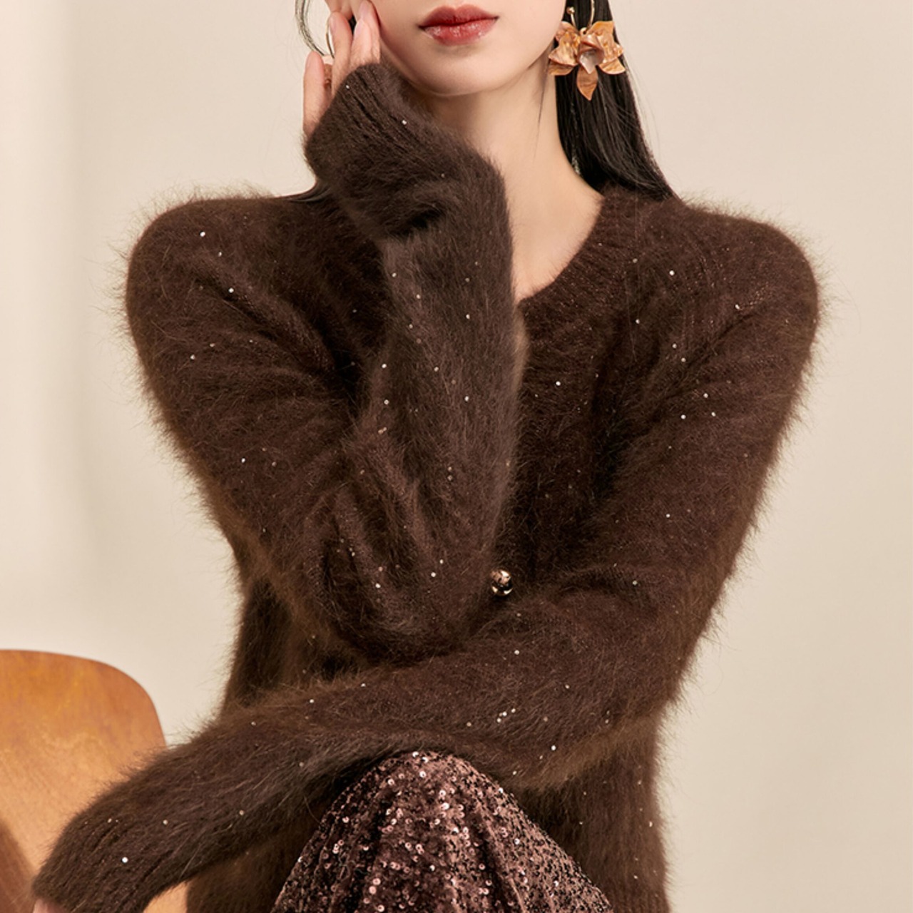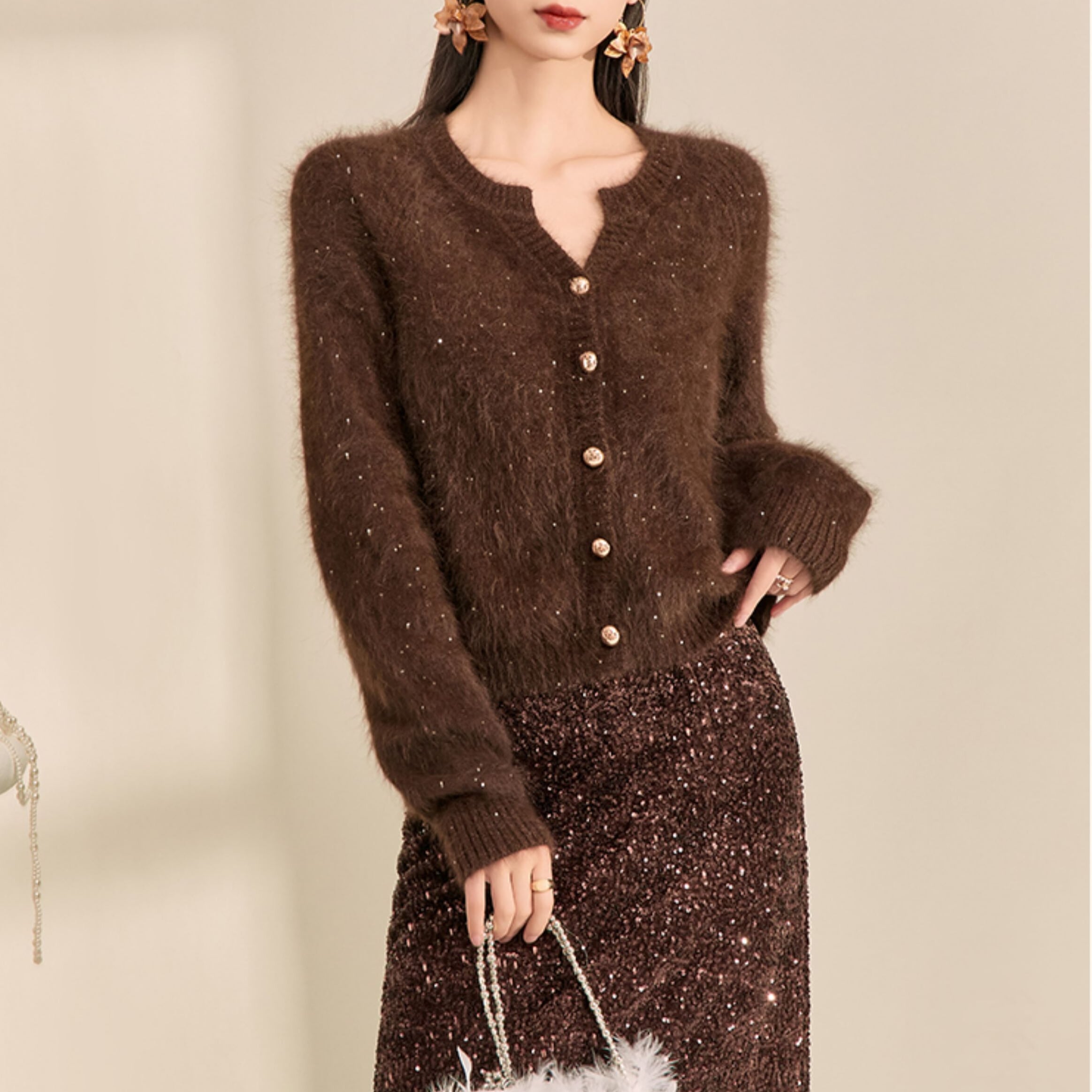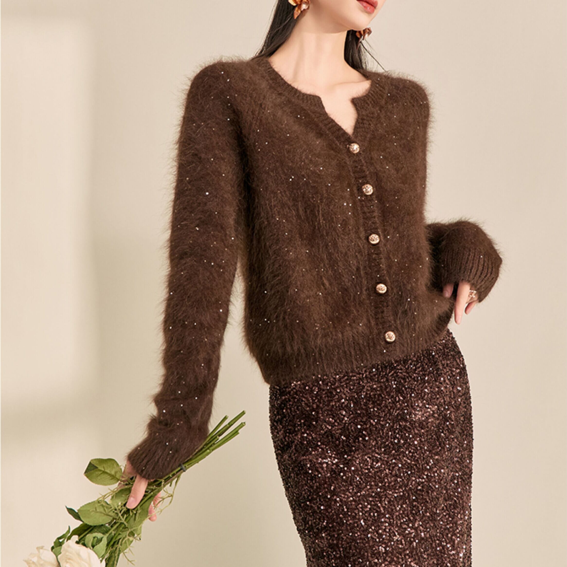 Vネックのデザインは、デコルテを美しく見せ、アクセサリーとの相性も抜群。