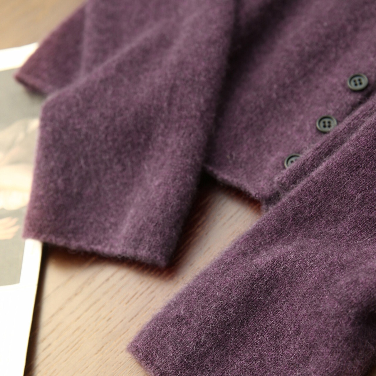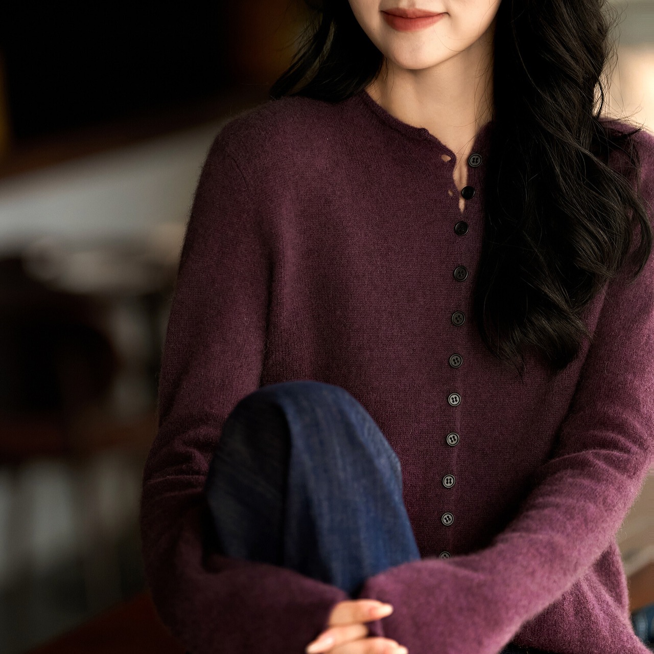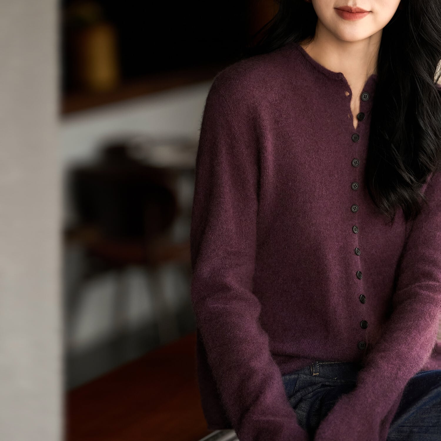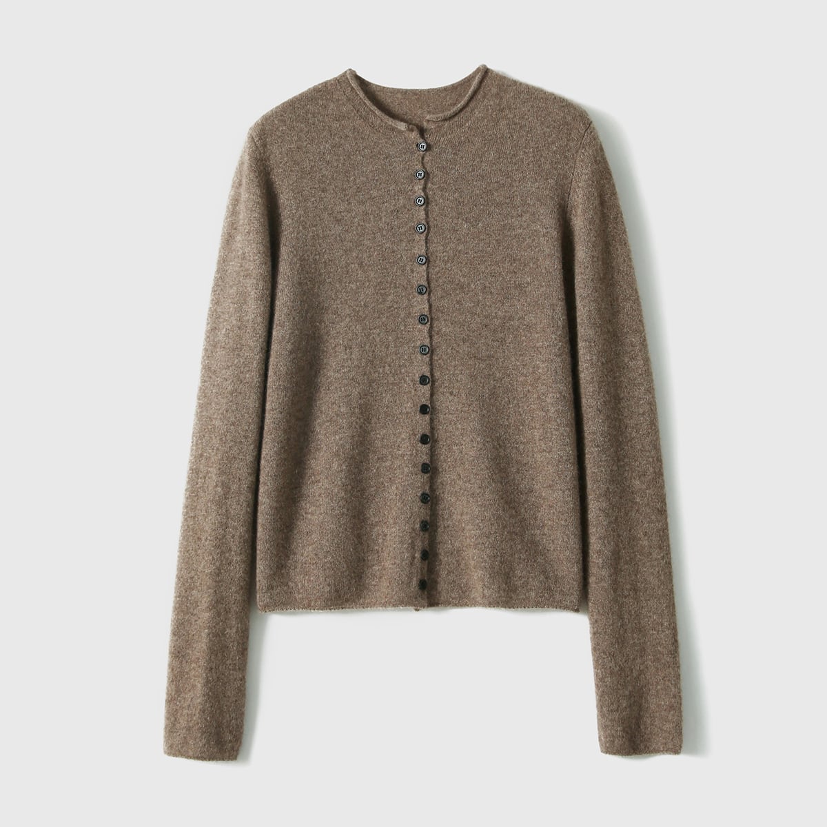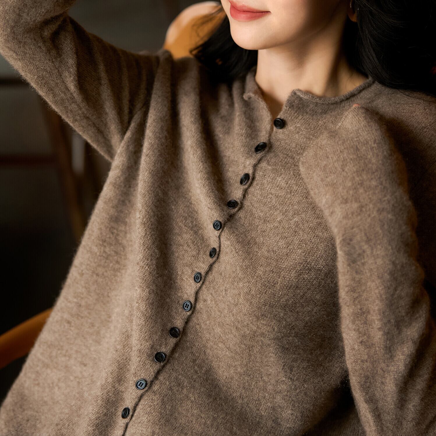 暖かみのあるヤクウールを使用した、ボタンフロントニットカーディガン。