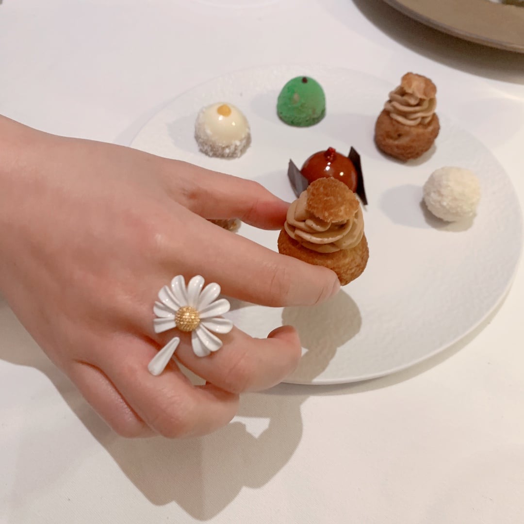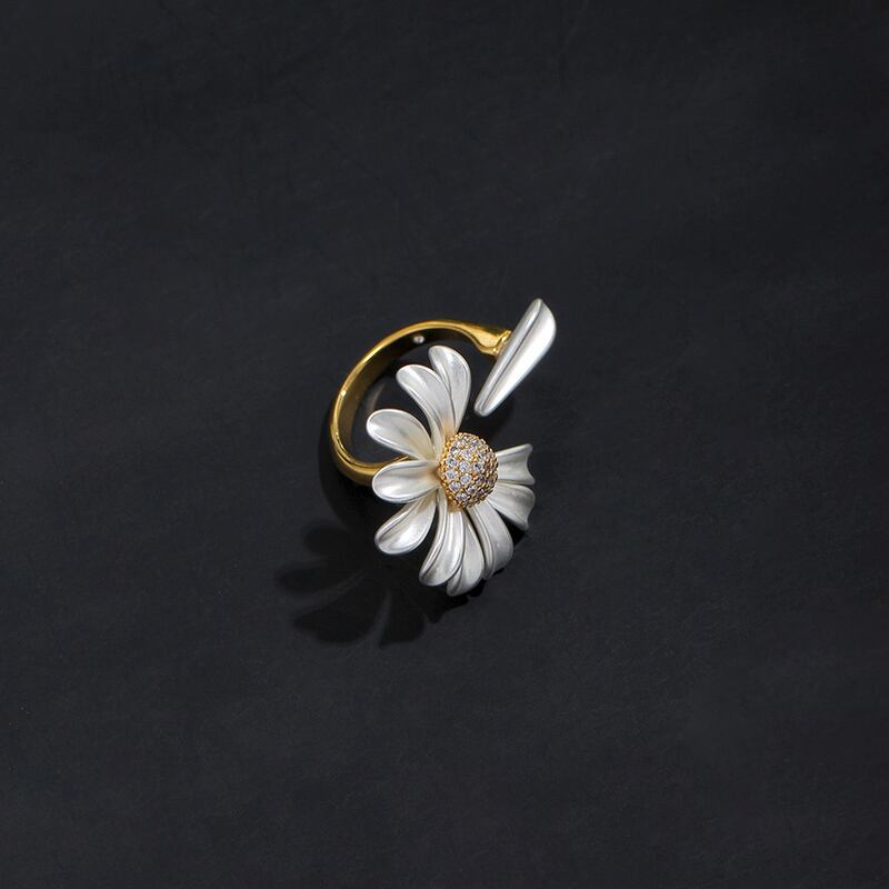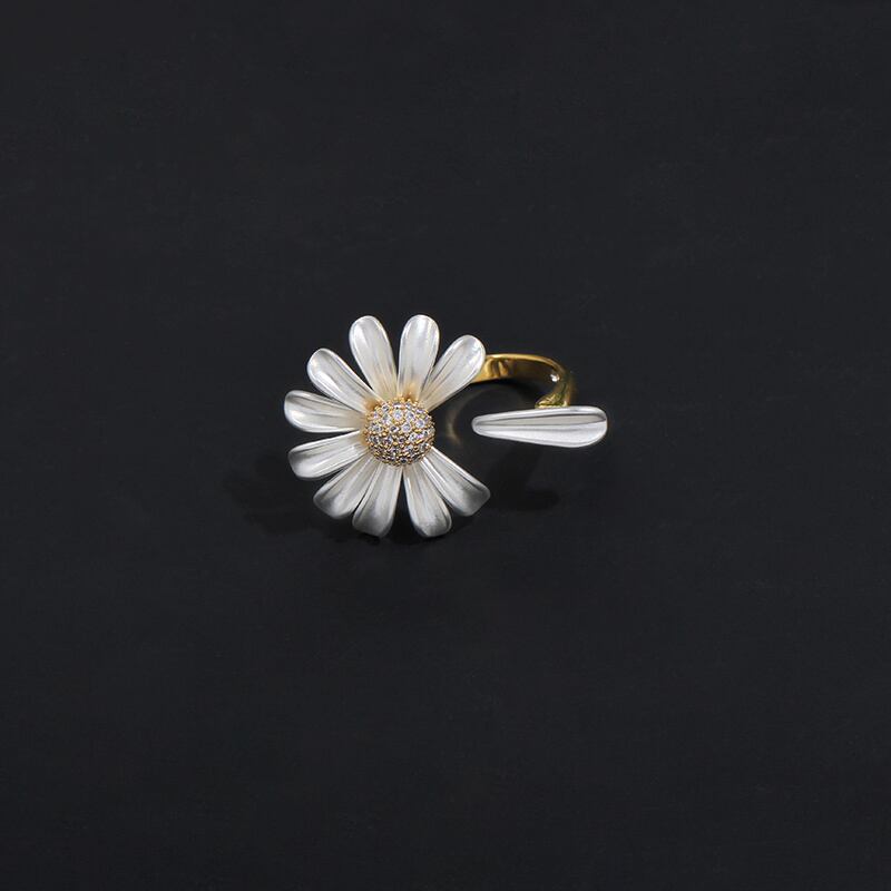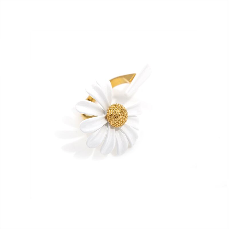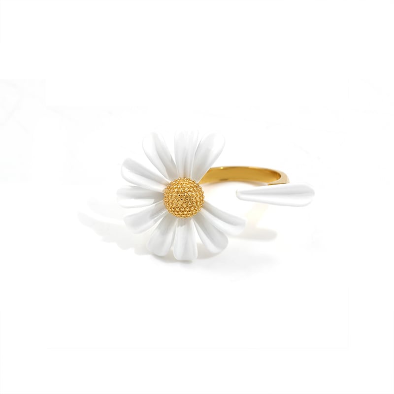 デイジーモチーフが印象的なオープンリング。他のアクセサリーとの重ね付けもしやすく、自分らしいアレンジを楽しめます。手元にさりげない個性を加え、日々のコーディネートをさらに魅力的に彩ります。