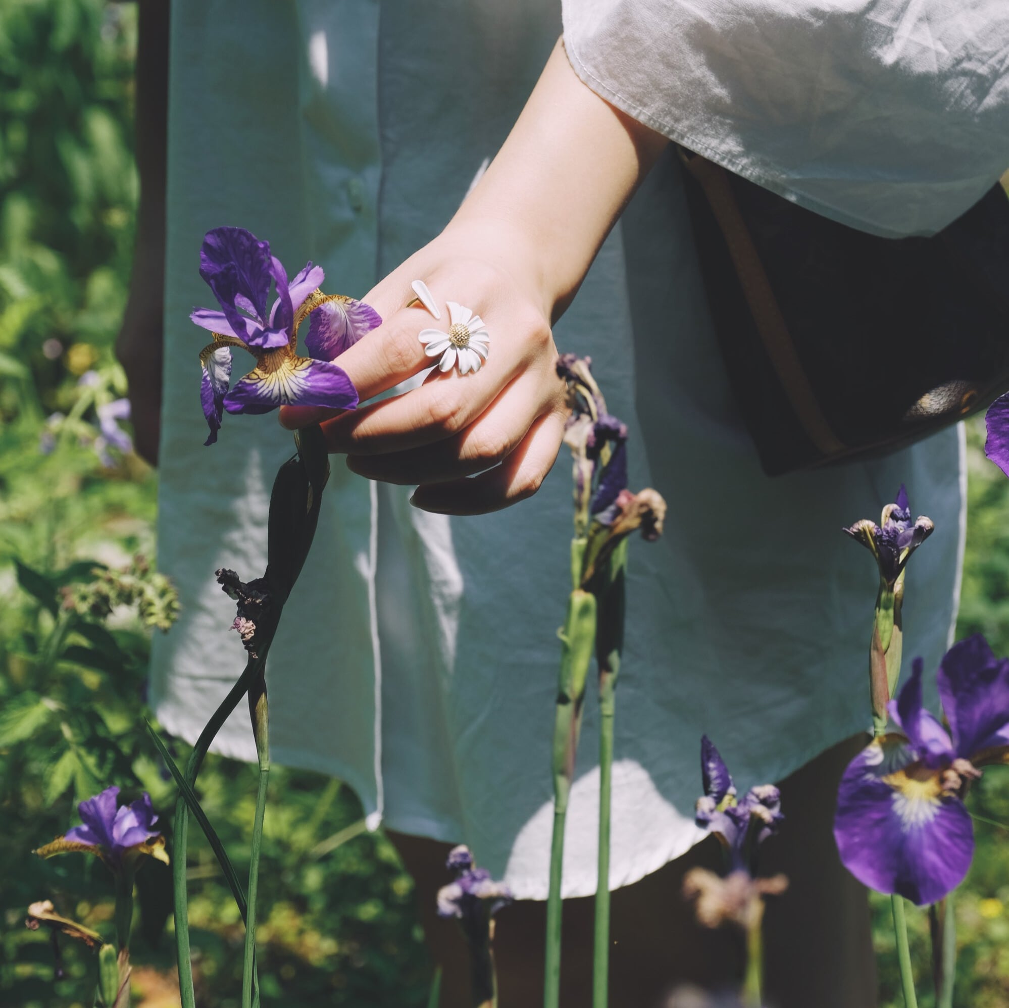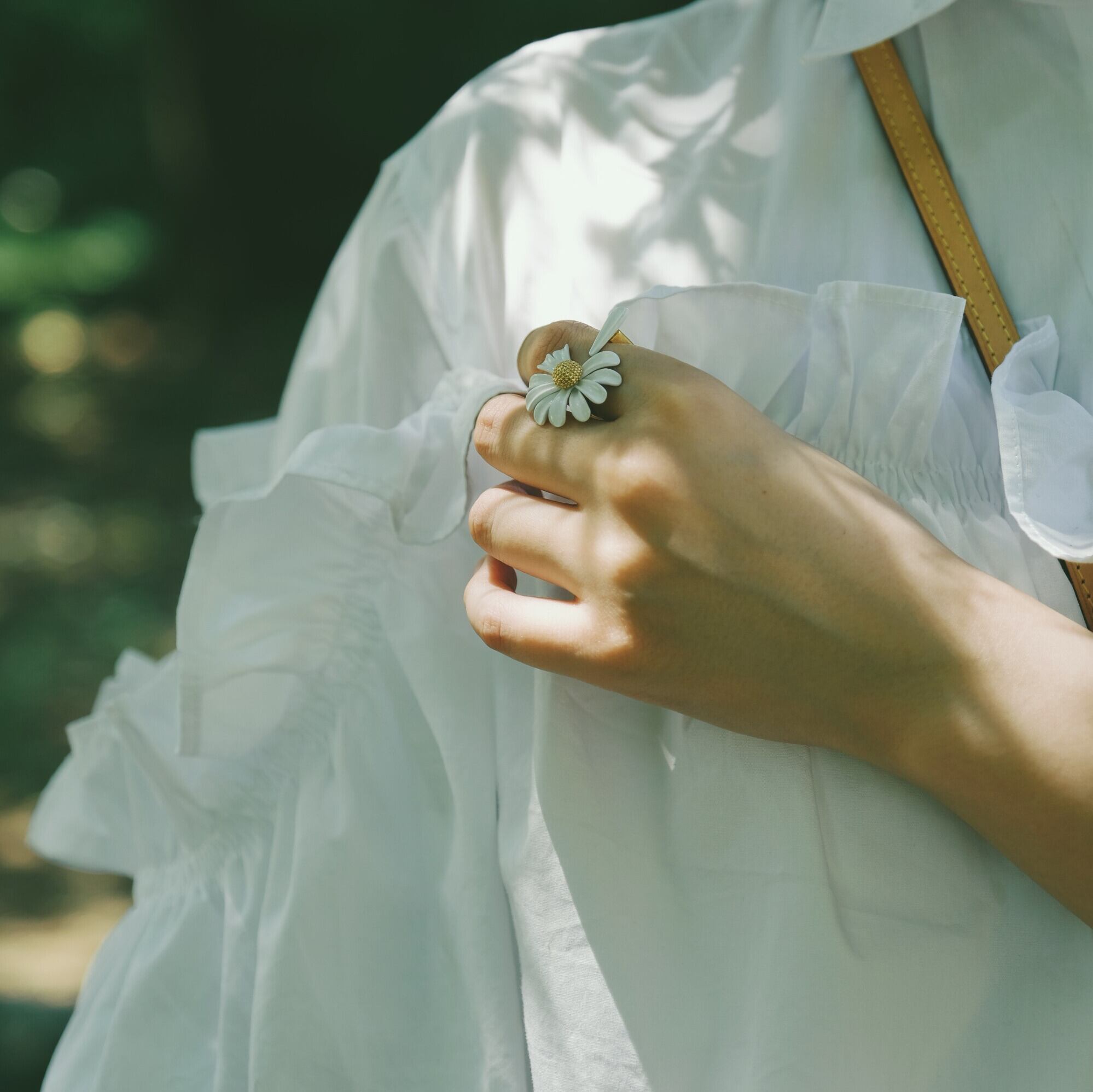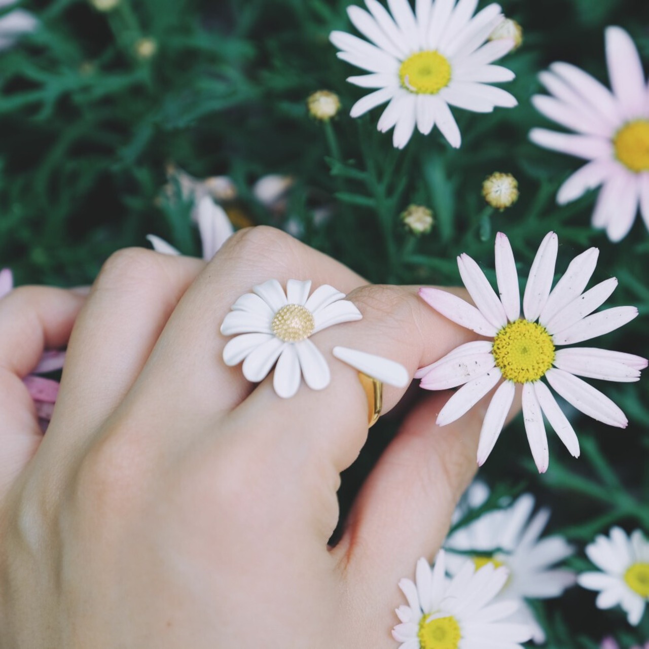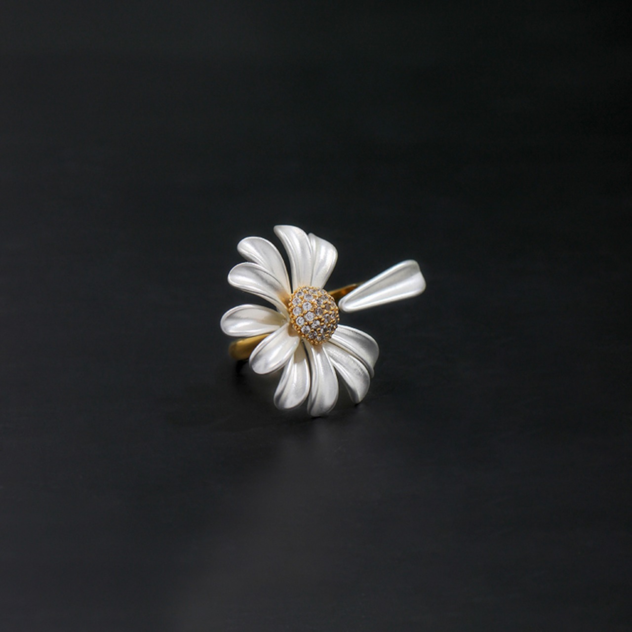 デイジーモチーフが印象的なオープンリング。他のアクセサリーとの重ね付けもしやすく、自分らしいアレンジを楽しめます。手元にさりげない個性を加え、日々のコーディネートをさらに魅力的に彩ります。