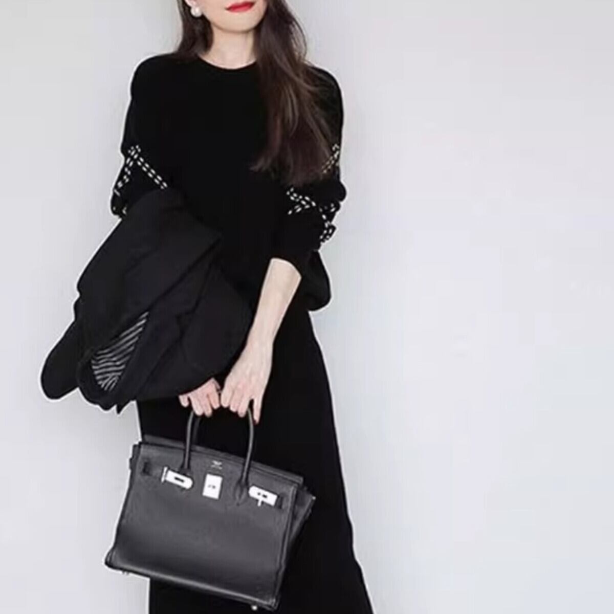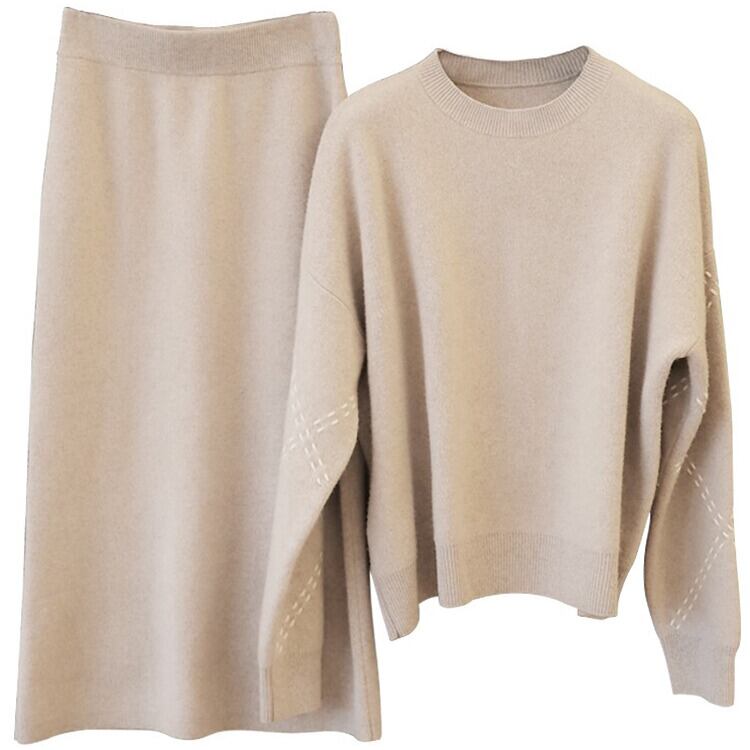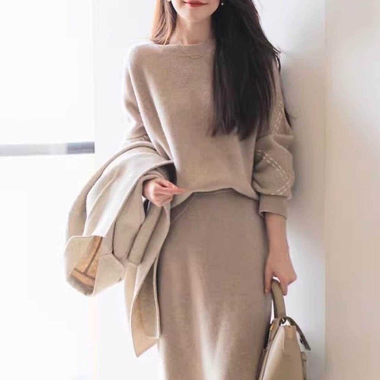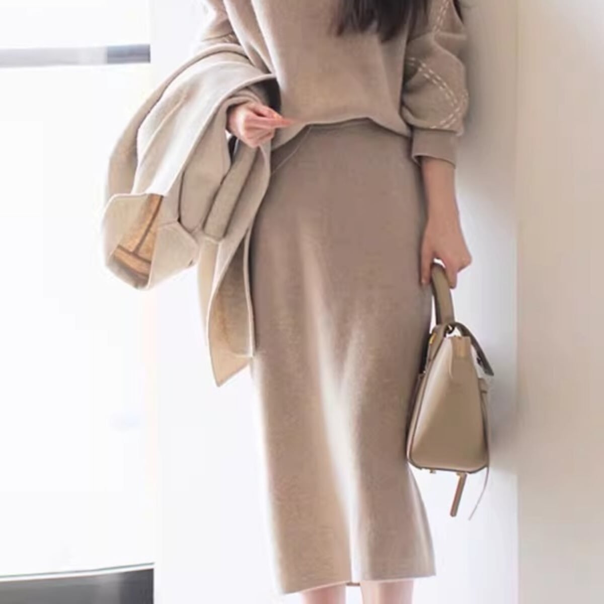 上品な印象を演出するニットセットアップ。トップスとスカートの組み合わせで、簡単に洗練されたスタイリングが完成します。