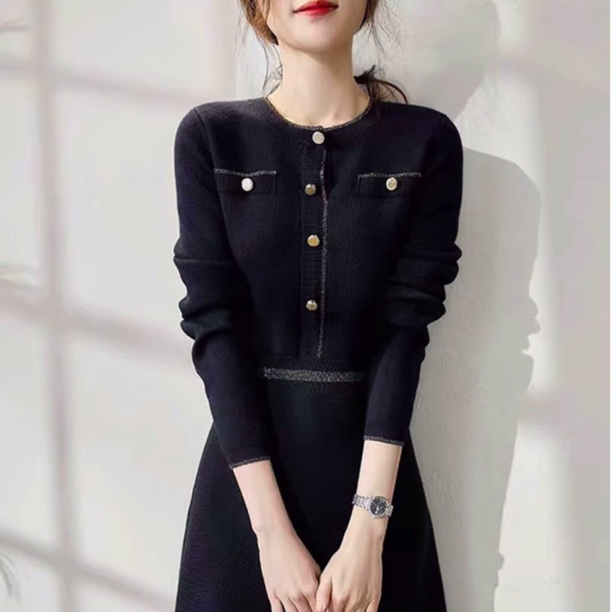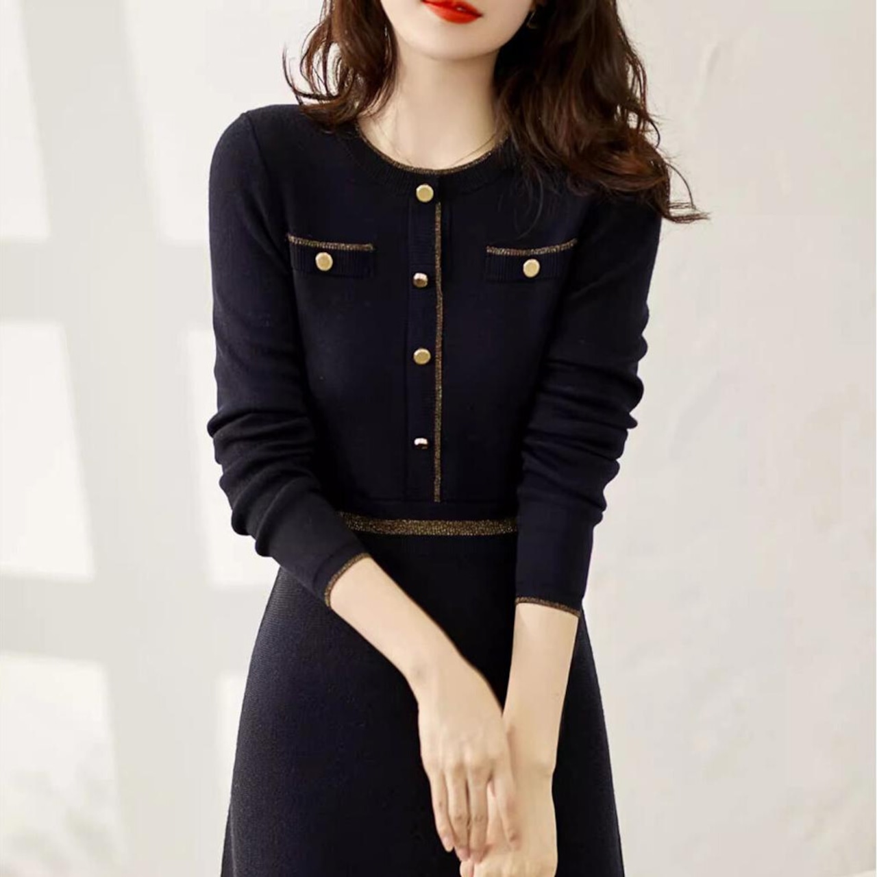 フロントボタンがポイントのニットワンピース。