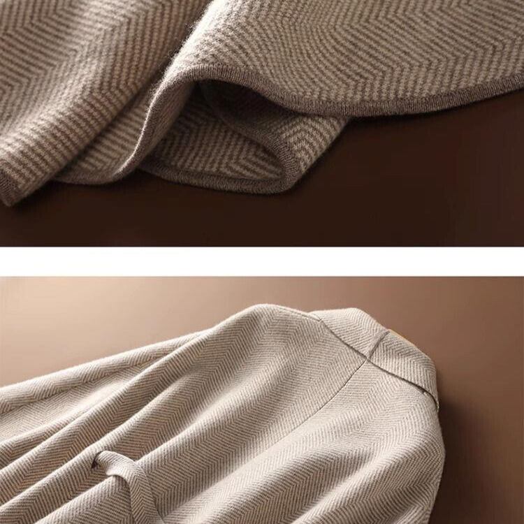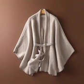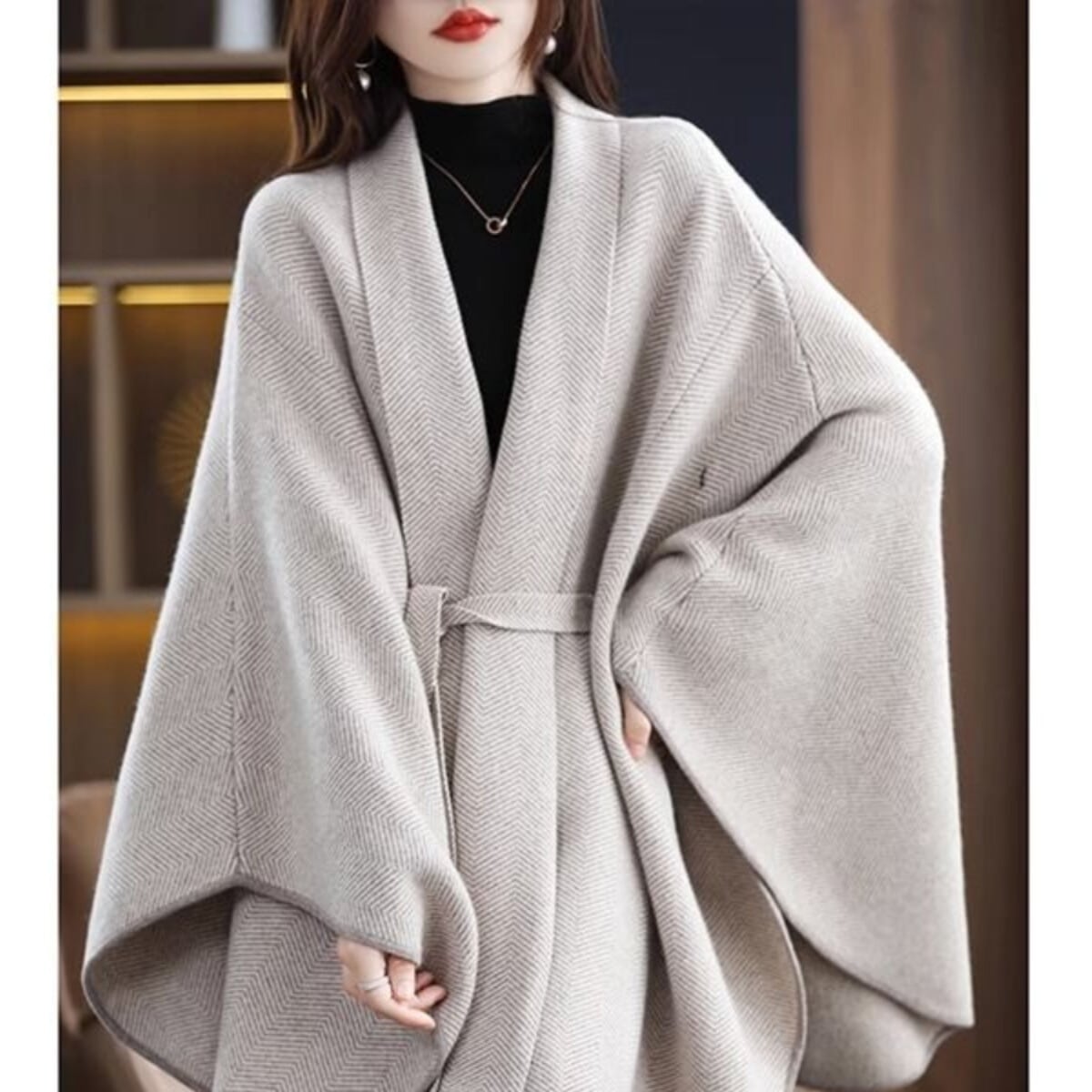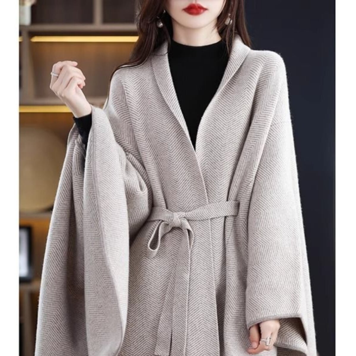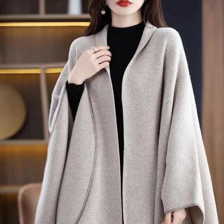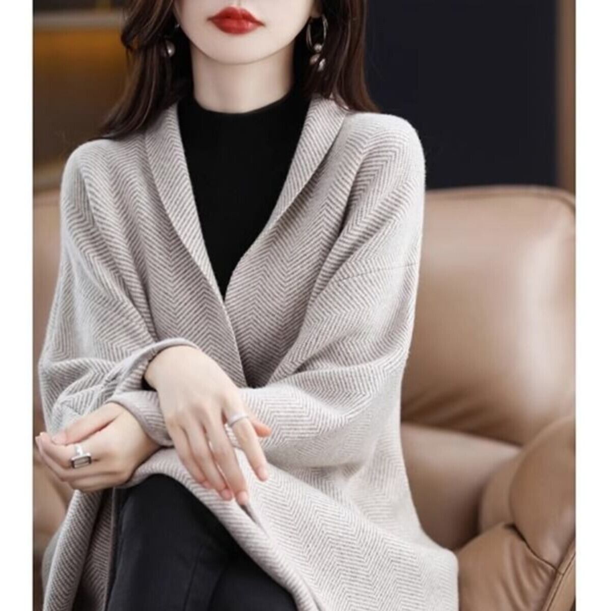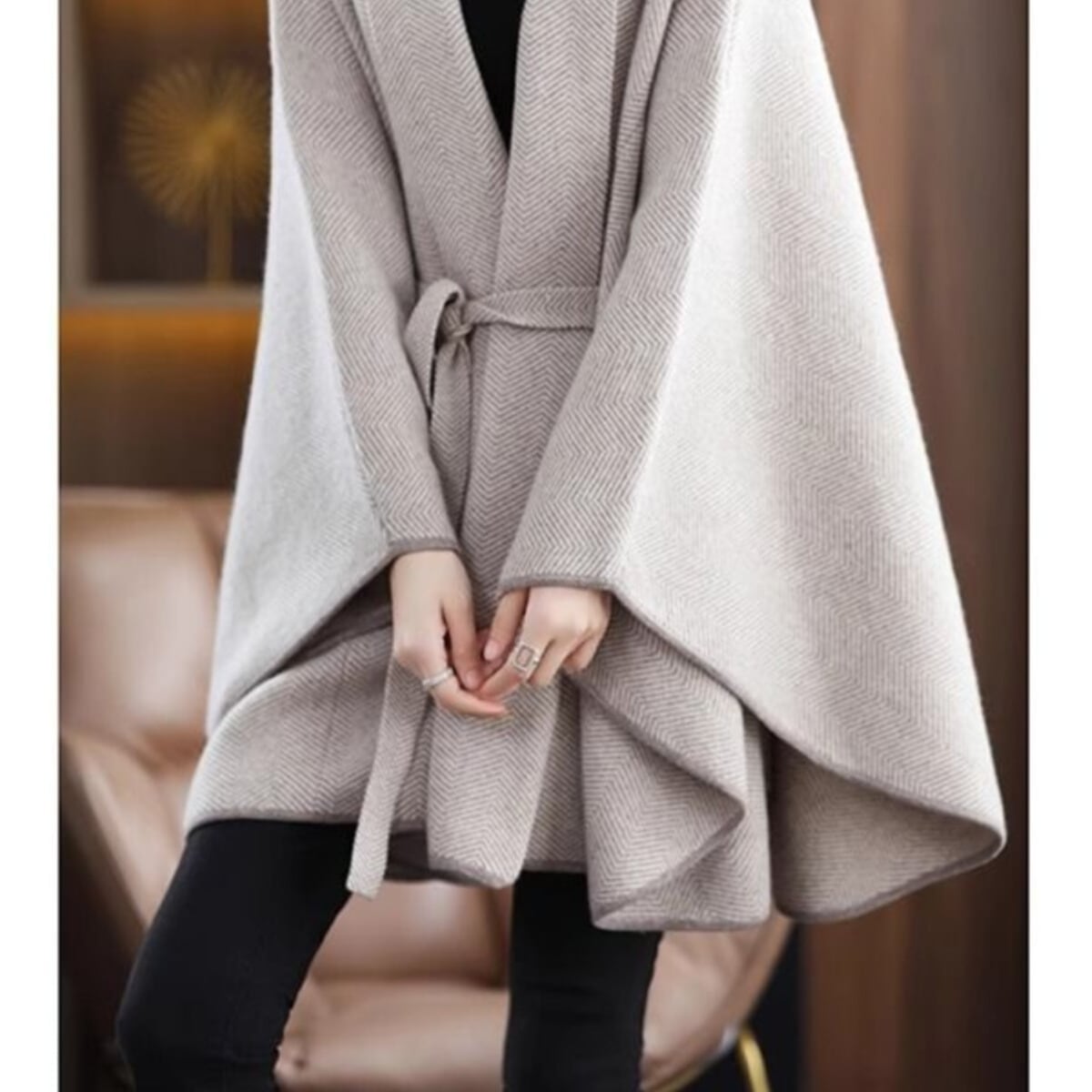 ゆったりとしたシルエットで体型をカバーしつつ、洗練された印象を与えるニットポンチョです。