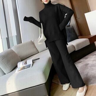 タートルネックのトップスとワイドパンツの組み合わせで、リラックス感がありながらも、洗練された印象を与えます。