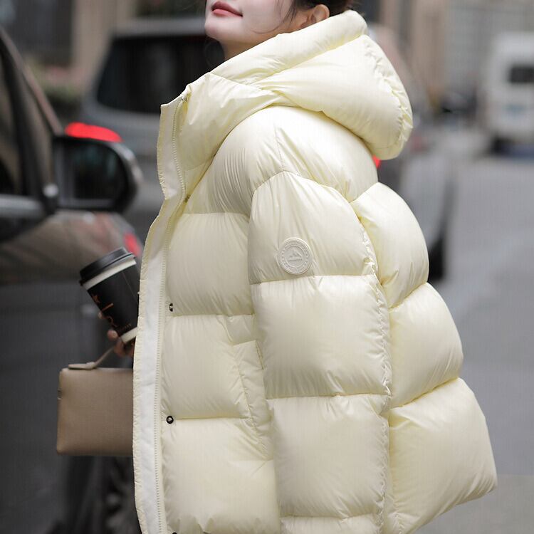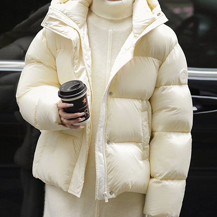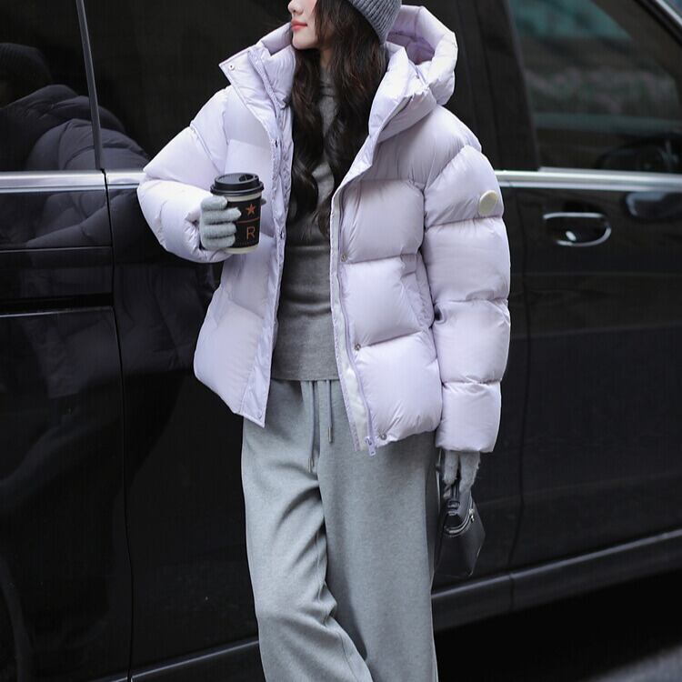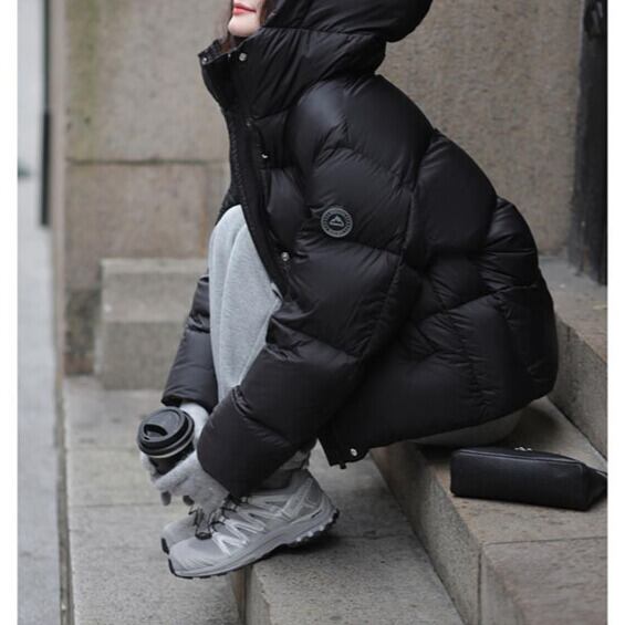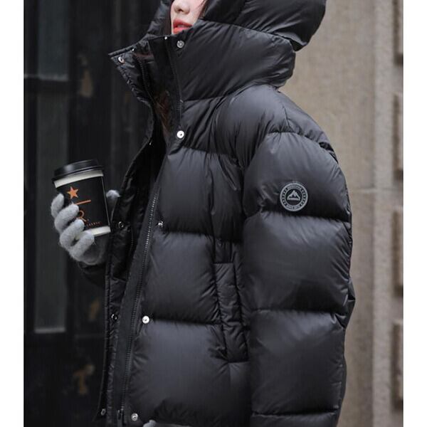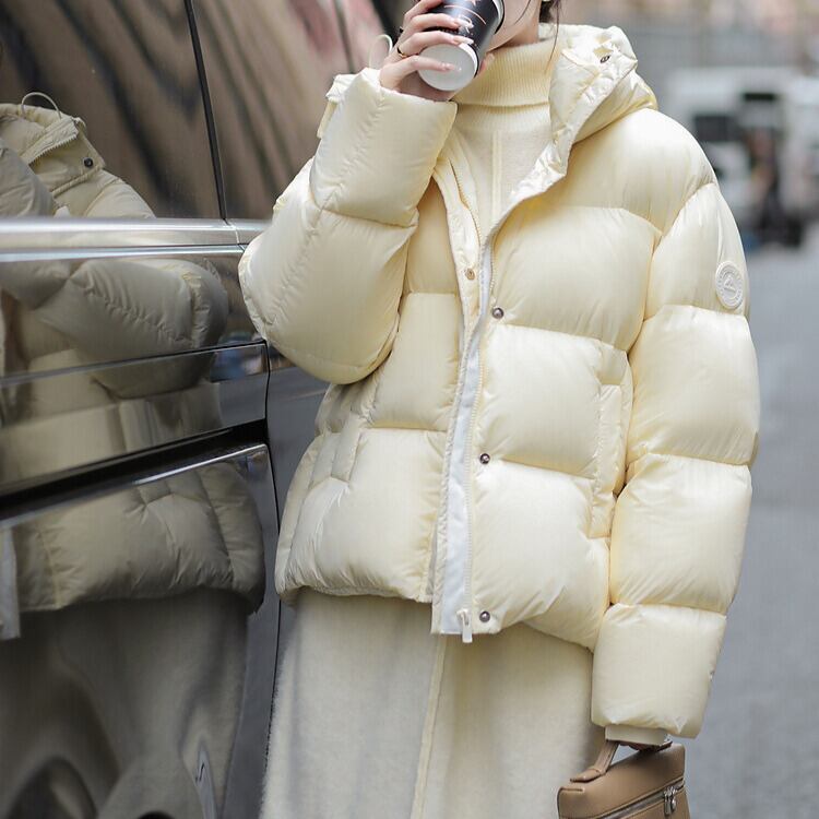 フード付きダウンジャケットは、ふっくらとしたフォルムが可愛らしい一着。