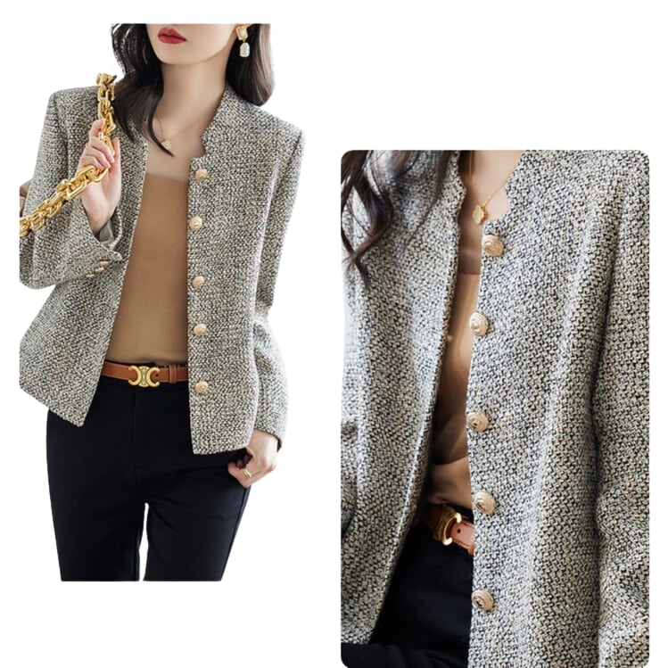 ノーカラーのデザインが首元をすっきりと見せてくれるジャケットです。