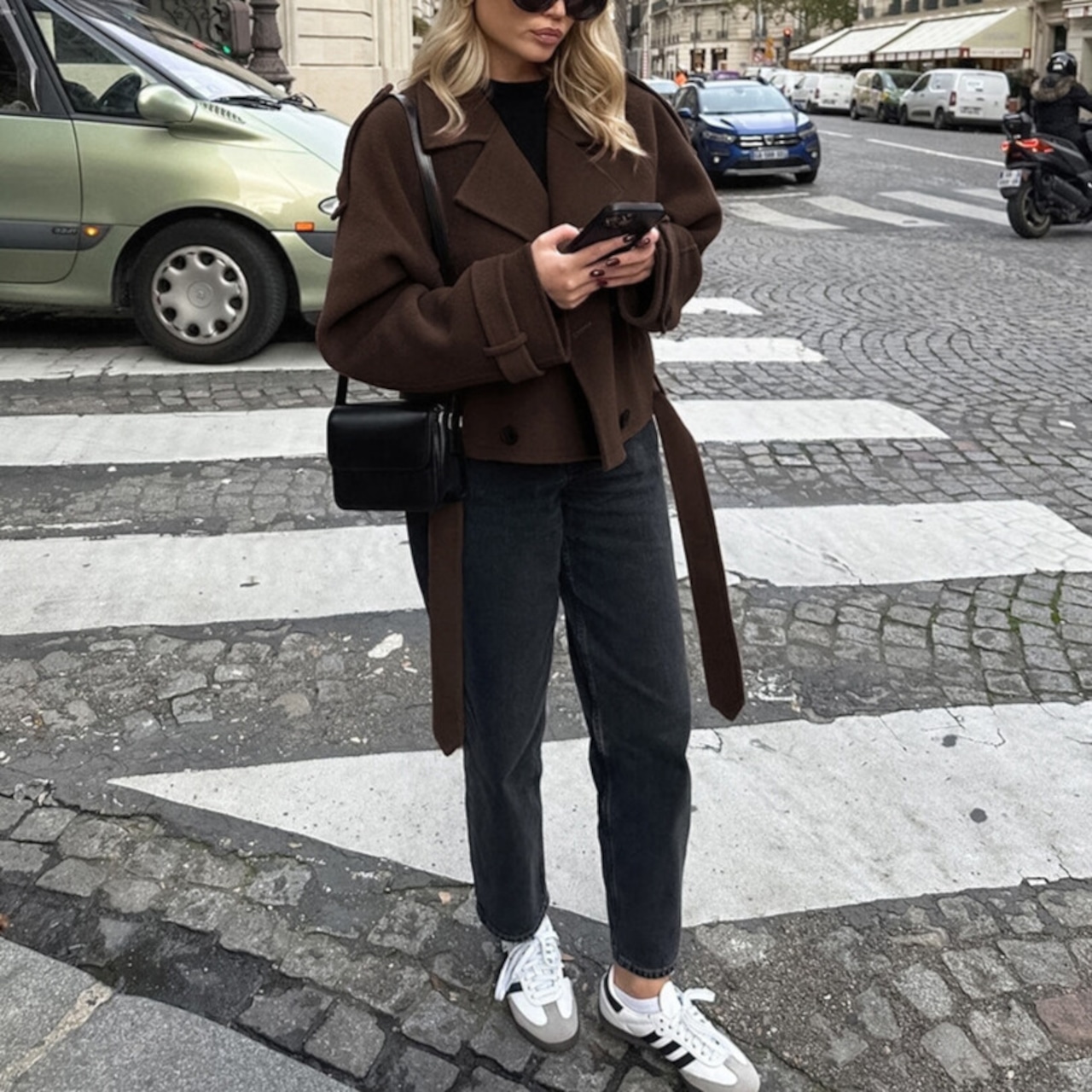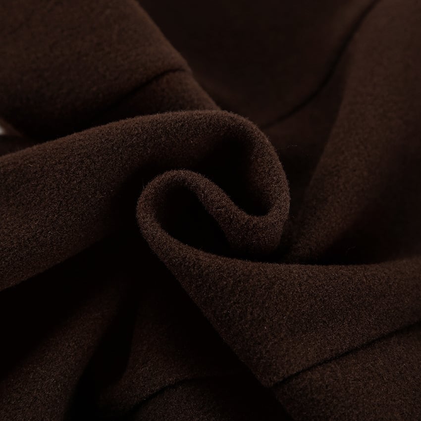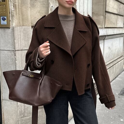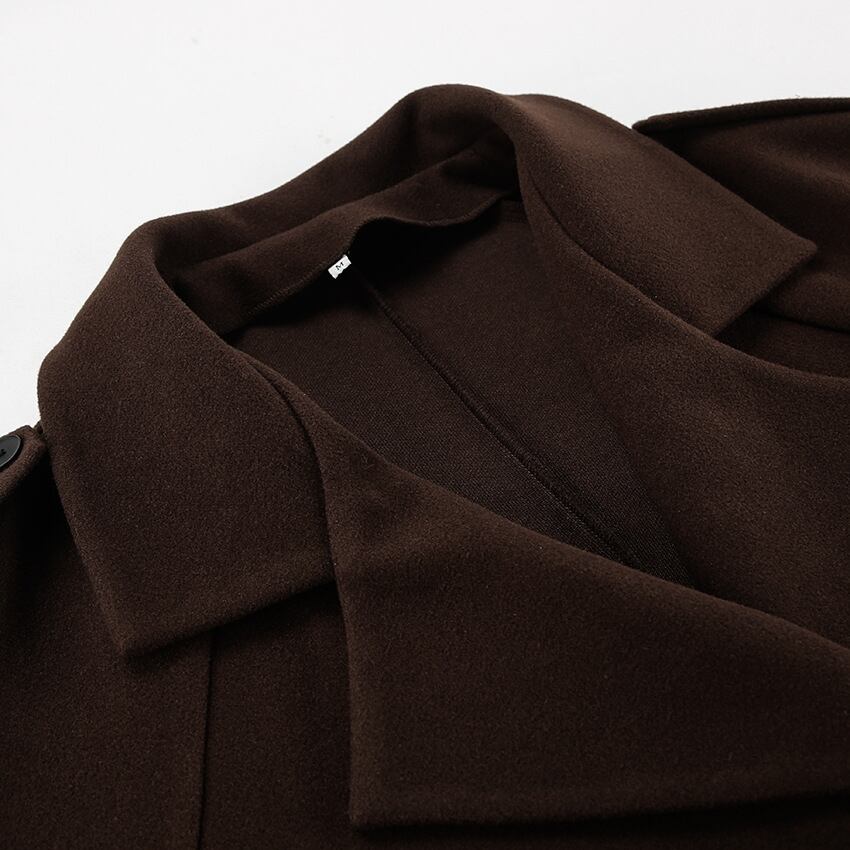 ダブルブレストとベルトのデザインが、クラシカルな雰囲気を演出します。