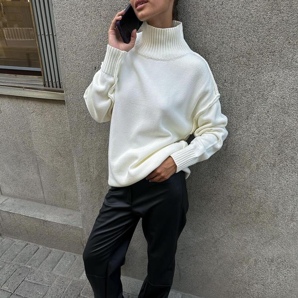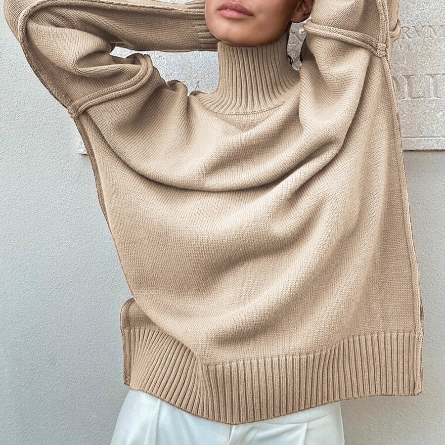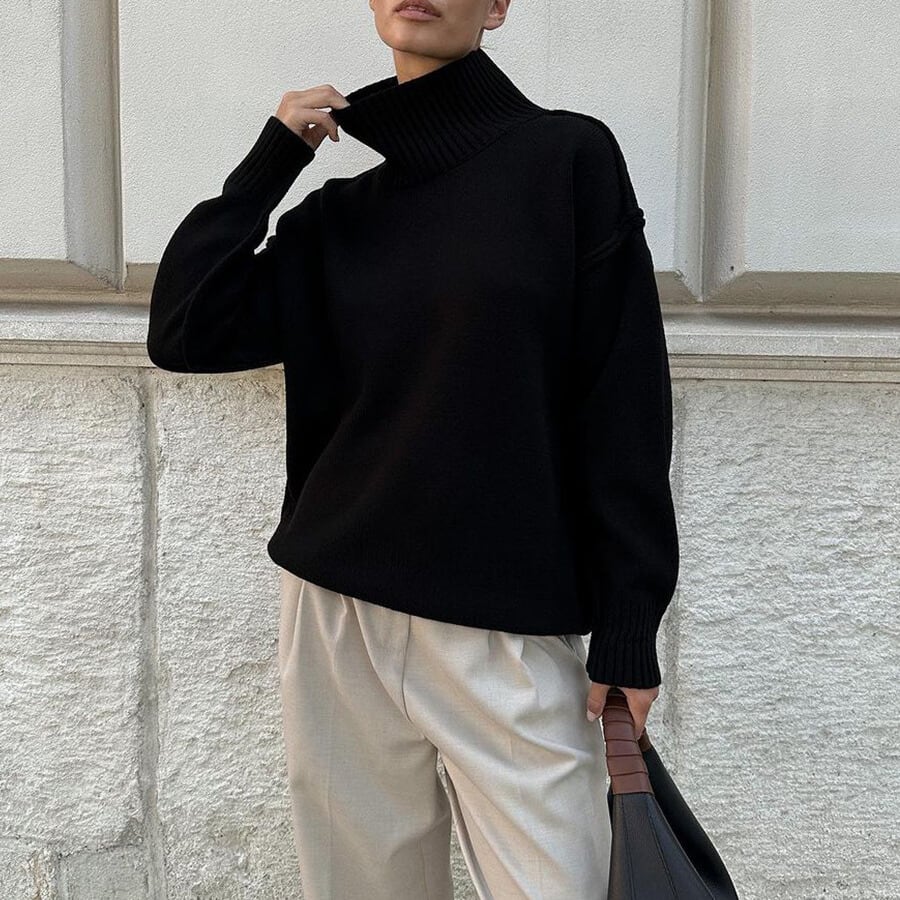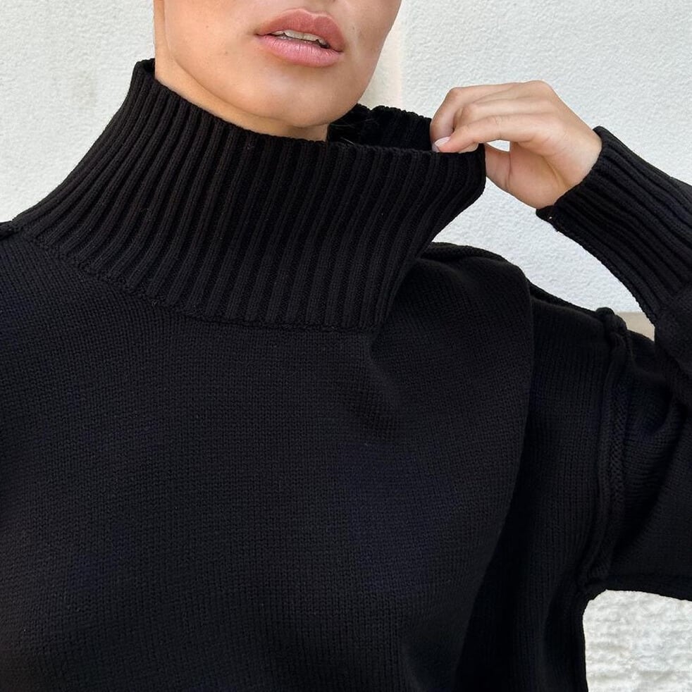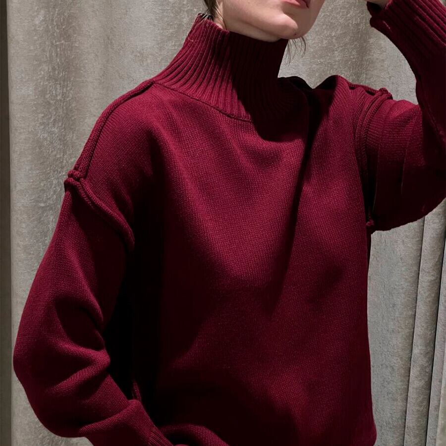 タートルネックなので首元まで暖かく、秋冬の装いに最適です。