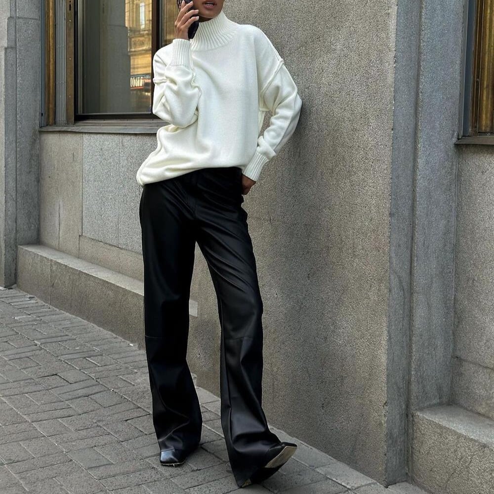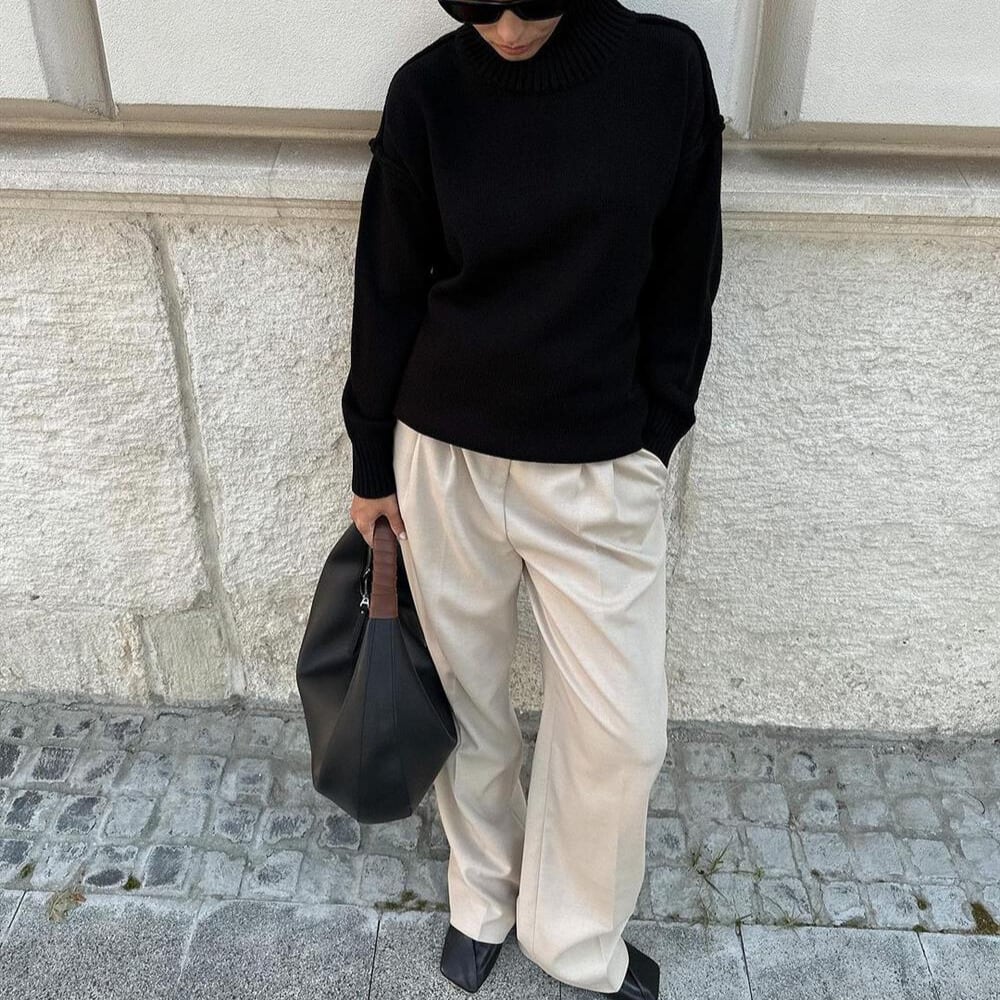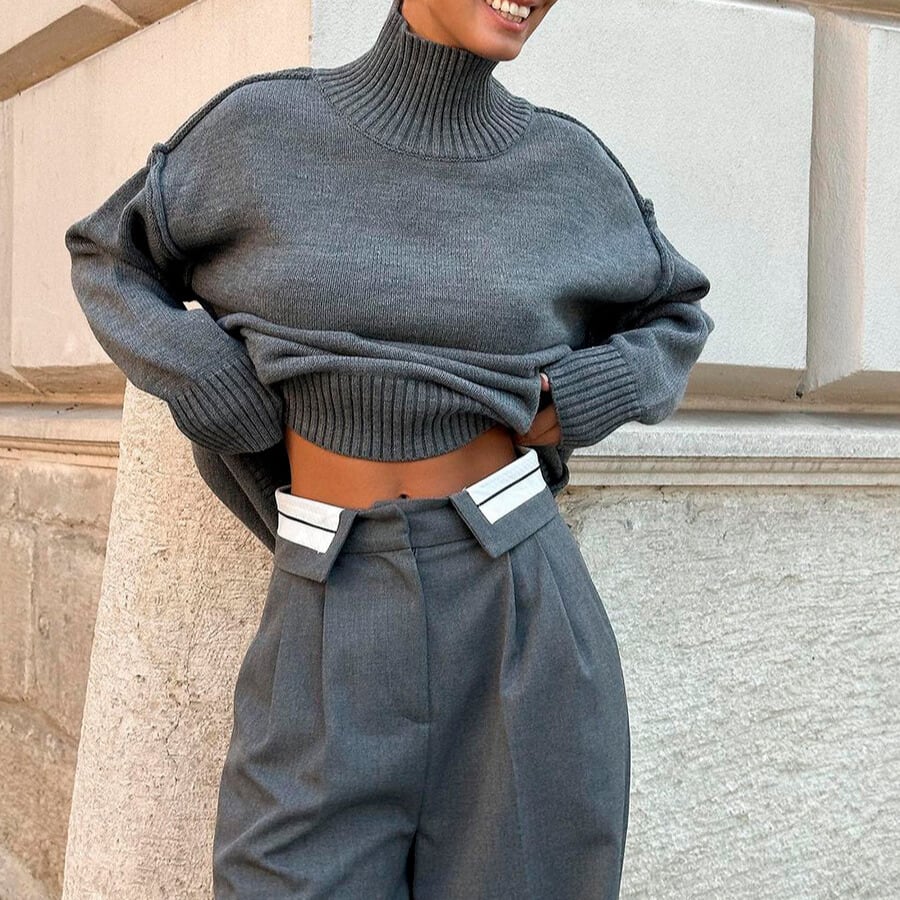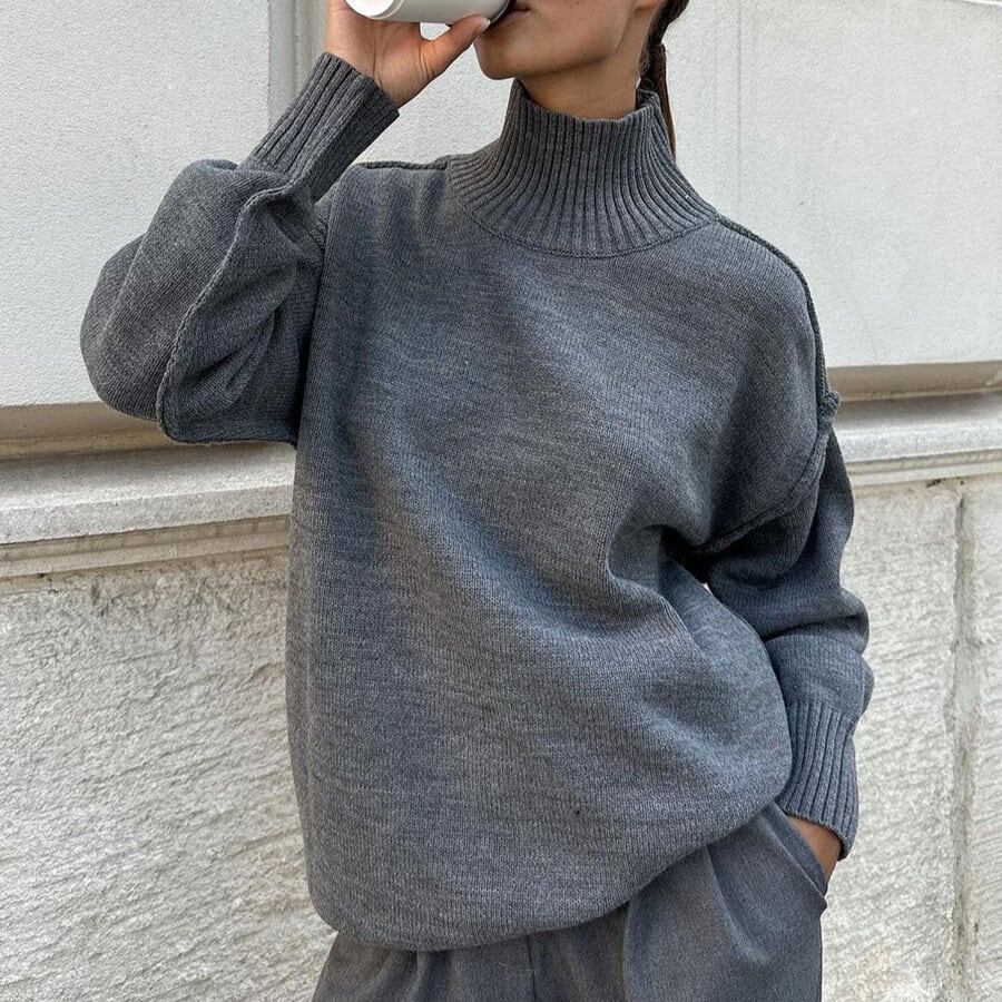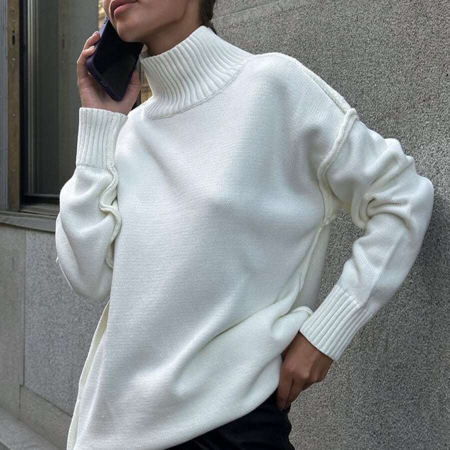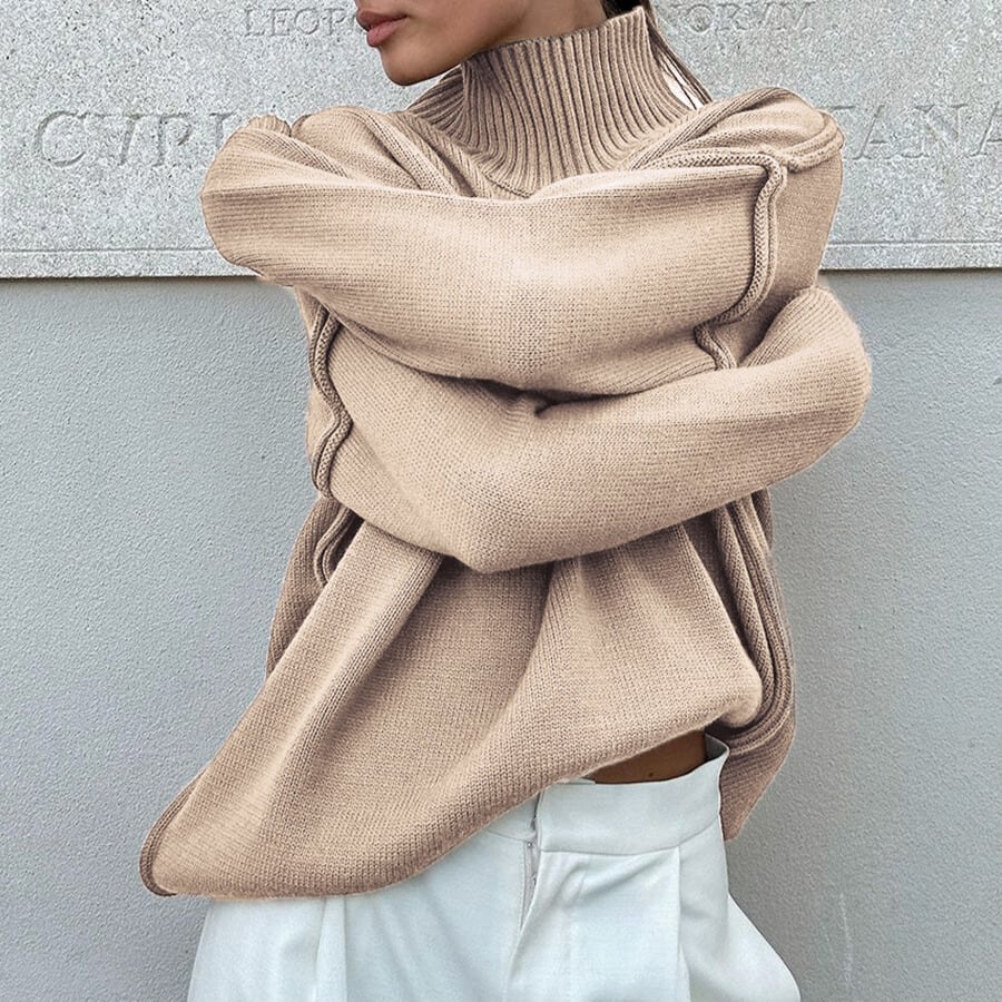 タートルネックなので首元まで暖かく、秋冬の装いに最適です。