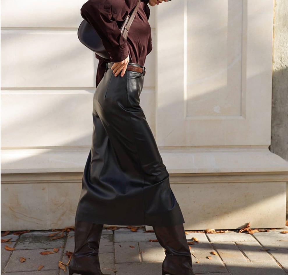 深めのフロントスリットが、足元に抜け感をプラスし、洗練された大人の女性らしさを演出します。