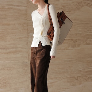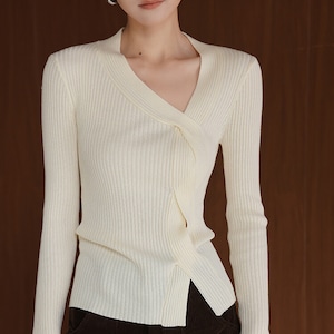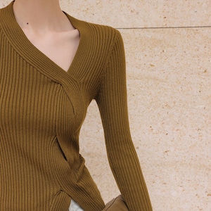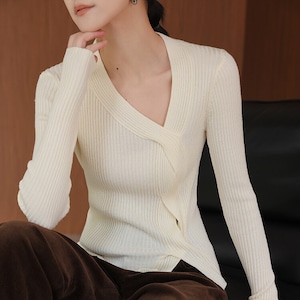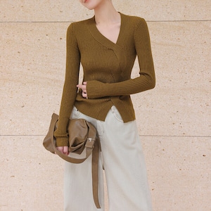 Vネックラインがデコルテを美しく演出し、女性らしさを引き立てます。