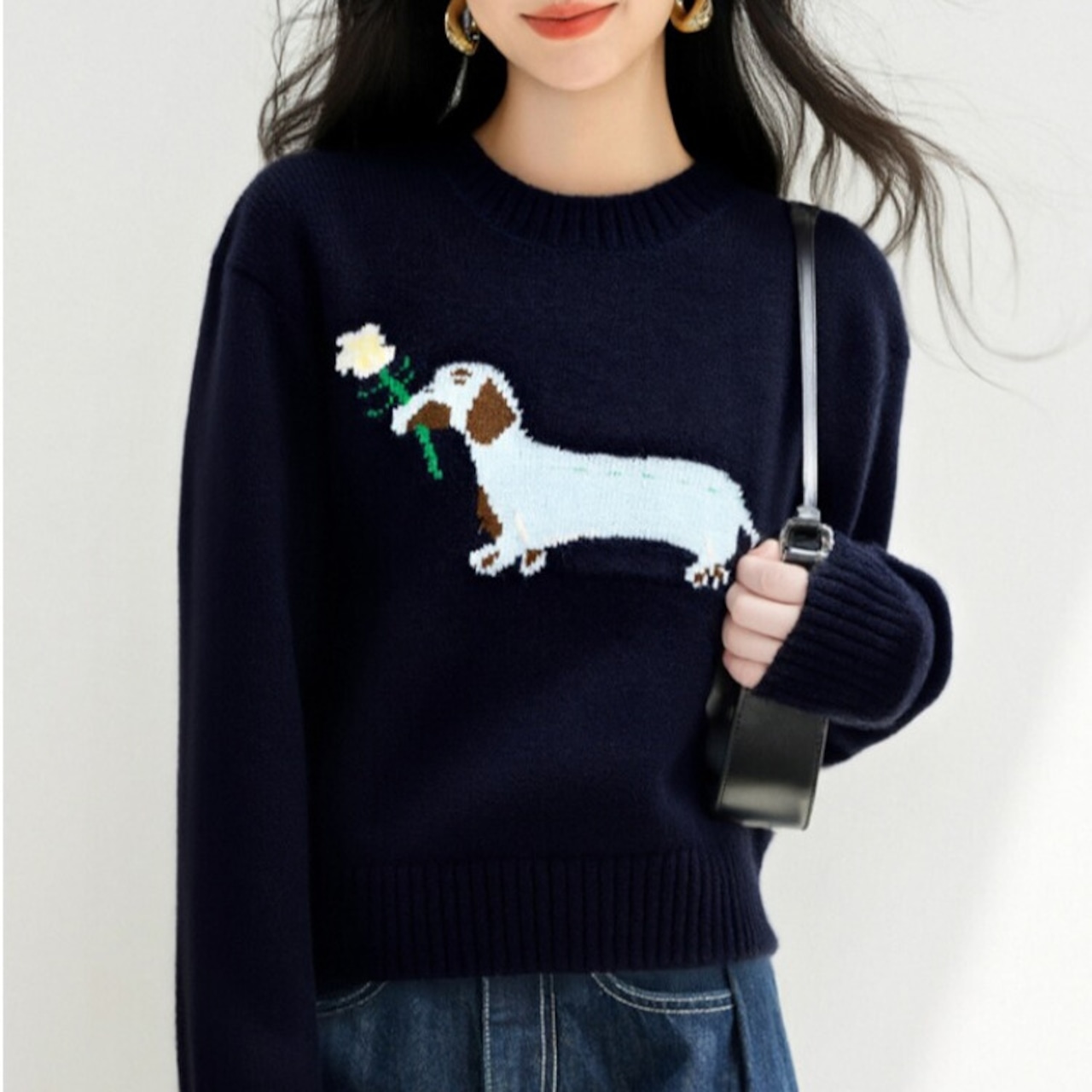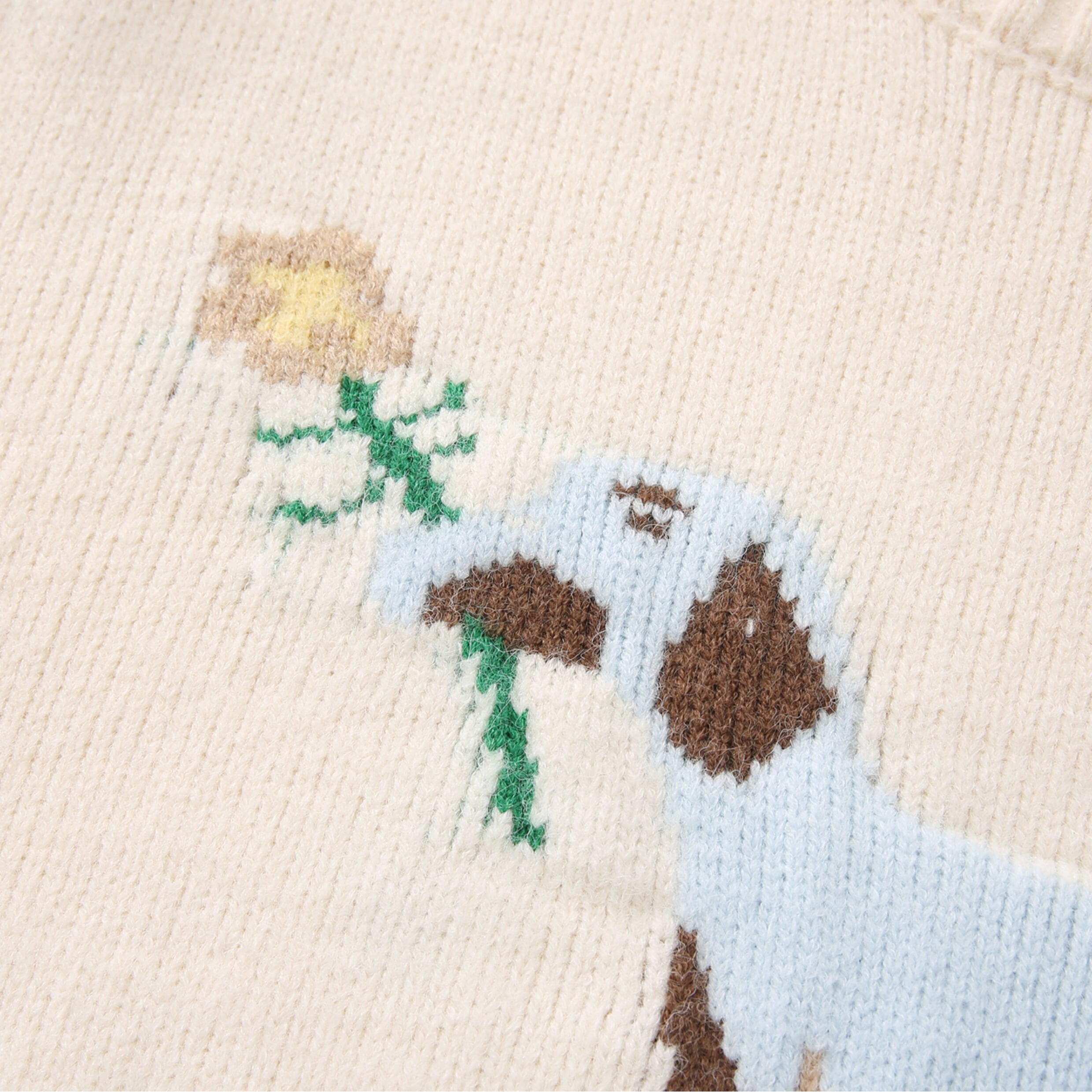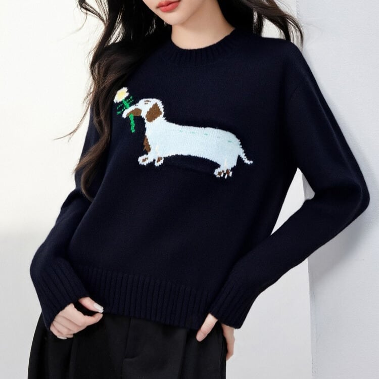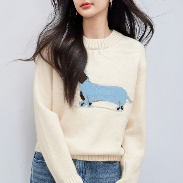 愛らしいアニマルモチーフが目を引くクルーネックニット。