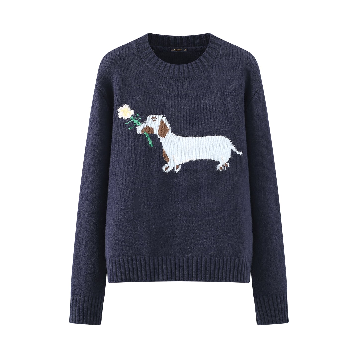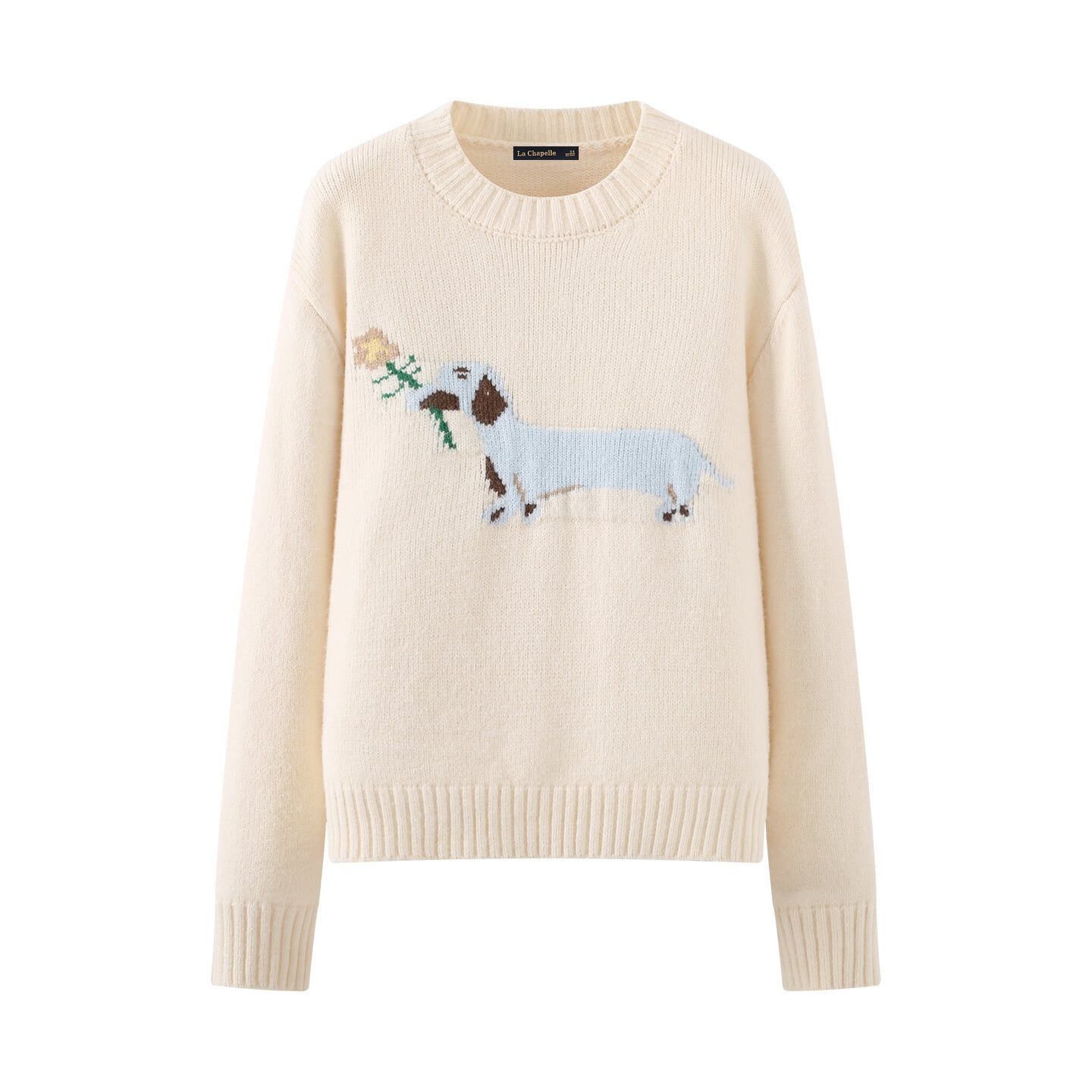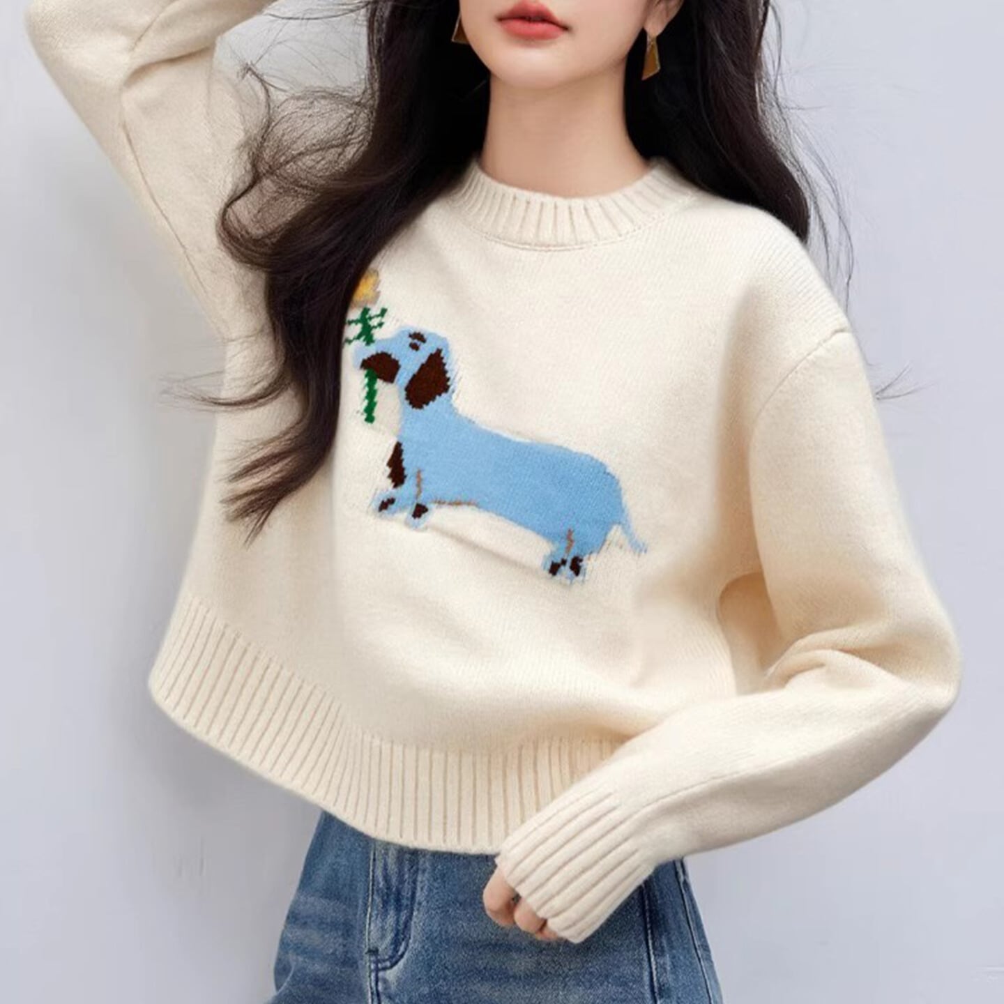 愛らしいアニマルモチーフが目を引くクルーネックニット。