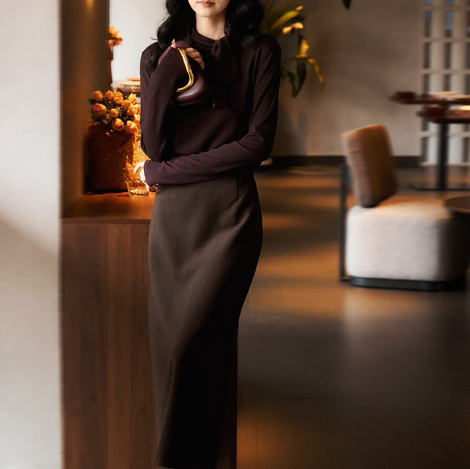 シンプルなボトムスと合わせるだけで、洗練された大人の女性らしさを演出。