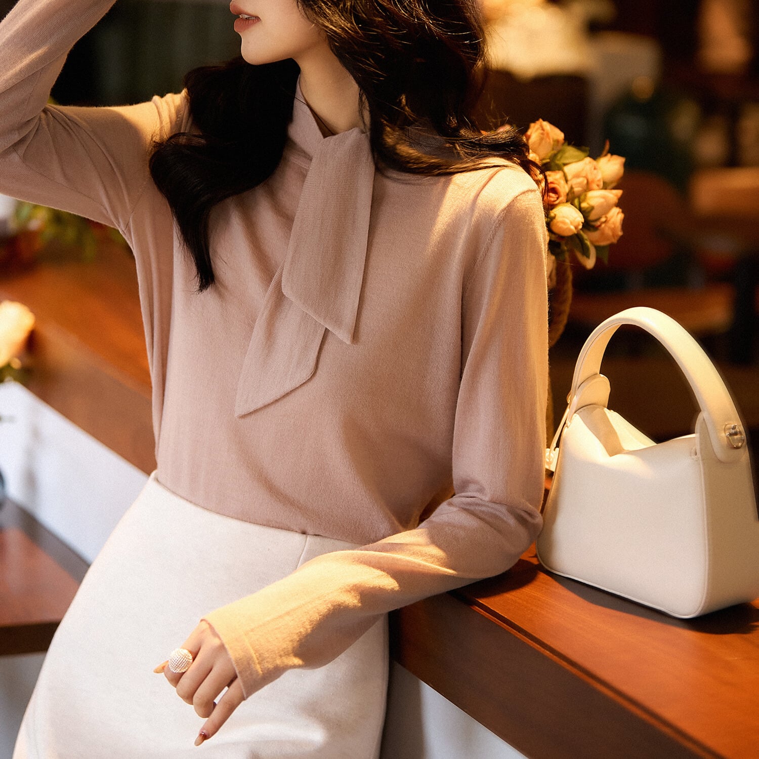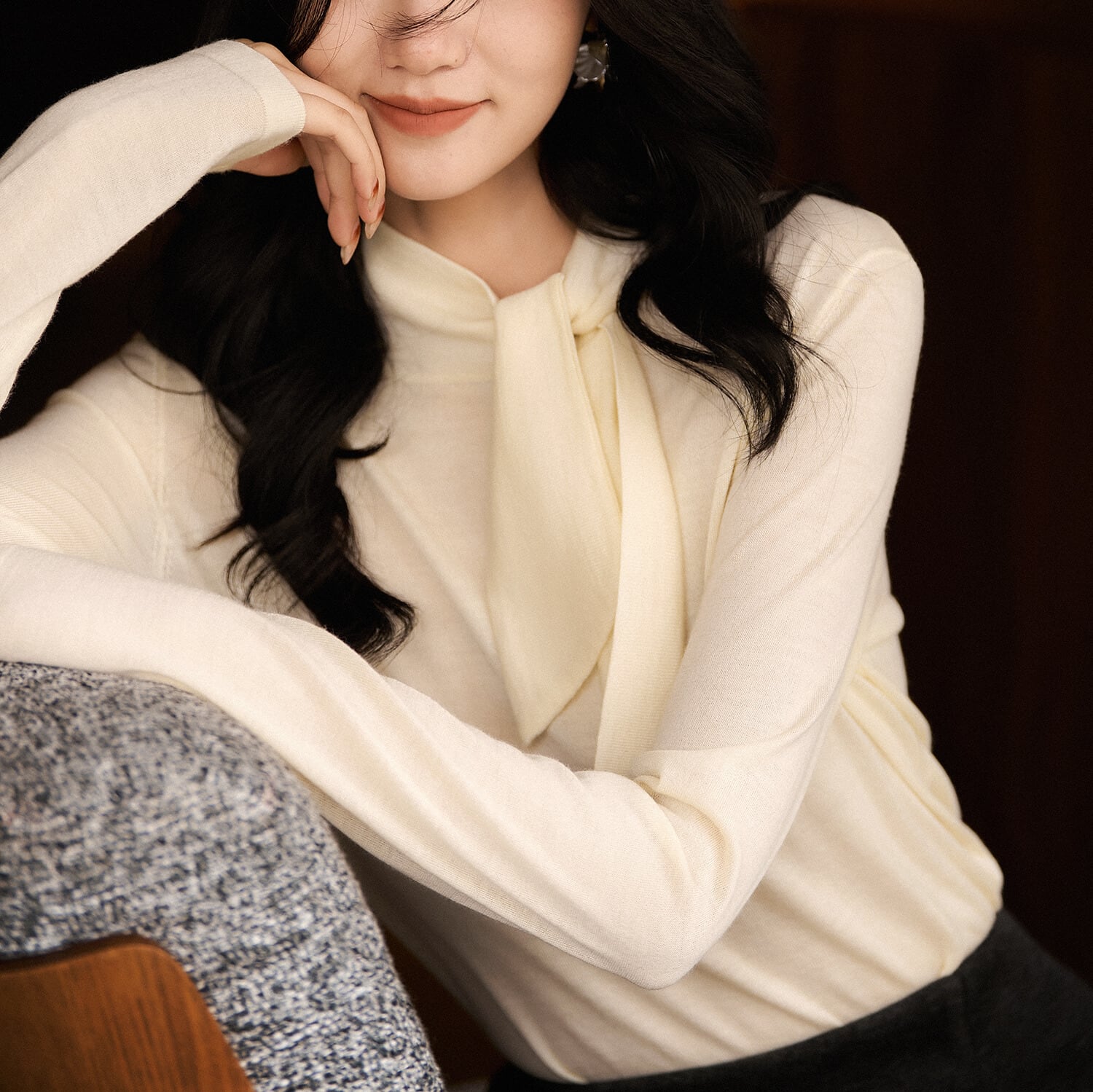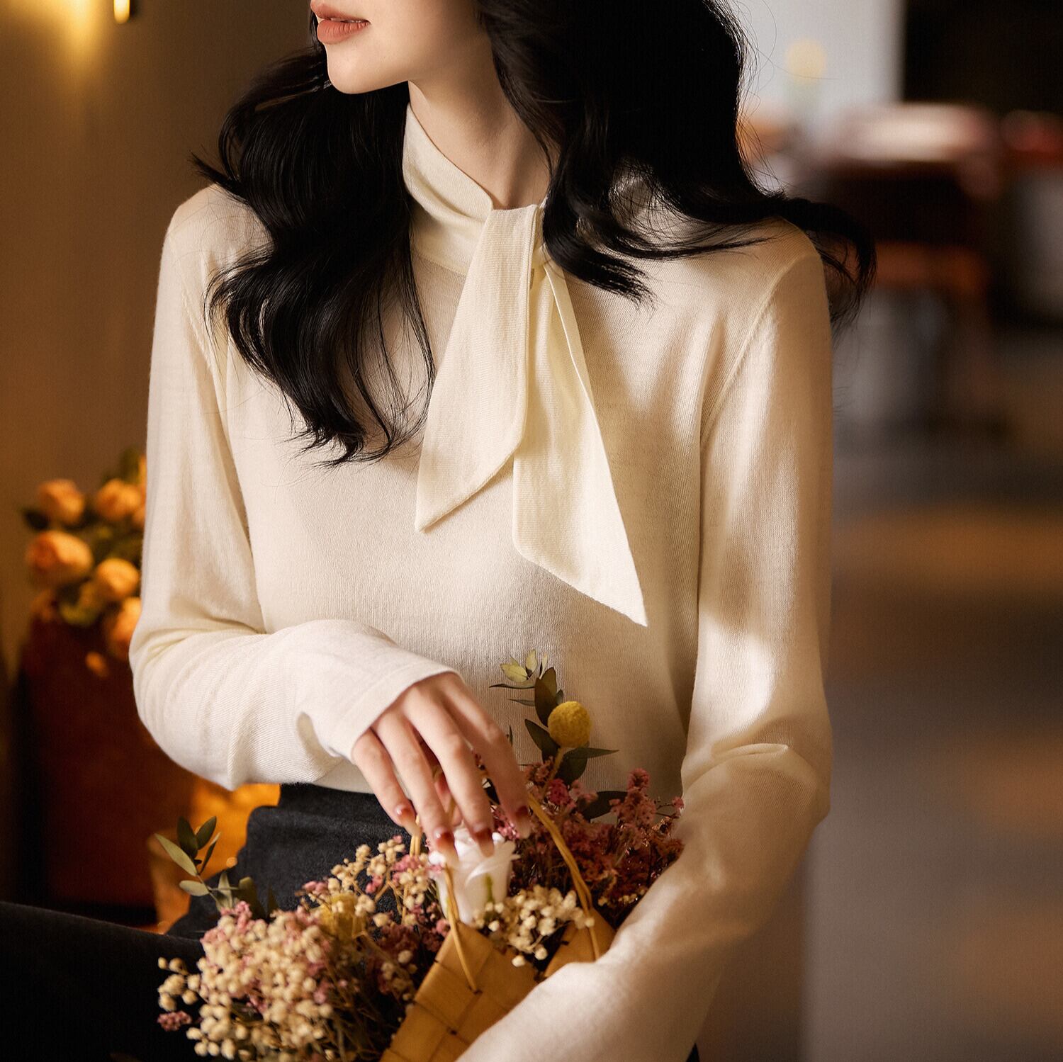 上品なボウタイデザインが目を引くニット。