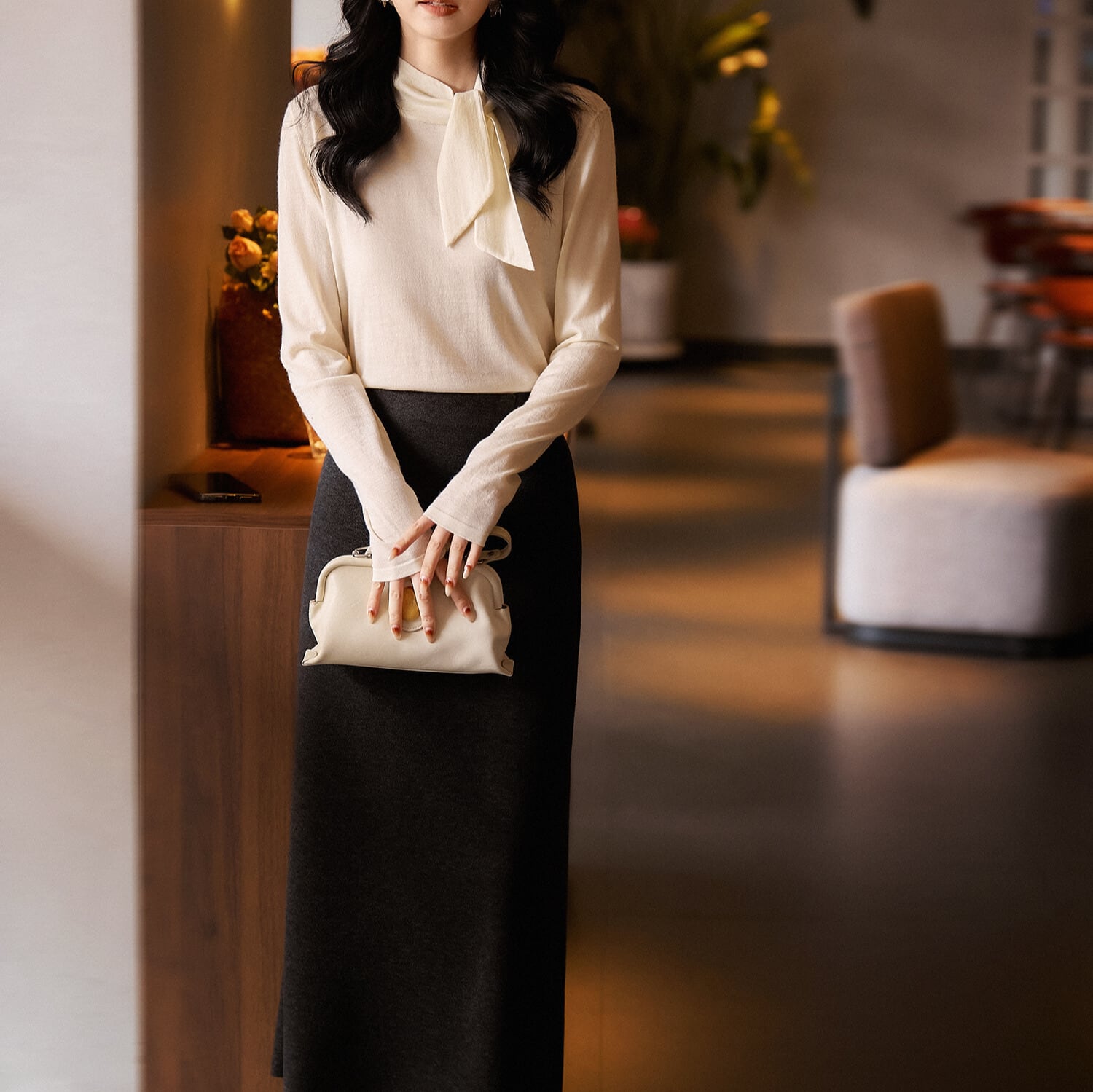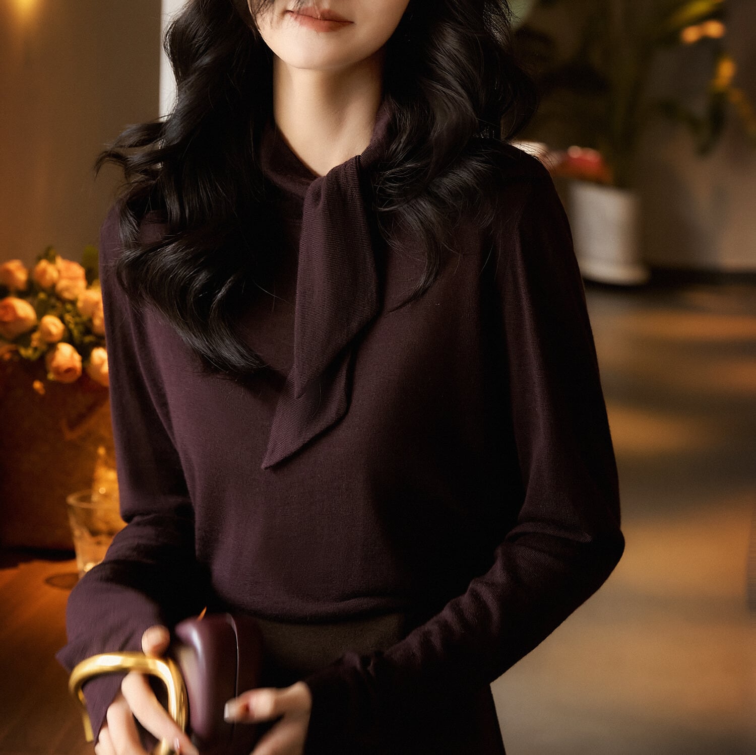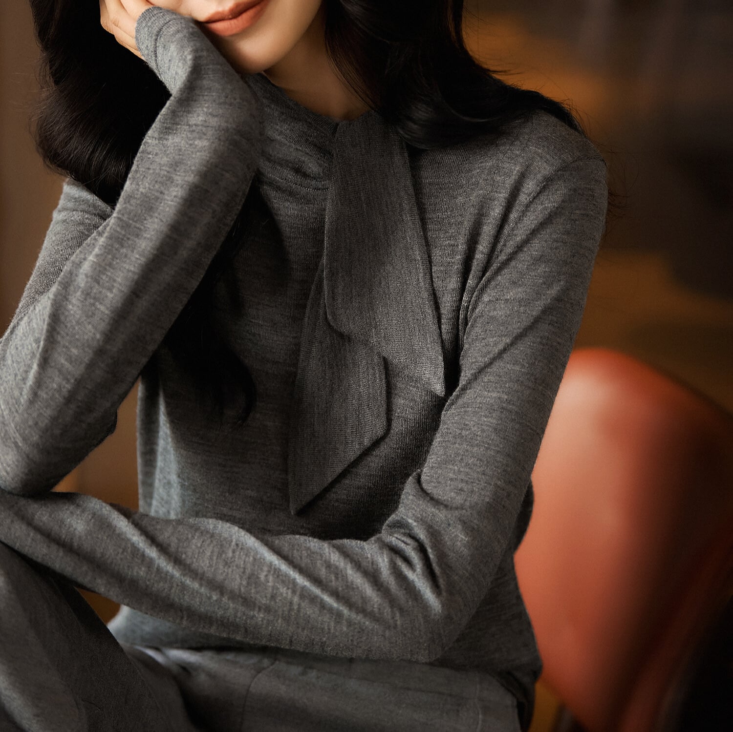 上品なボウタイデザインが目を引くニット。