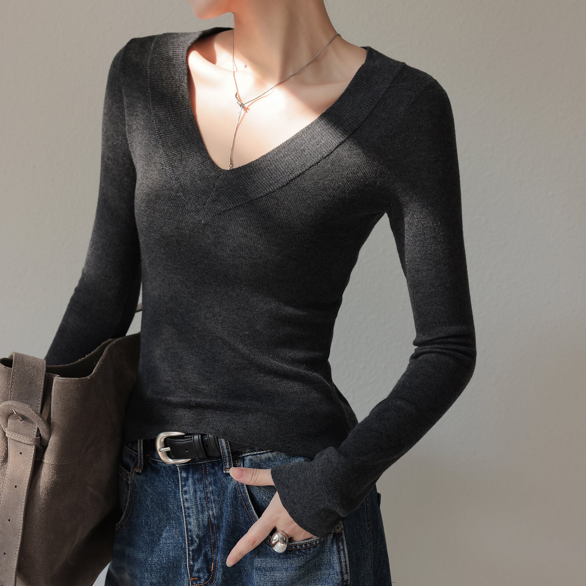 深めのVネックは、ネックレスとの相性も抜群です。