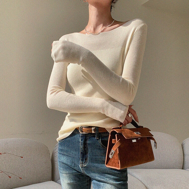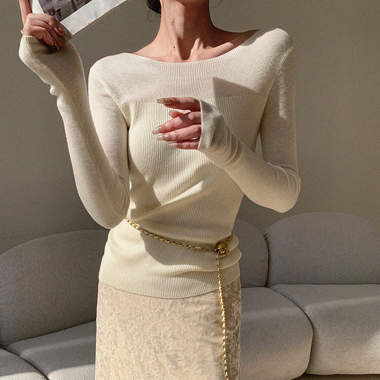 鎖骨が綺麗に見えるネックラインで、女性らしさを演出します。