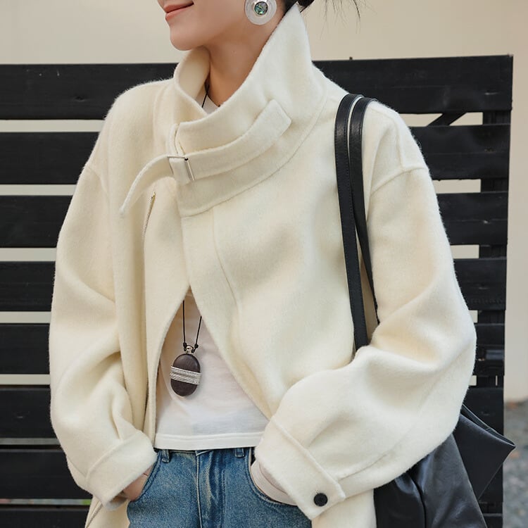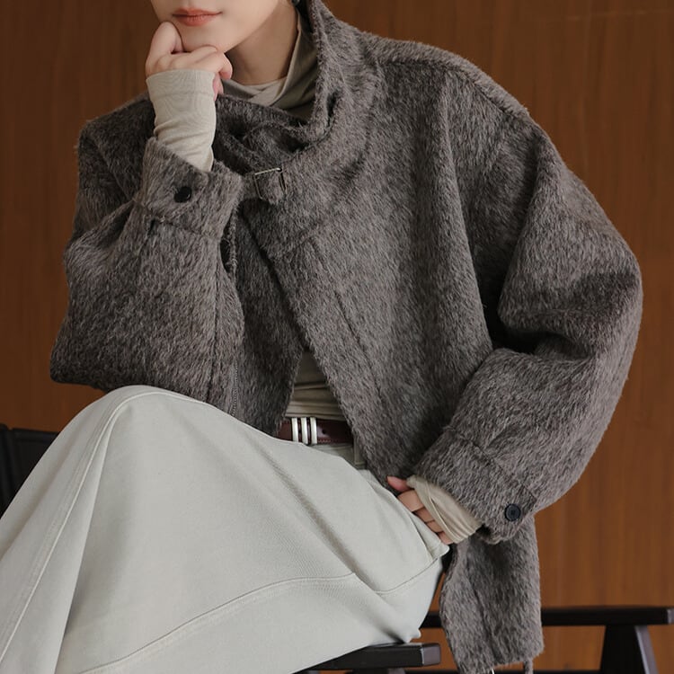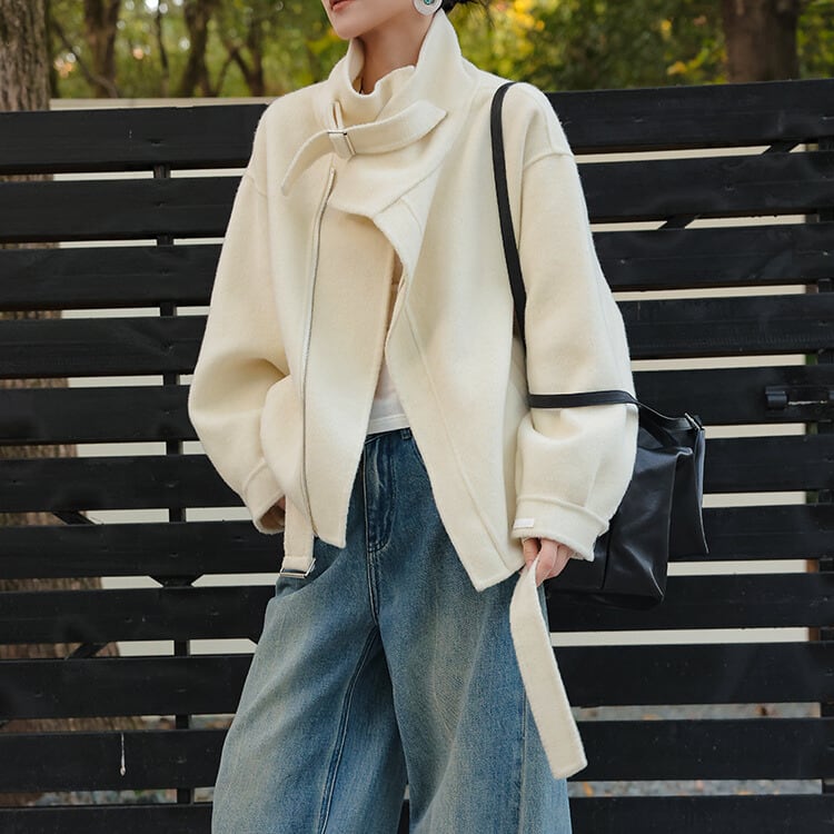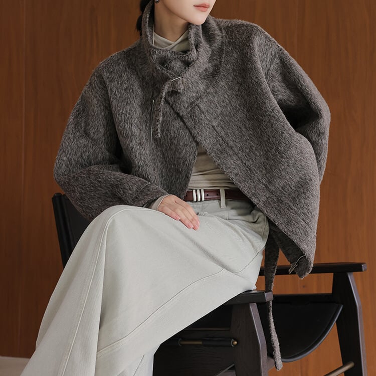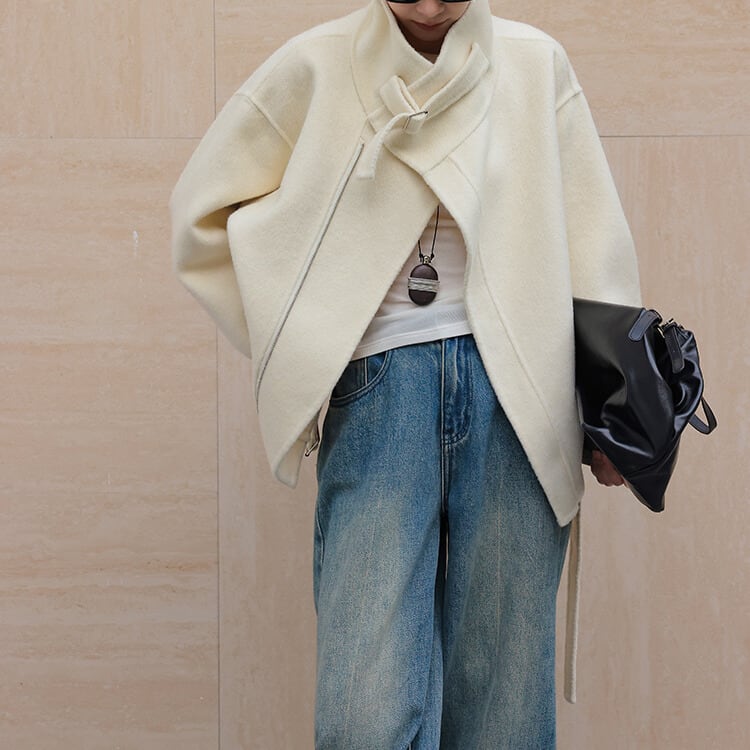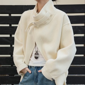 デザイン性の高いスタンドカラージャケット。