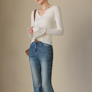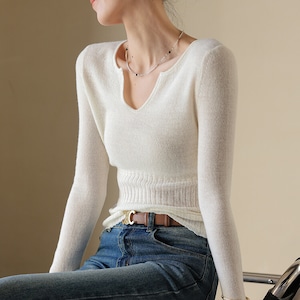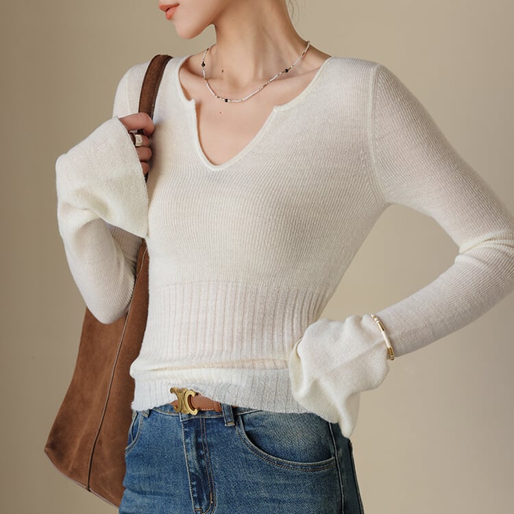 Vネックがデコルテを美しく見せてくれるニットトップス。
