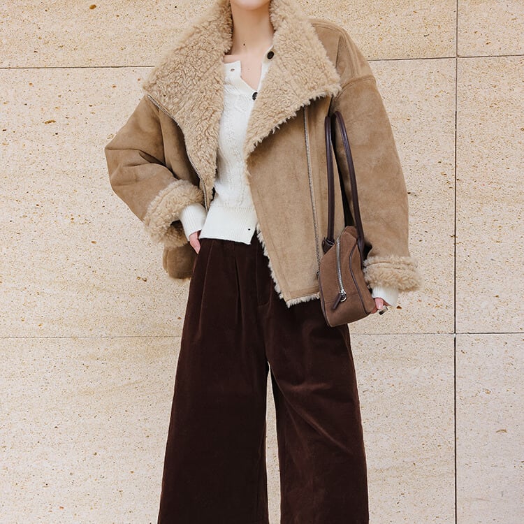 首元と袖口のボアが、上品さと防寒性をプラスします。