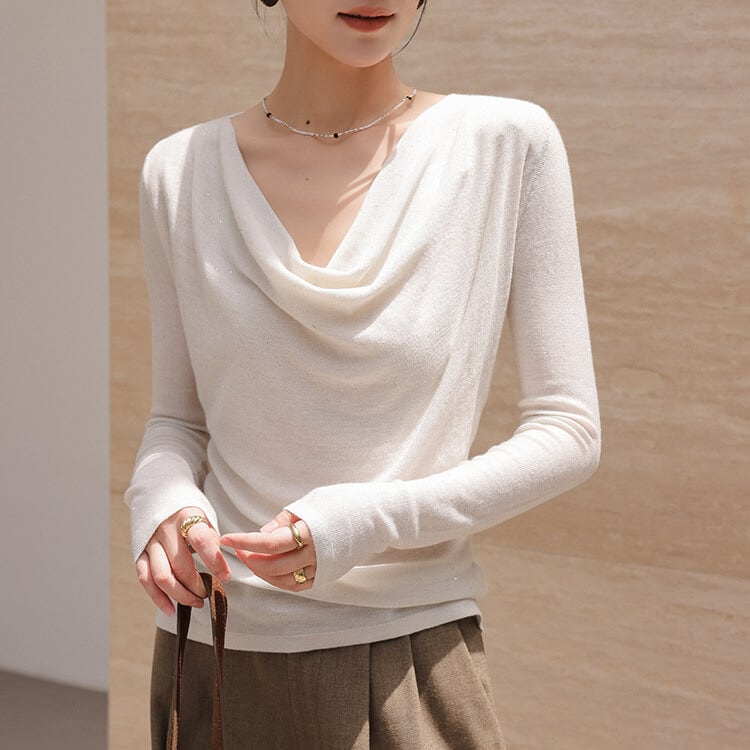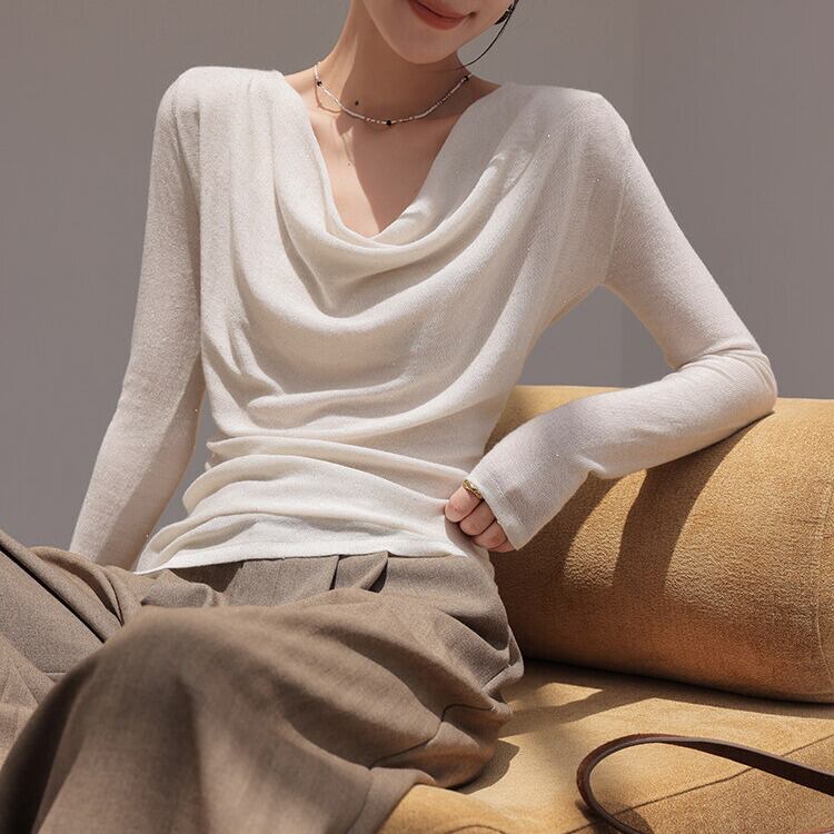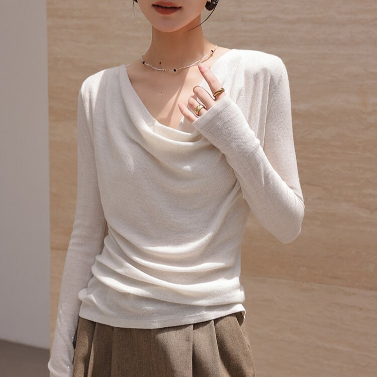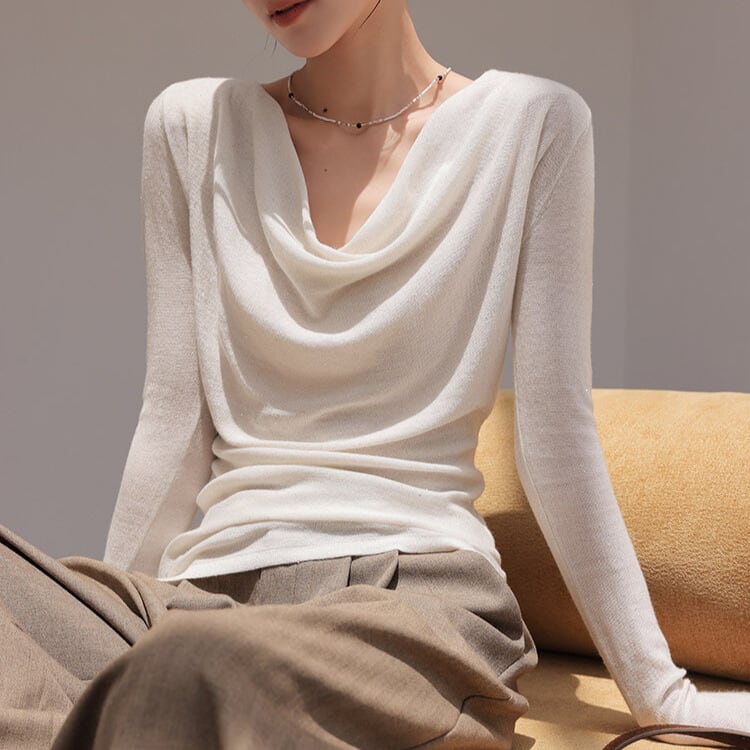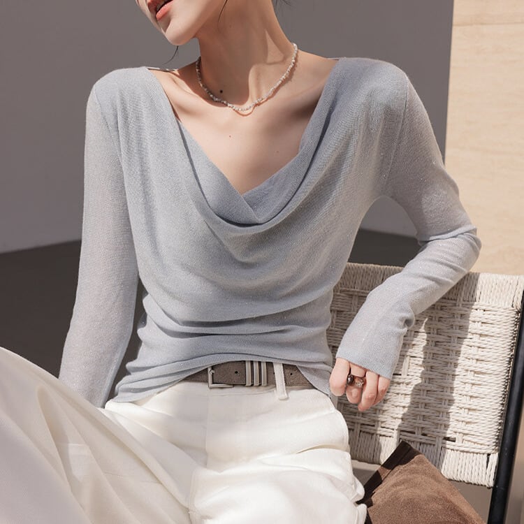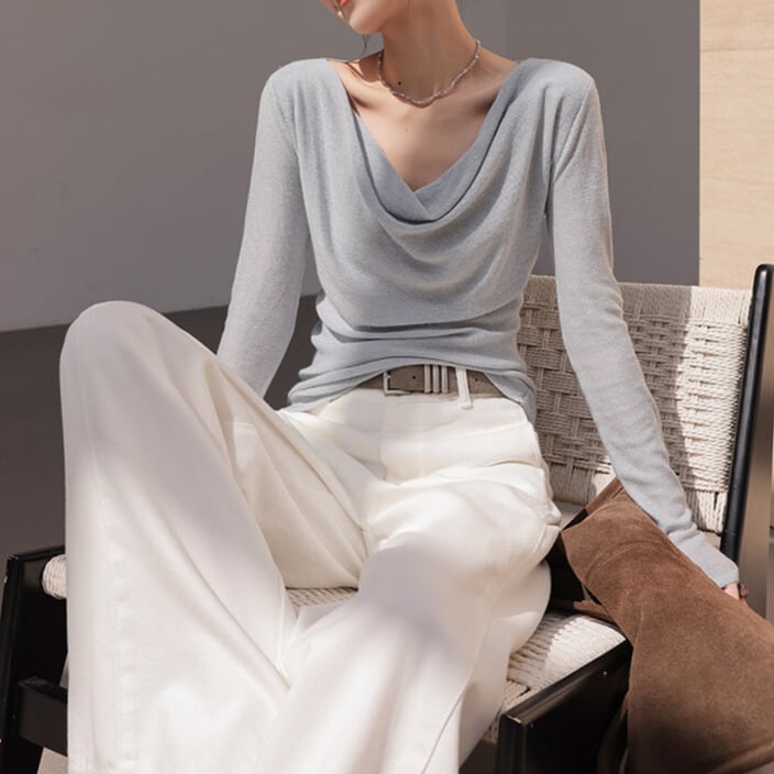 デコルテを美しく見せるドレープネックのデザインが、女性らしさを引き立てます。