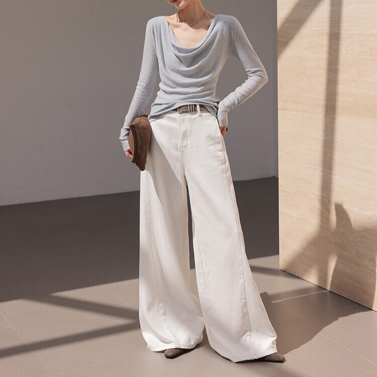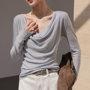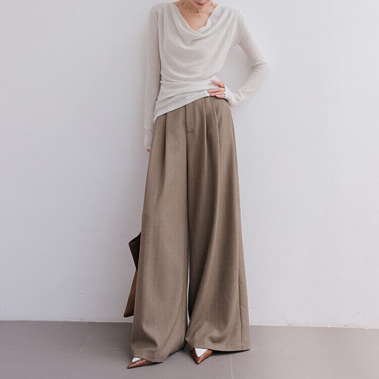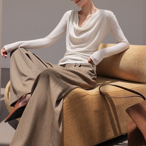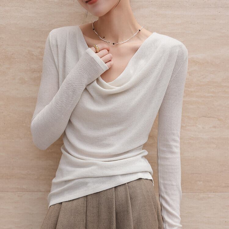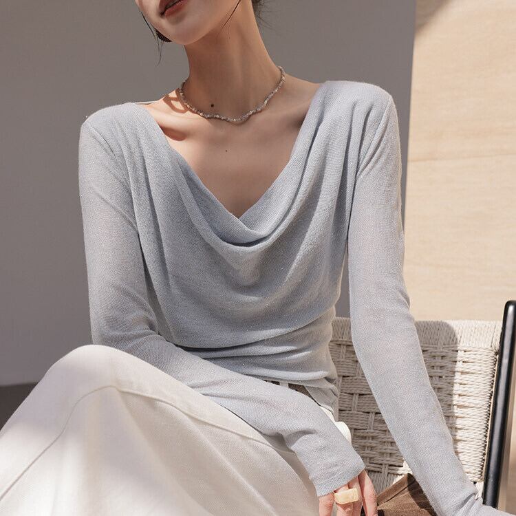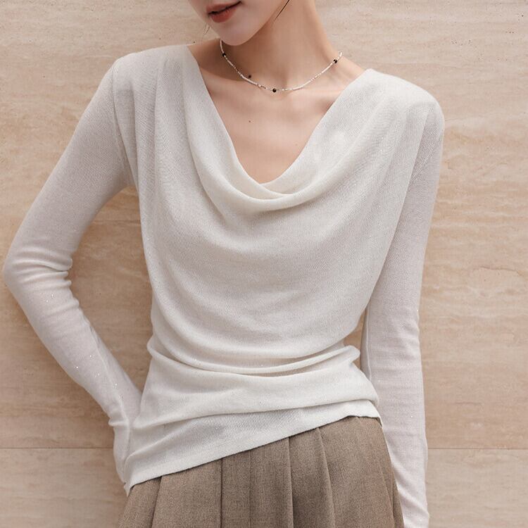 デコルテを美しく見せるドレープネックのデザインが、女性らしさを引き立てます。