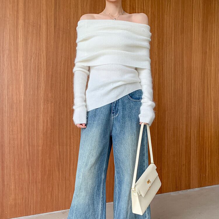 デコルテを美しく見せるオフショルダーデザインが魅力のニットプルオーバー。