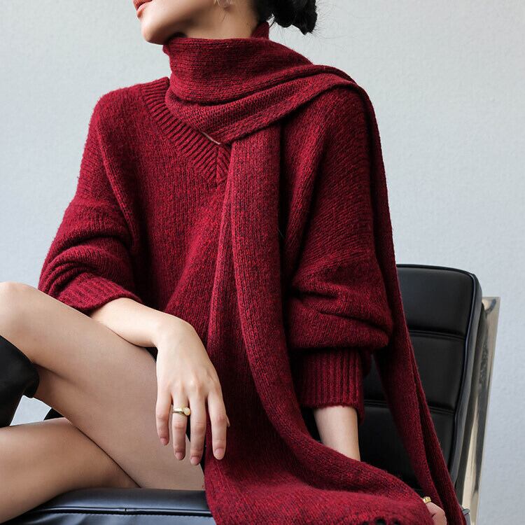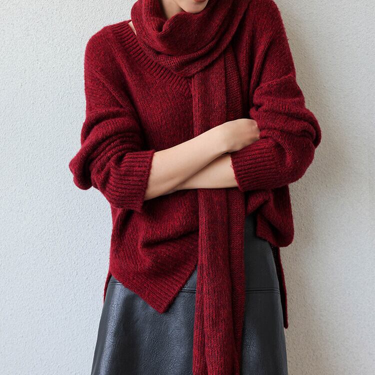 シンプルなVネックニットに、マフラーがセットになったお得なアイテム。
