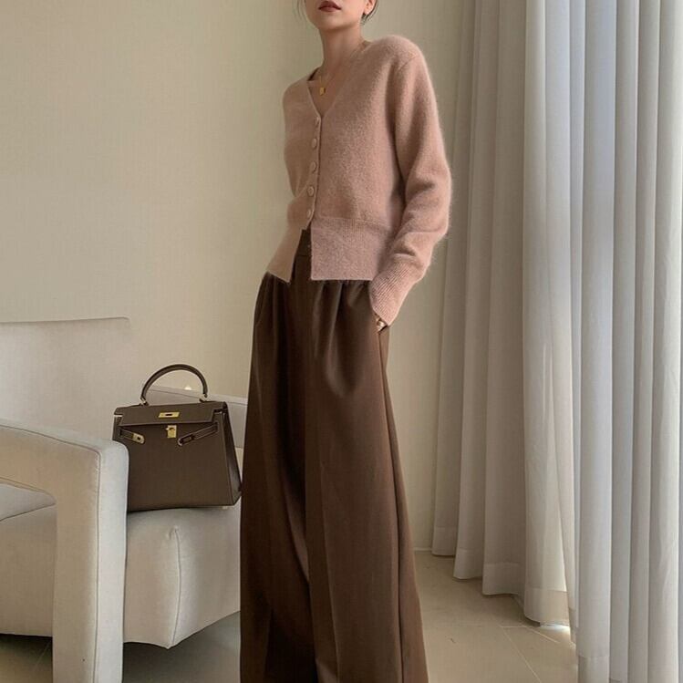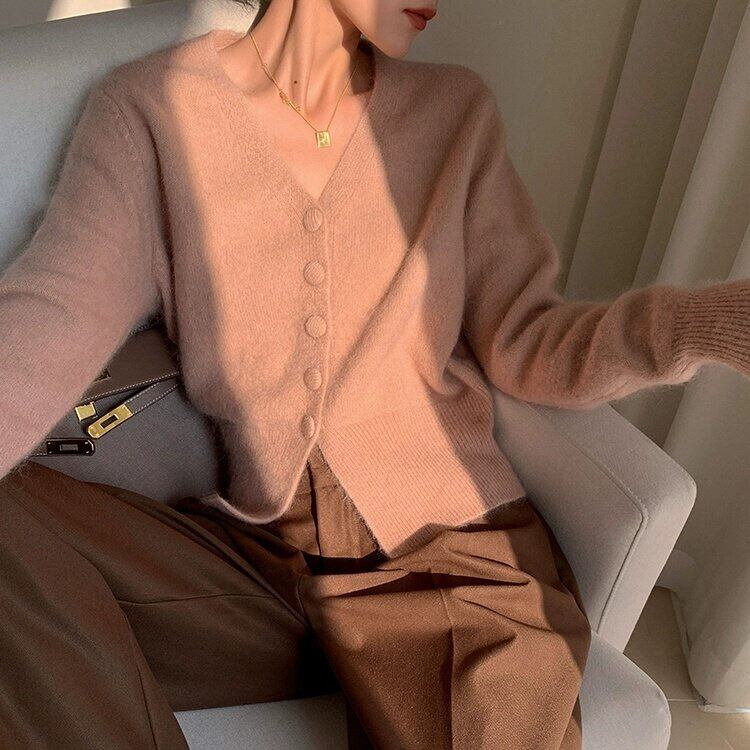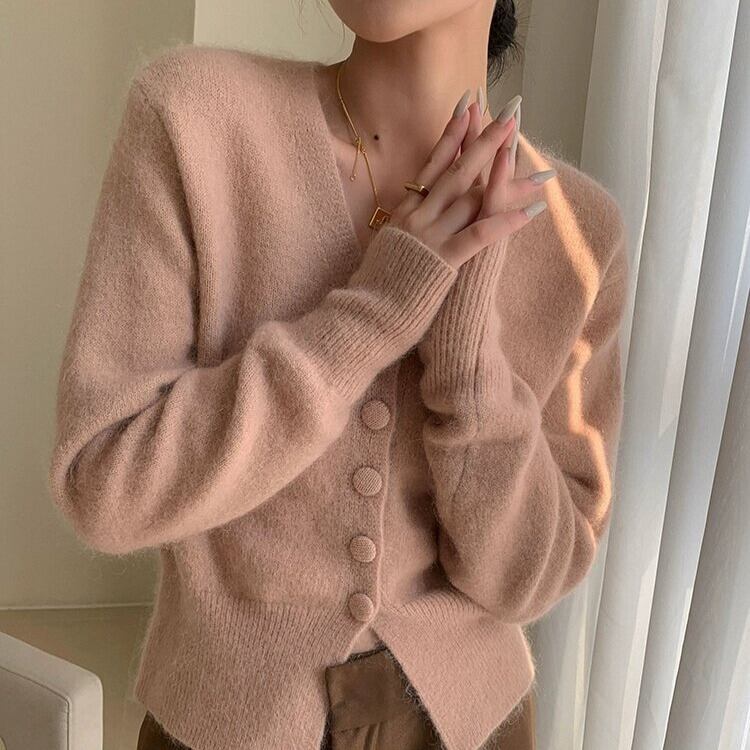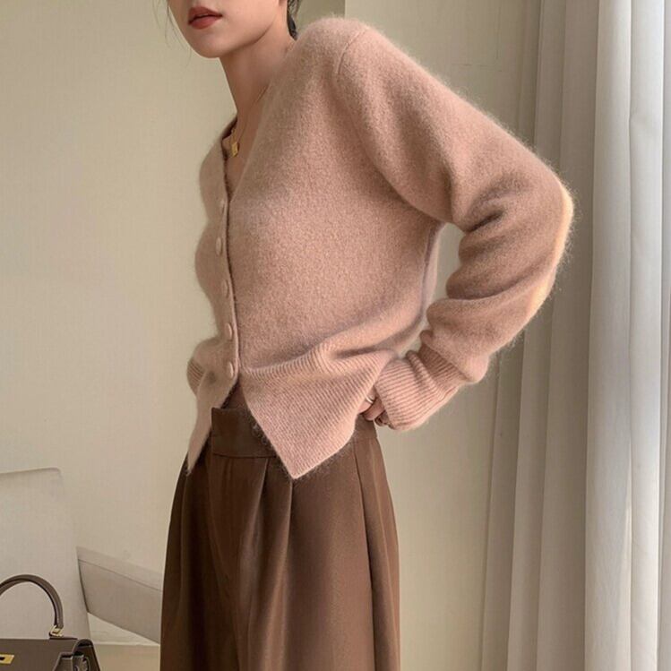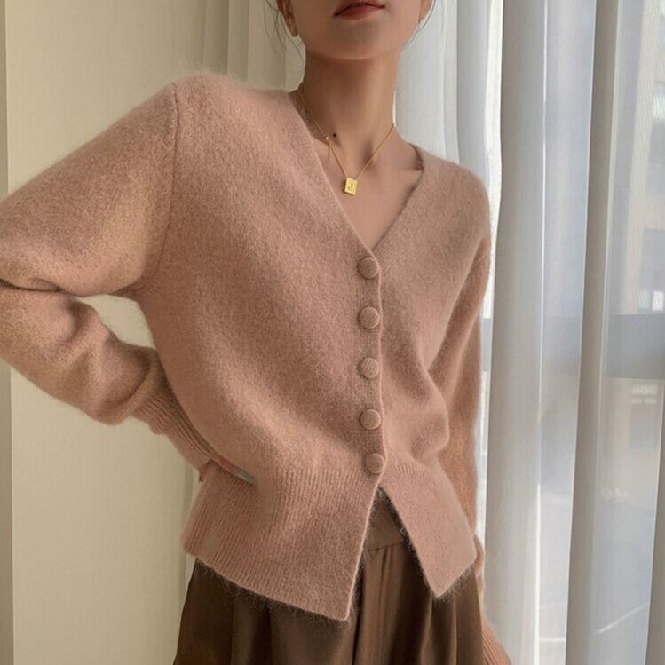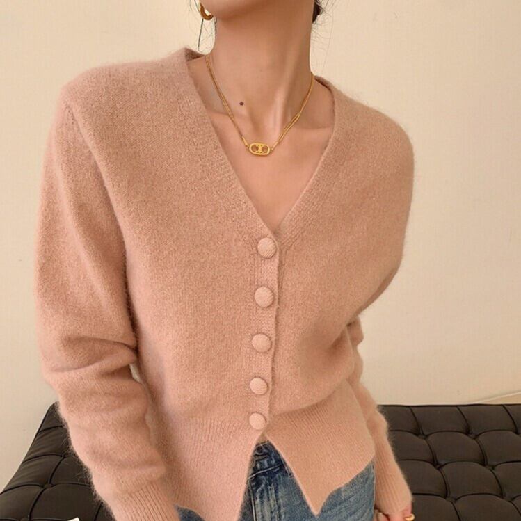Vネックがデコルテを美しく見せてくれるニットカーディガン。
