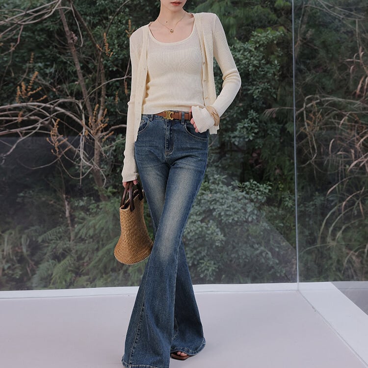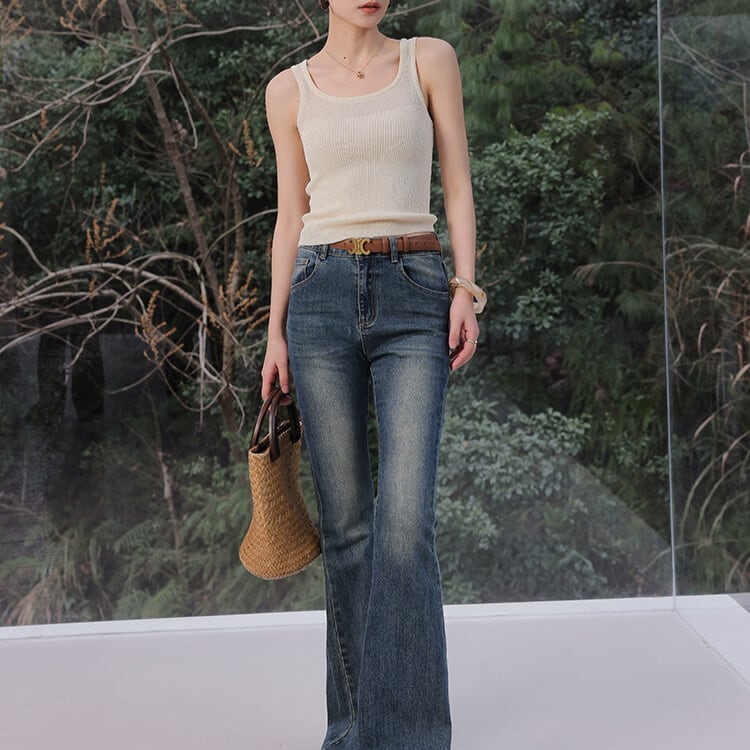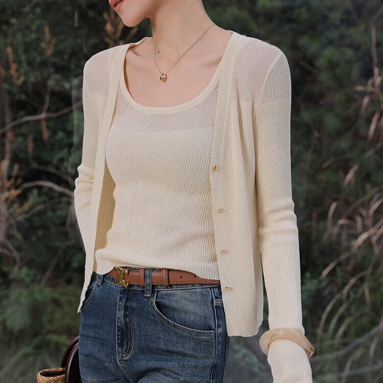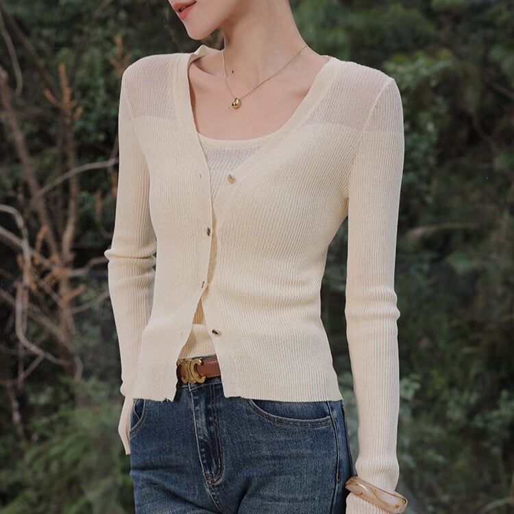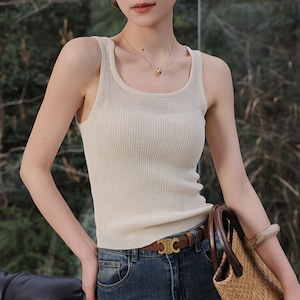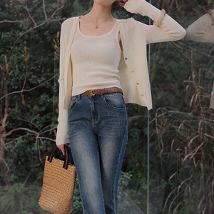 リブ編みが程よいアクセントになり、上品な印象を与えるニットキャミソール。