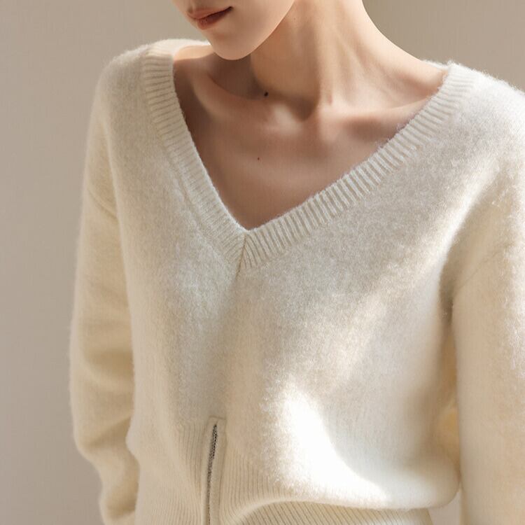 Vネックがデコルテを美しく見せてくれるニットカーディガン。