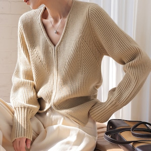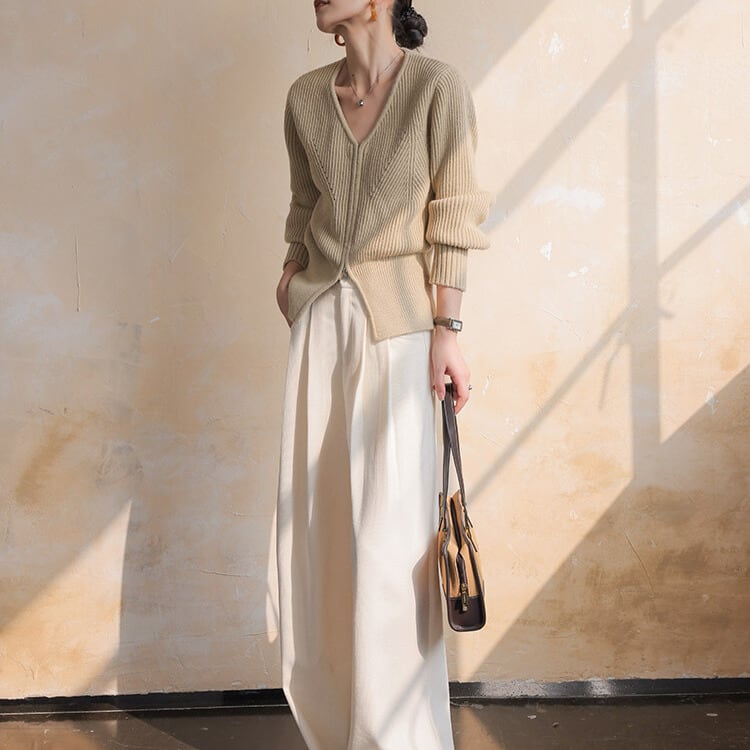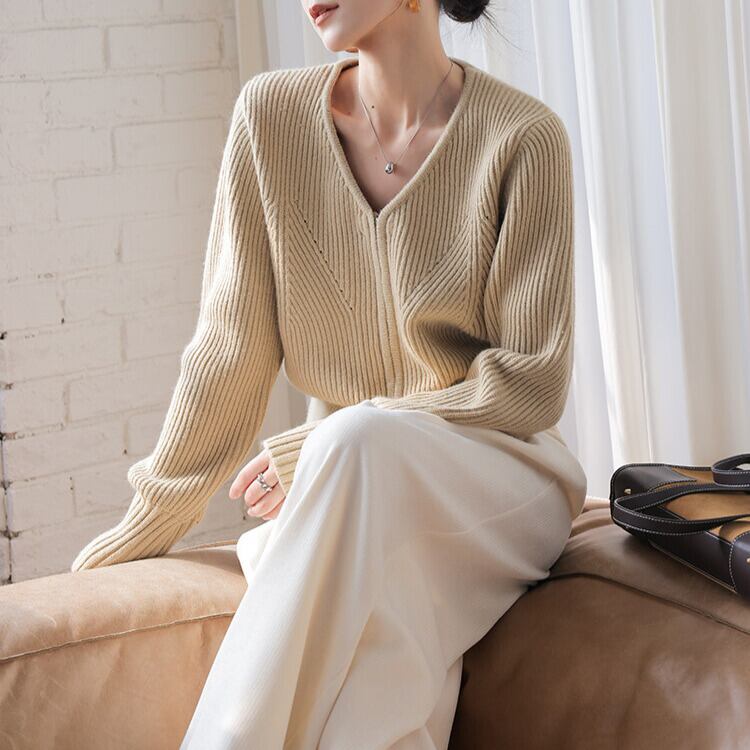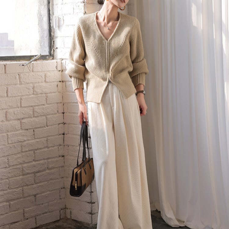 Vネックがデコルテを美しく見せてくれるニットカーディガン。