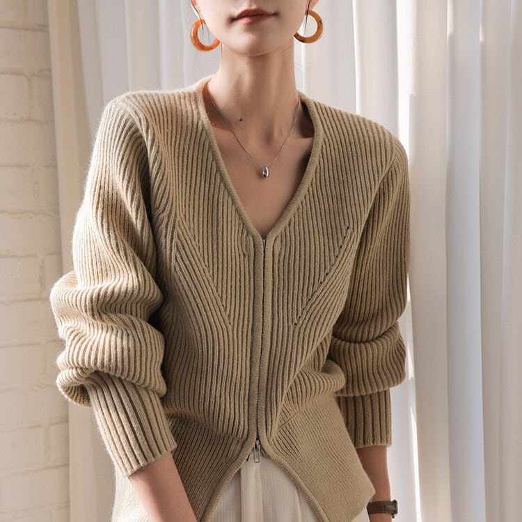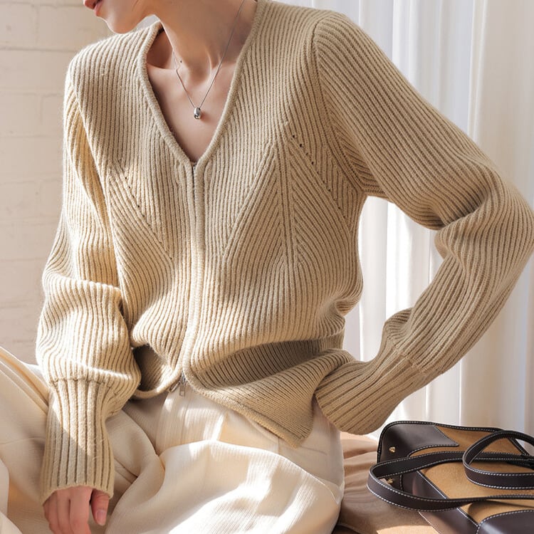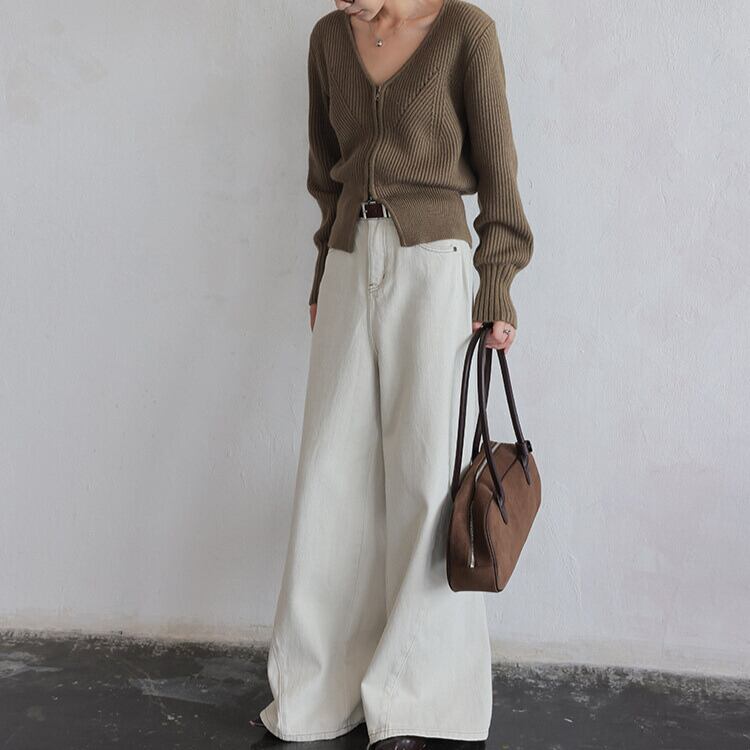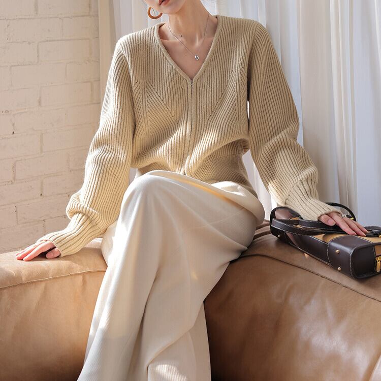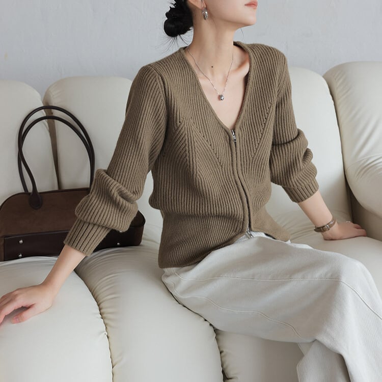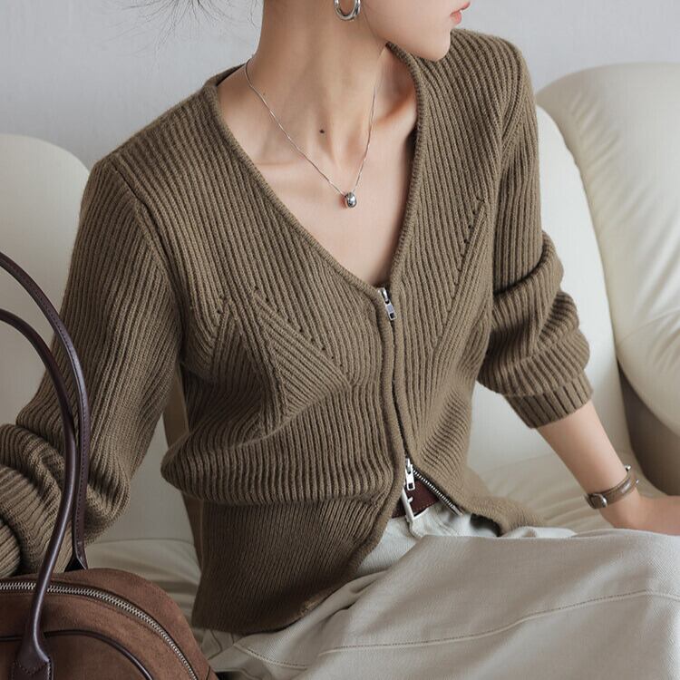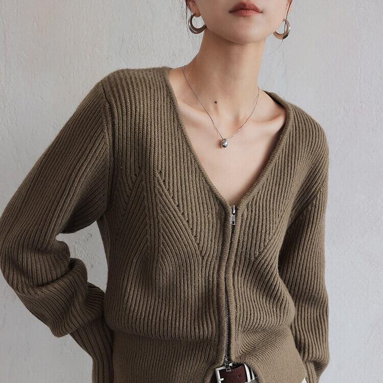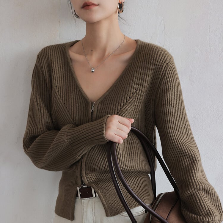 フロントジップ Vネック ニットカーディガン 2col H11128