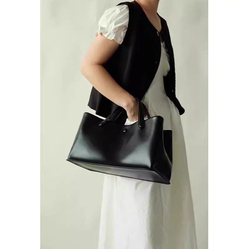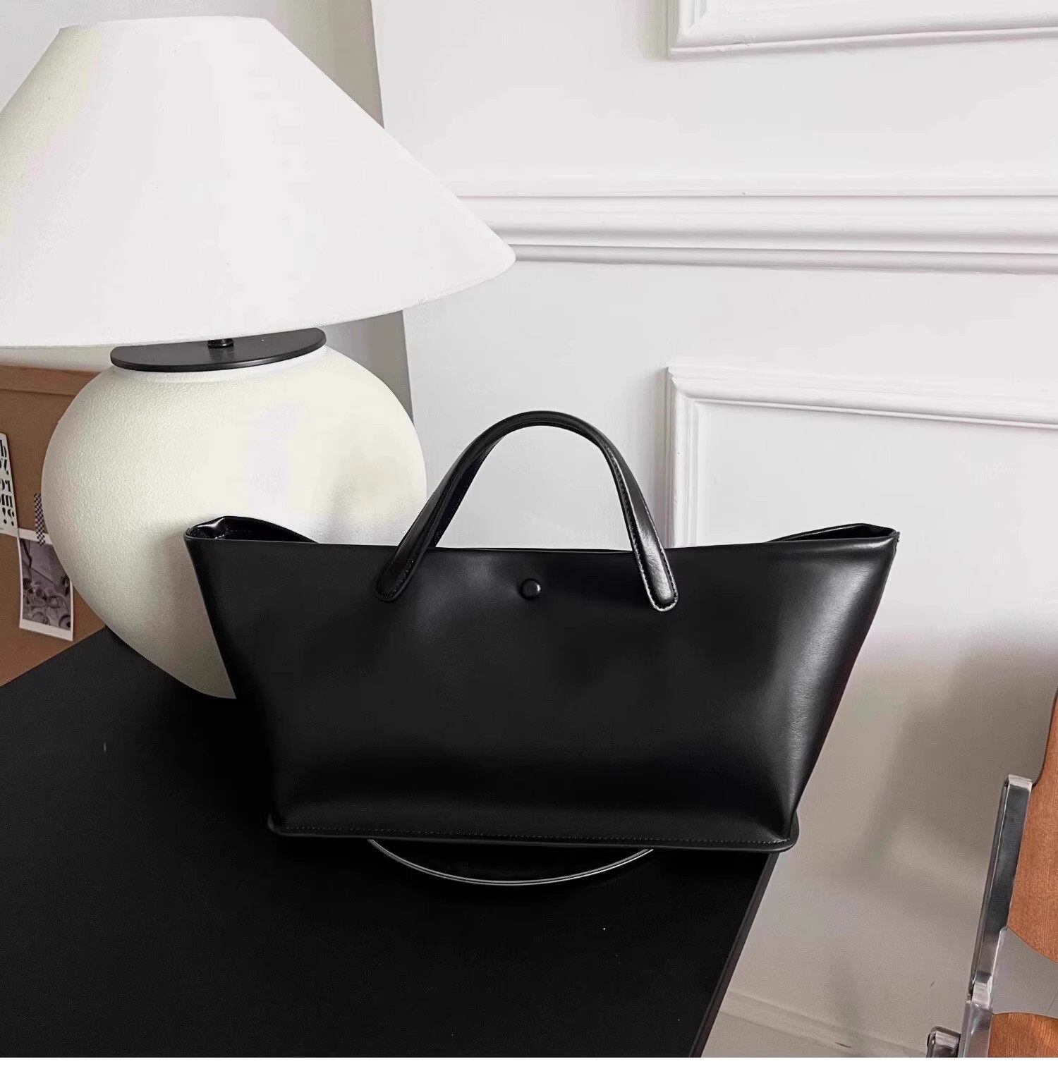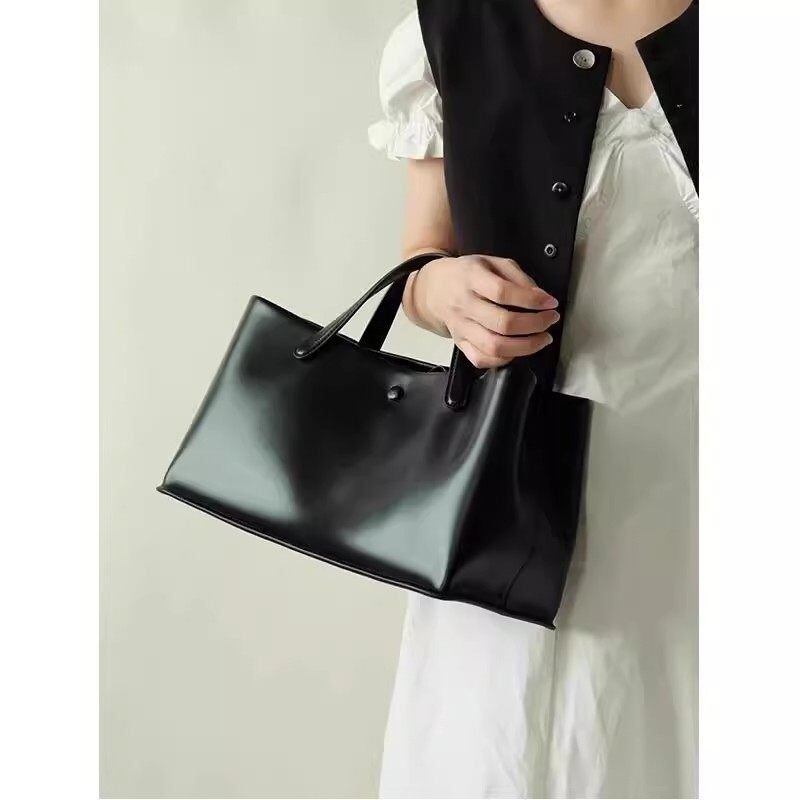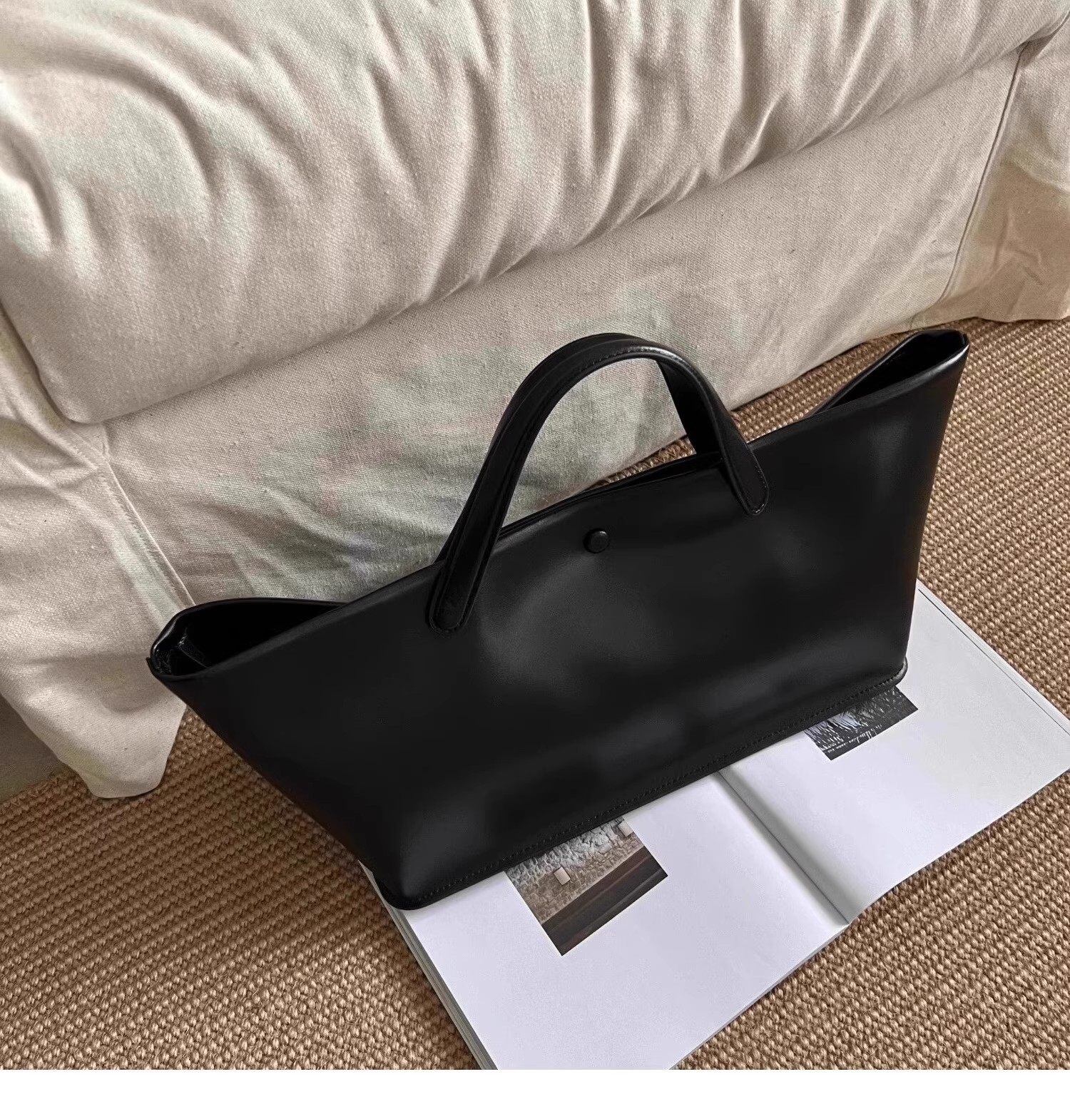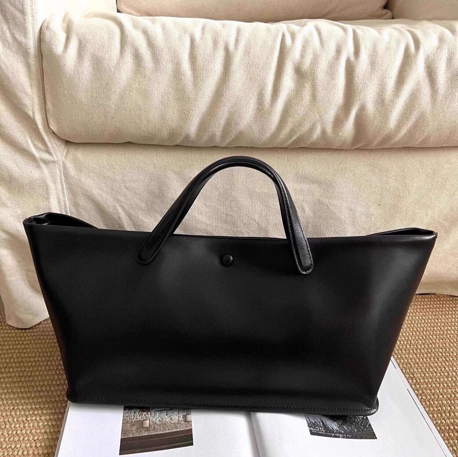 シンプルなデザインで、洗練された印象を与えるスクエアトートバッグ。