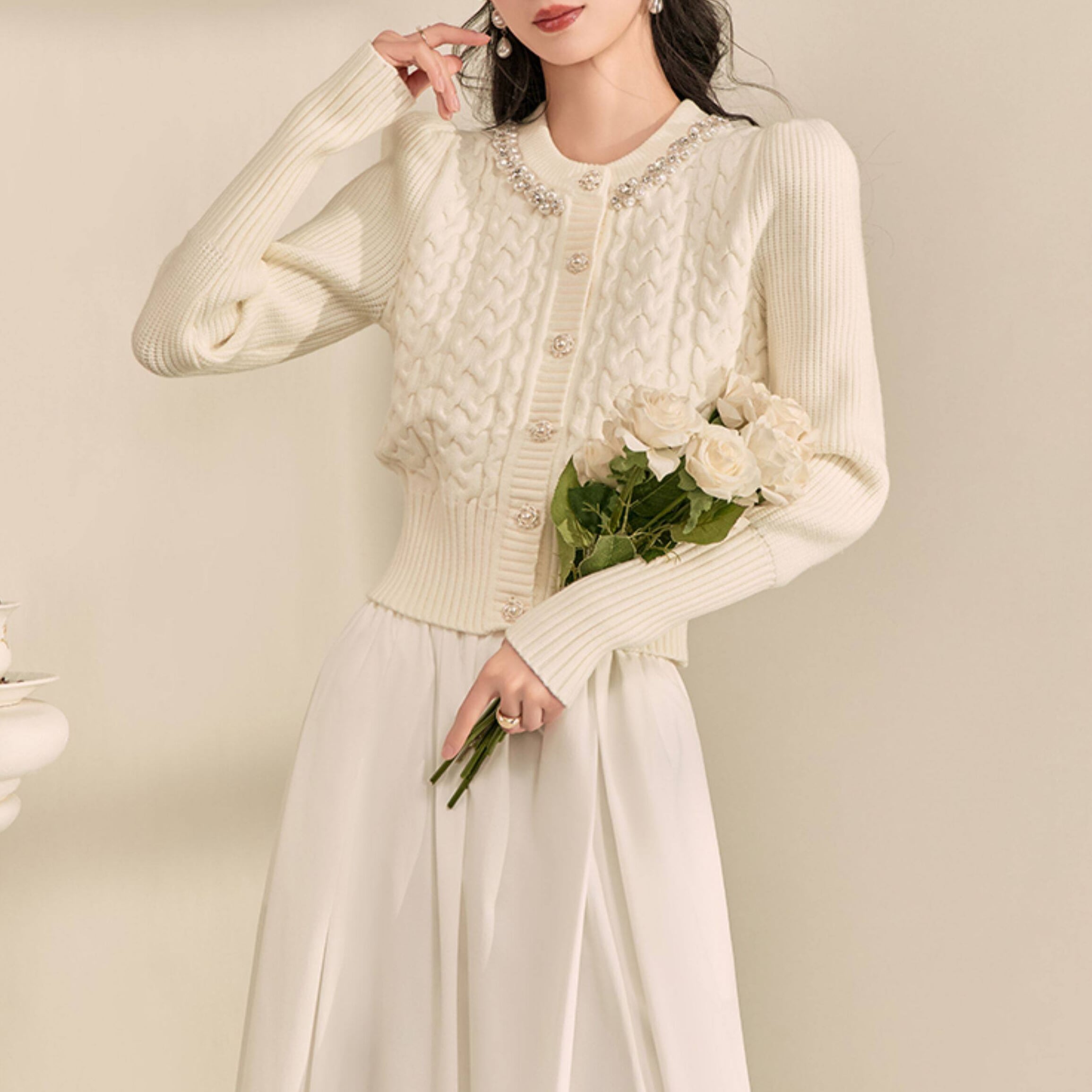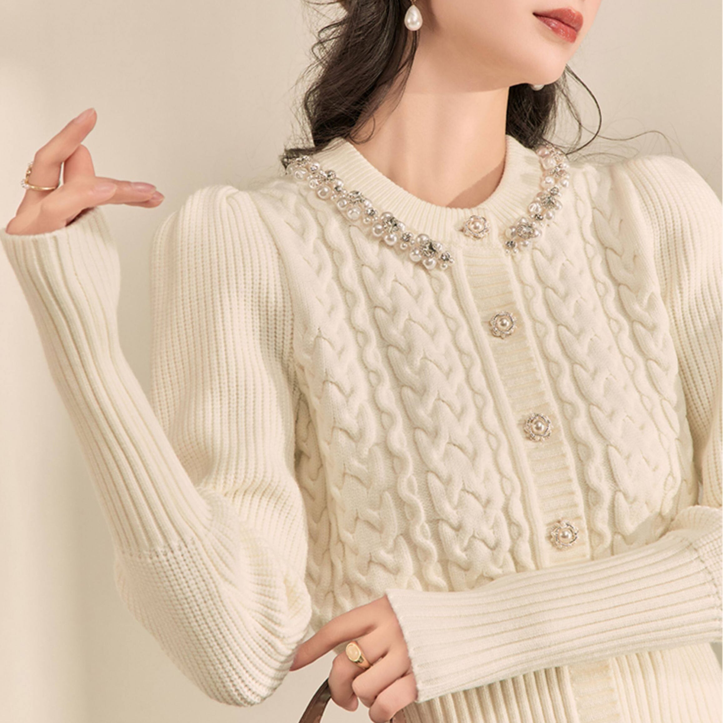 首元のパールトリムが上品な印象をプラスし、アクセサリー要らずで華やかな着こなしが叶います。