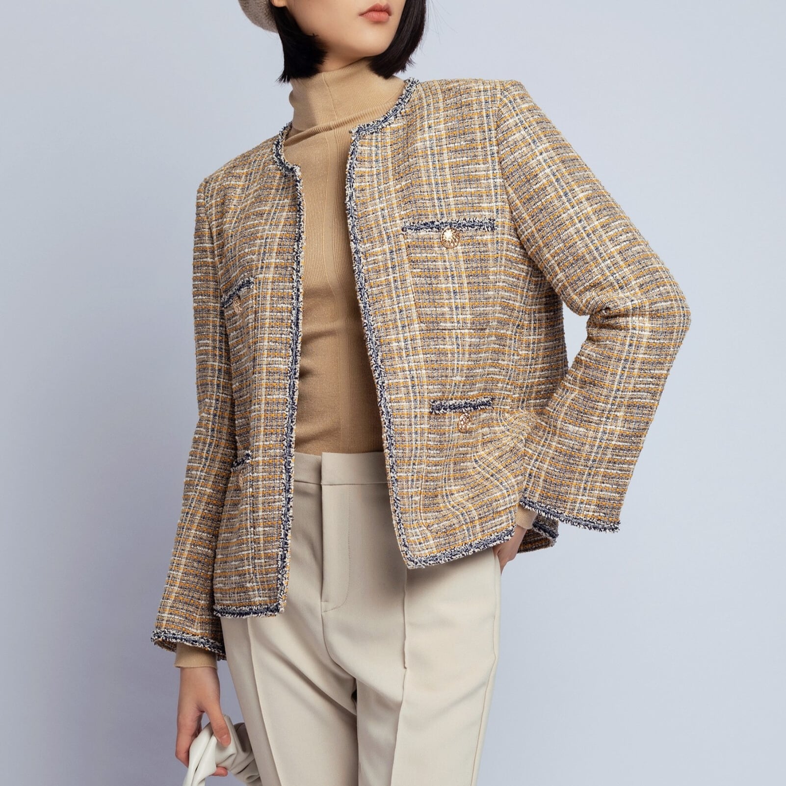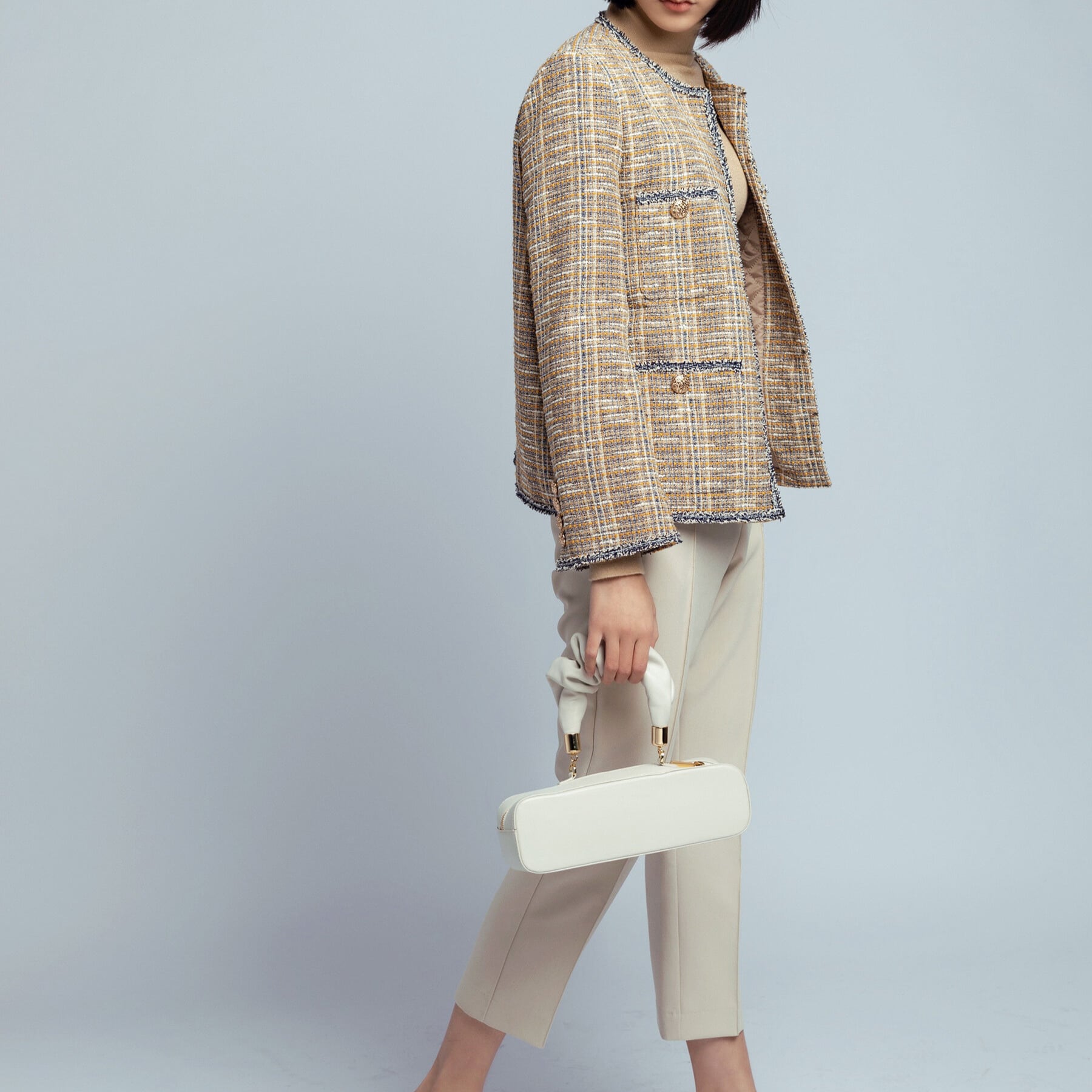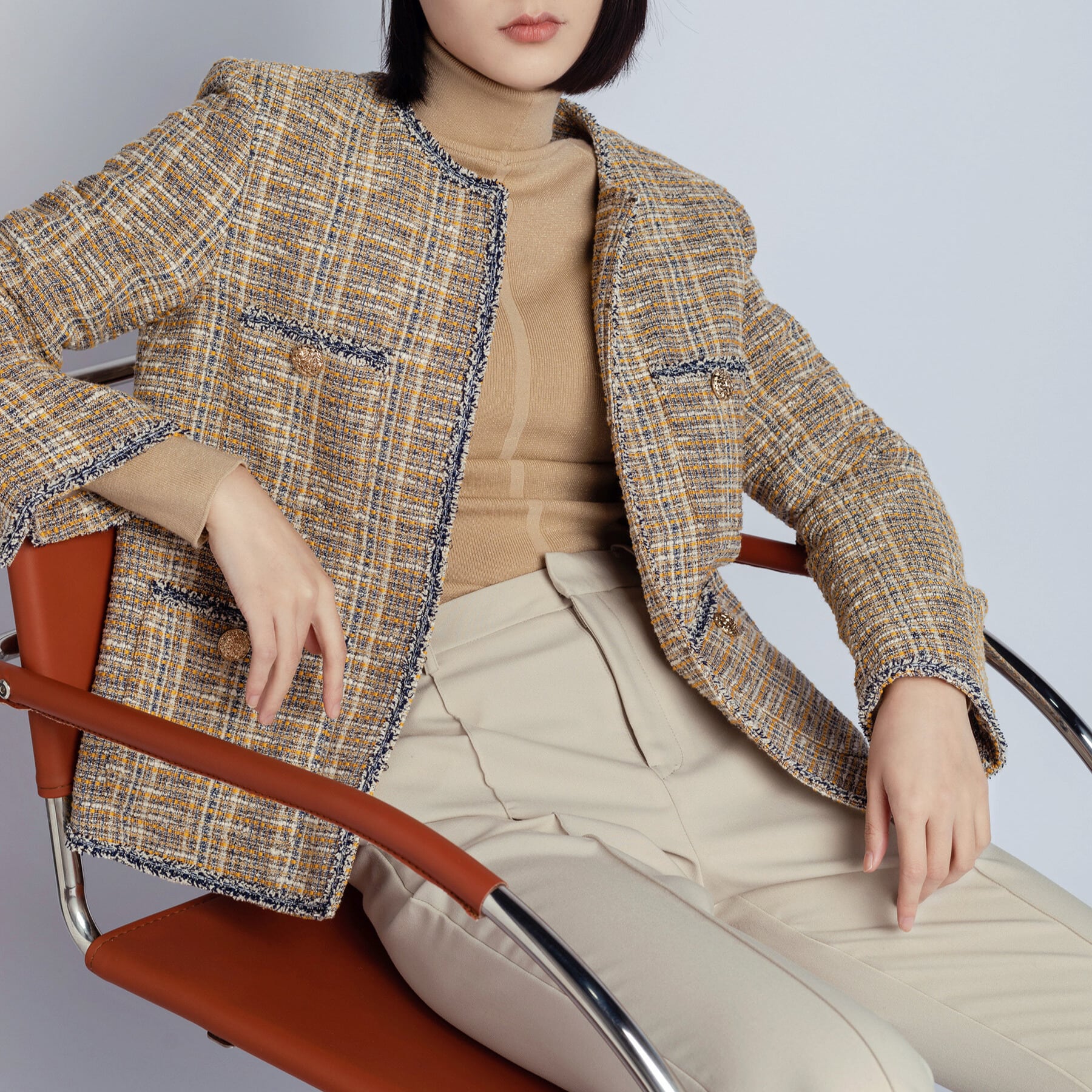 ノーカラーのデザインが、顔周りをすっきりと見せてくれます。