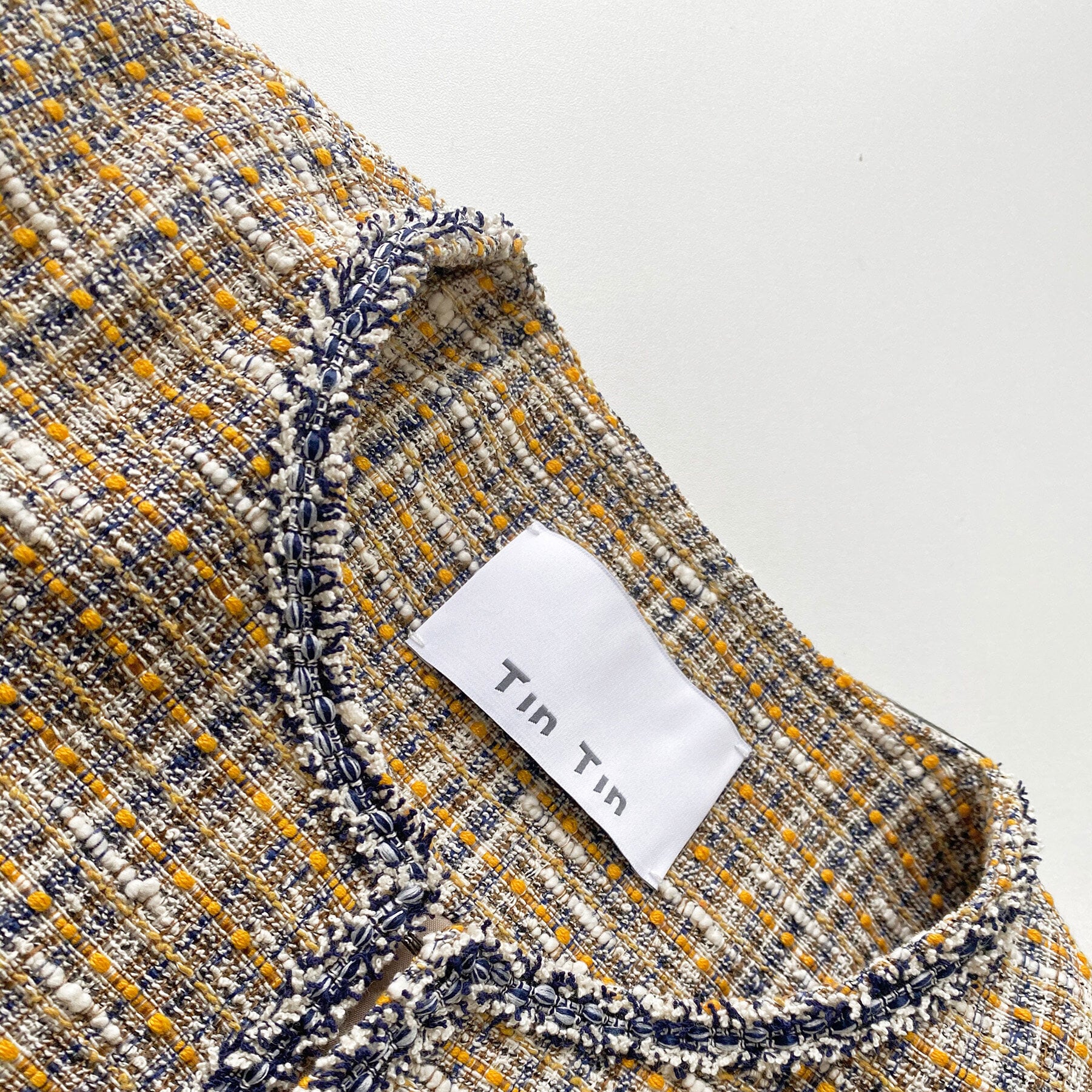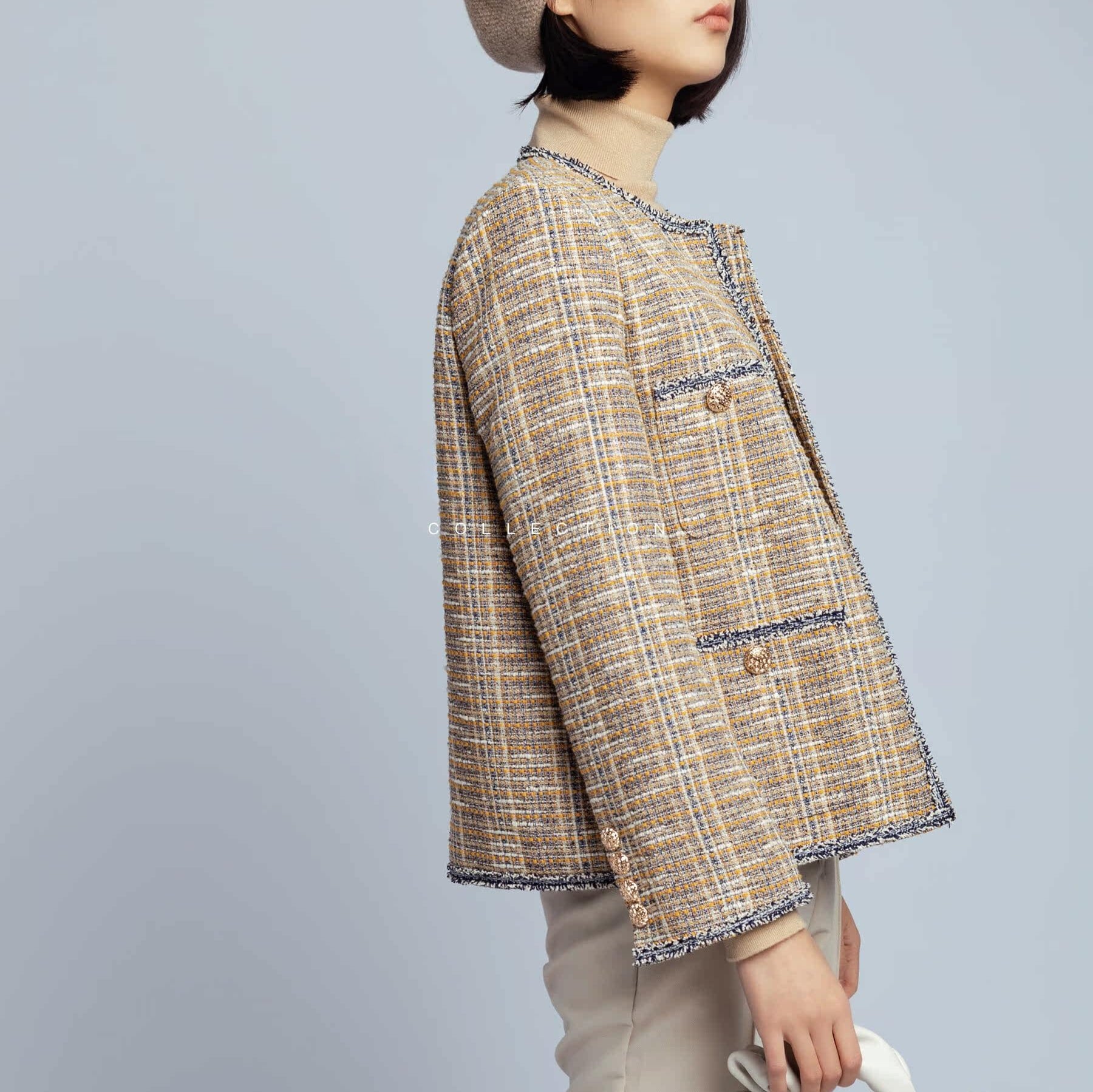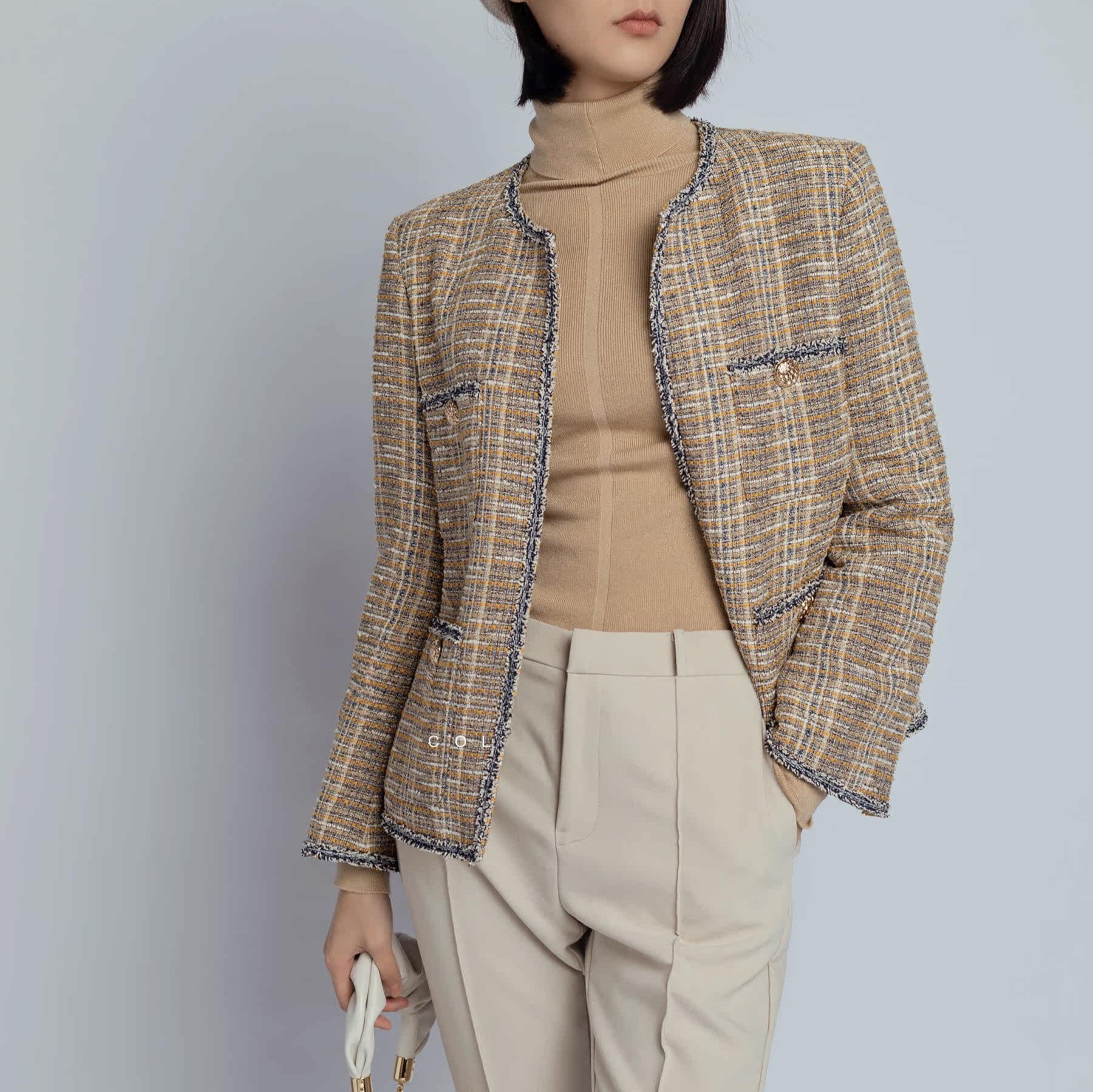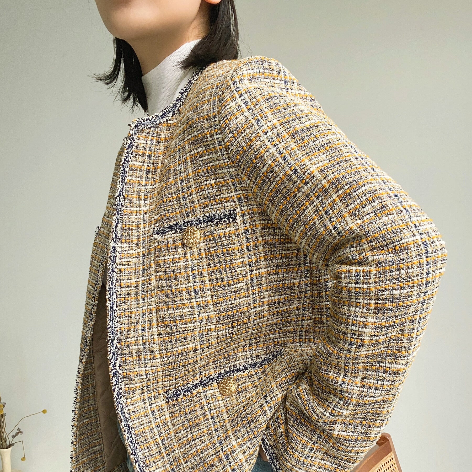 ノーカラーのデザインが、顔周りをすっきりと見せてくれます。