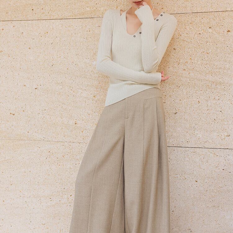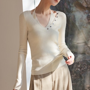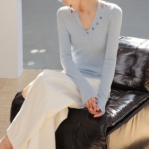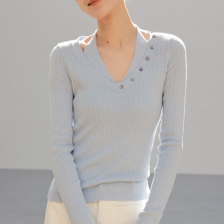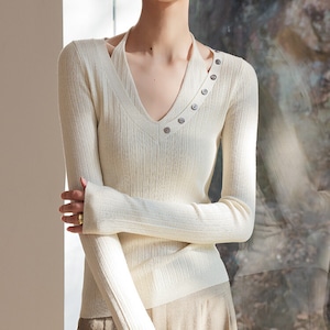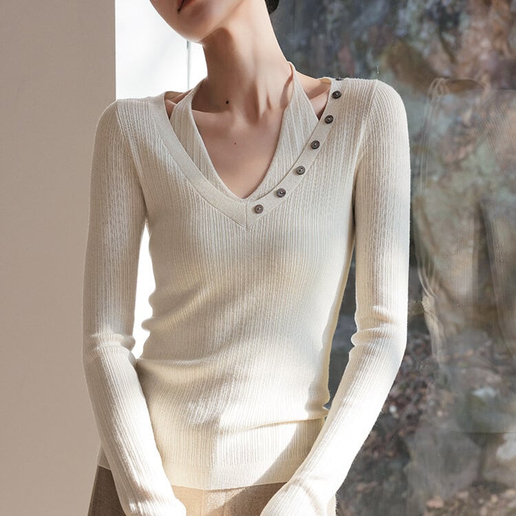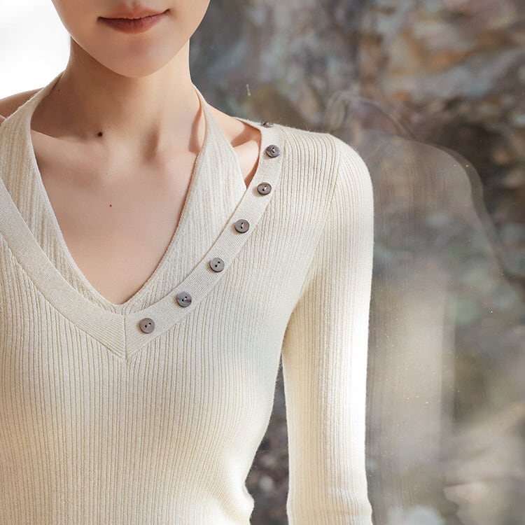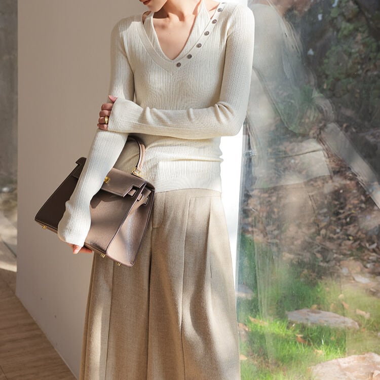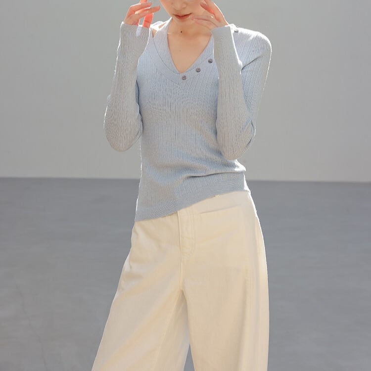 Vネックに並んだボタンが、上品なアクセントをプラスします。