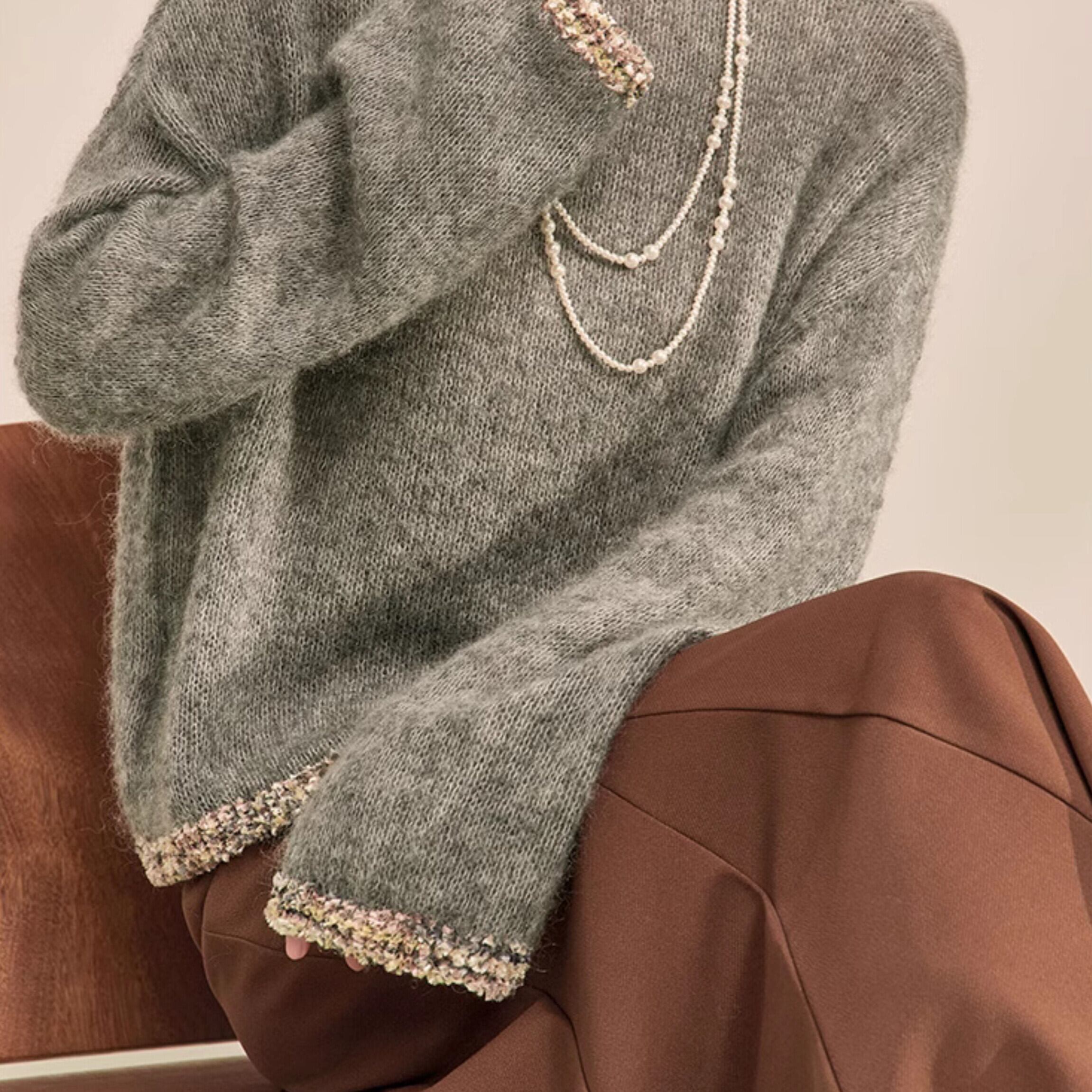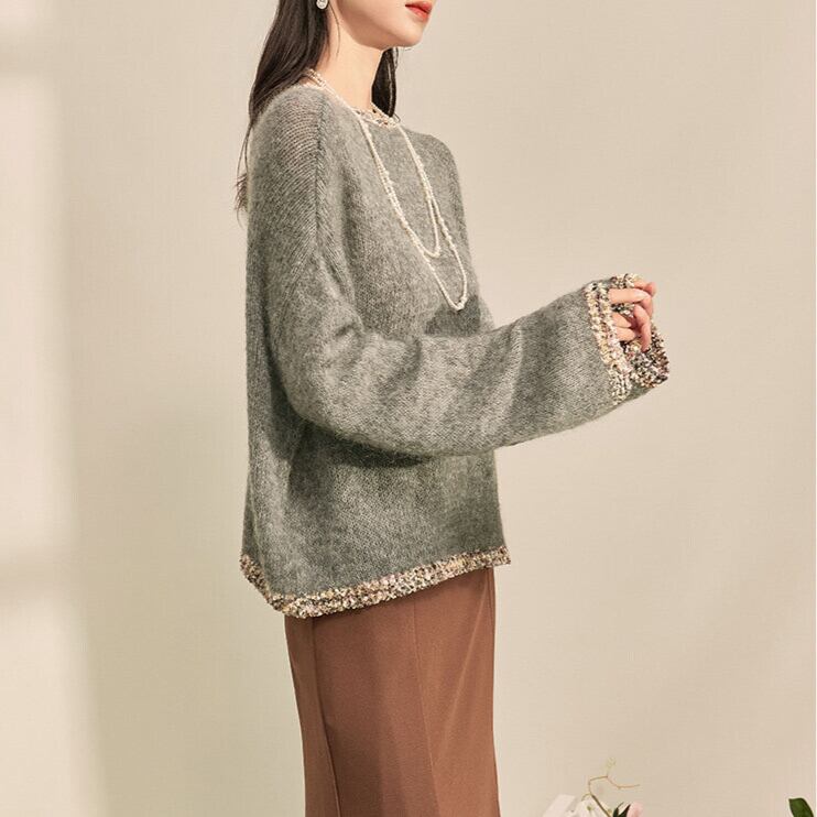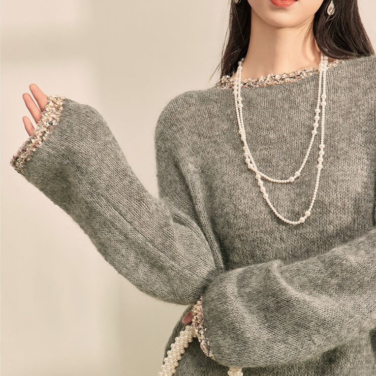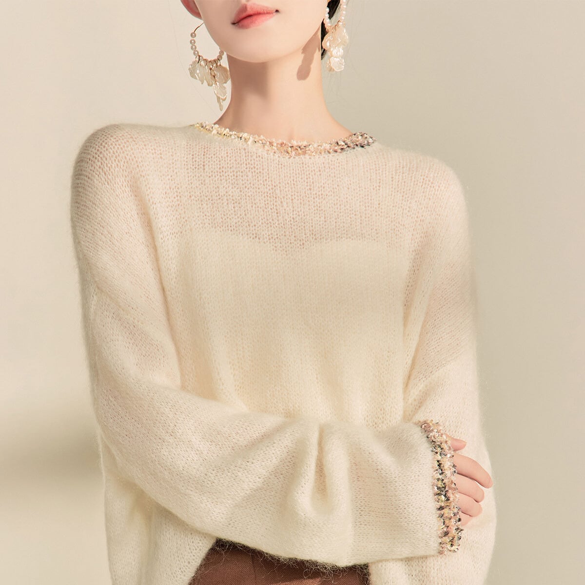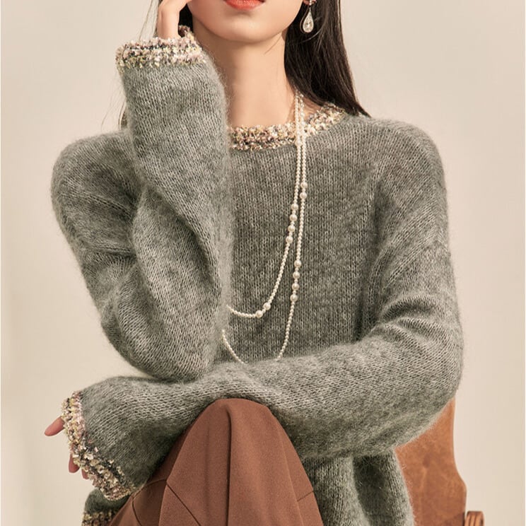 首元と袖口、裾にあしらわれたスパンコールトリムが、さりげない華やかさをプラスするニットプルオーバー。