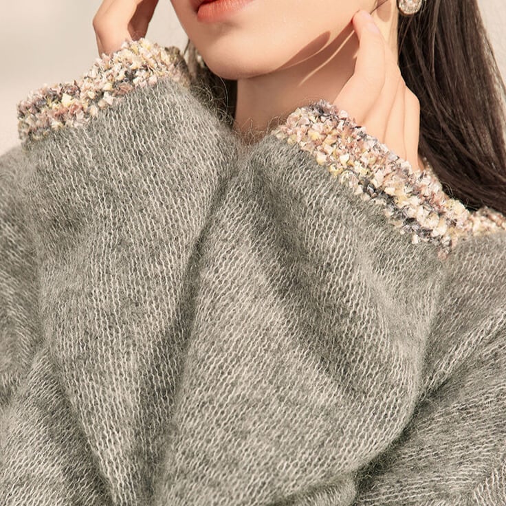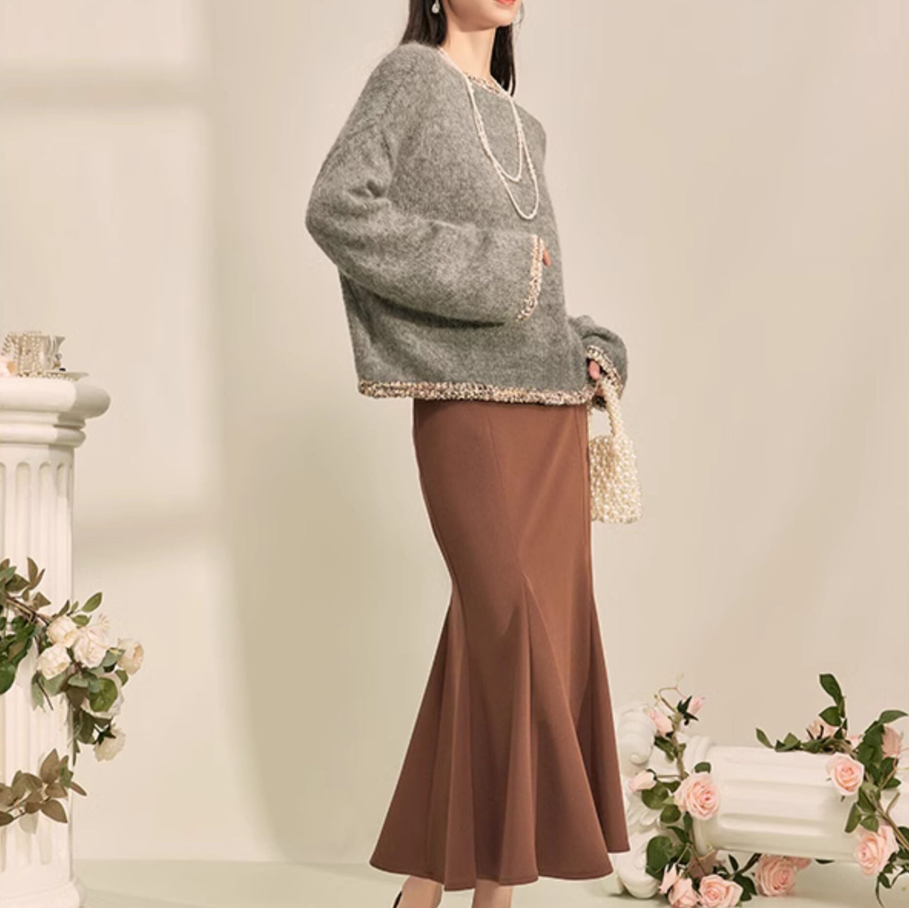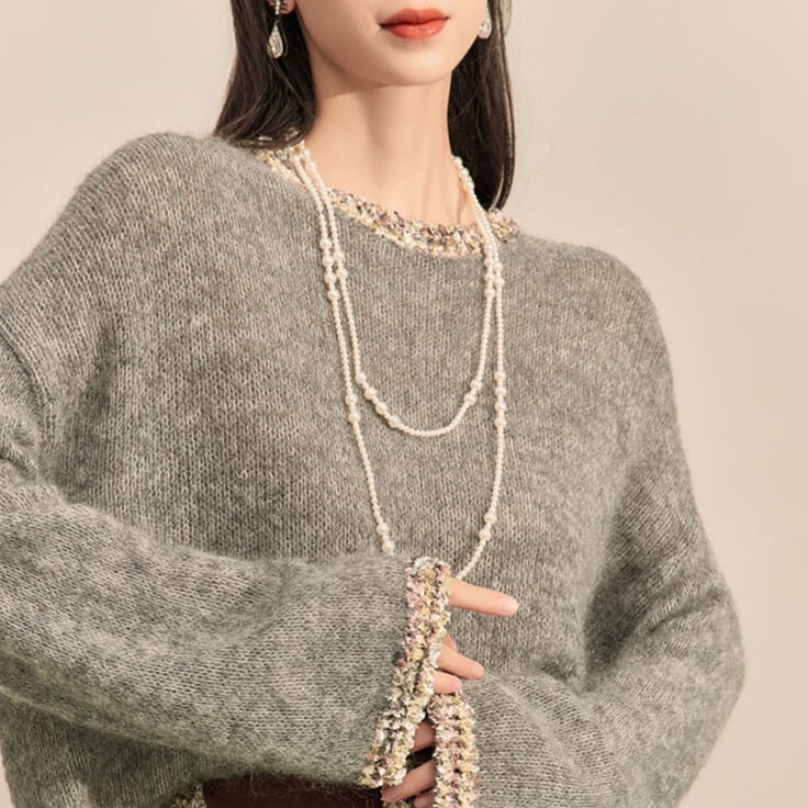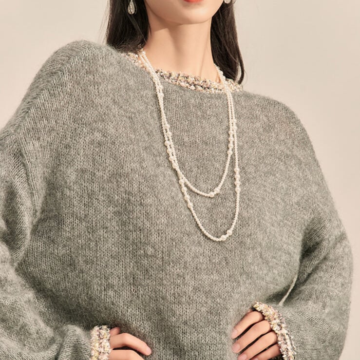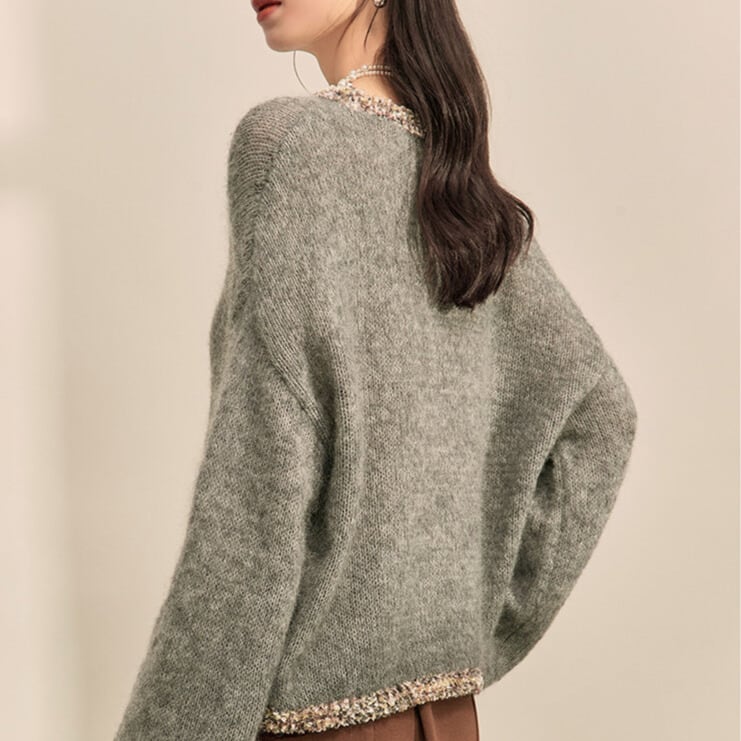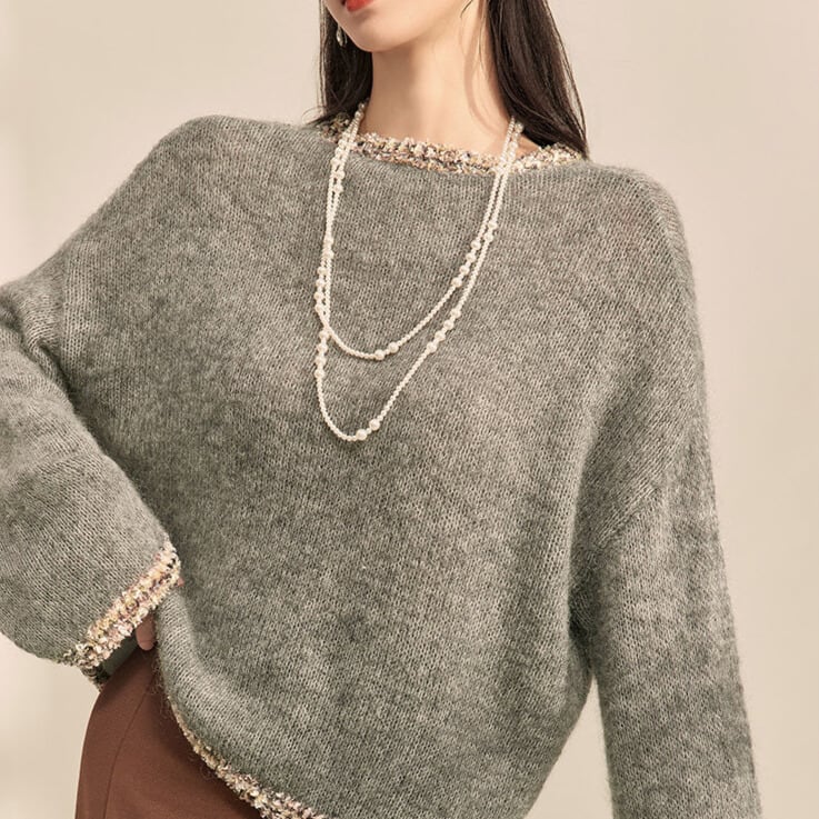 首元と袖口、裾にあしらわれたスパンコールトリムが、さりげない華やかさをプラスするニットプルオーバー。